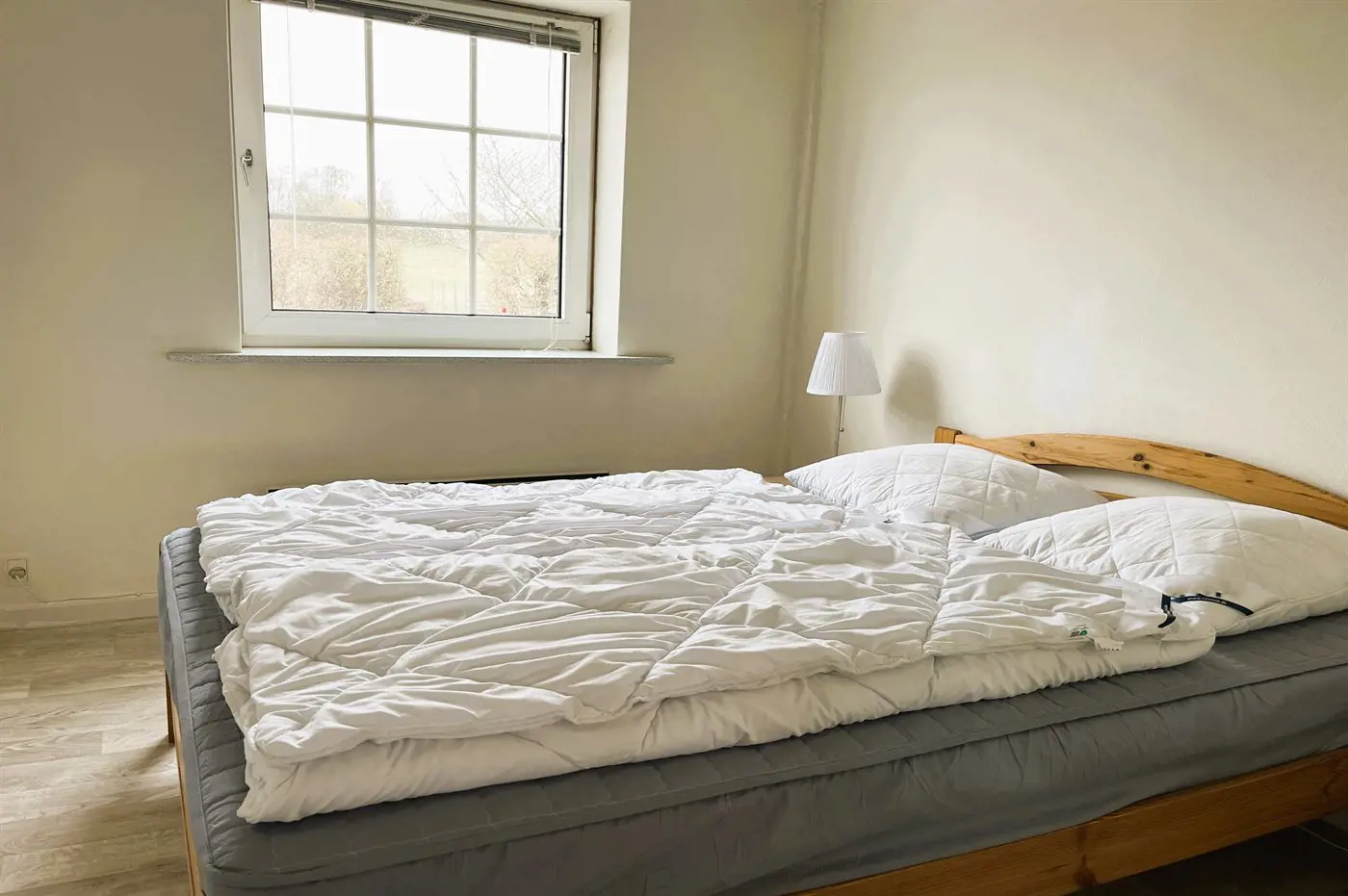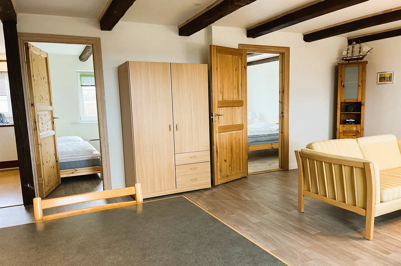 Die Schlafplätze verteilen sich auf 2 Schlafräume. 2 Schlafplätze in einem Doppelbett. 2 Schlafplätze in Einzelbetten. Ferner steht ein Kinderbett zur Verfügung.