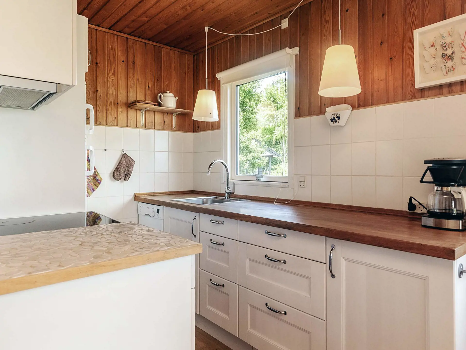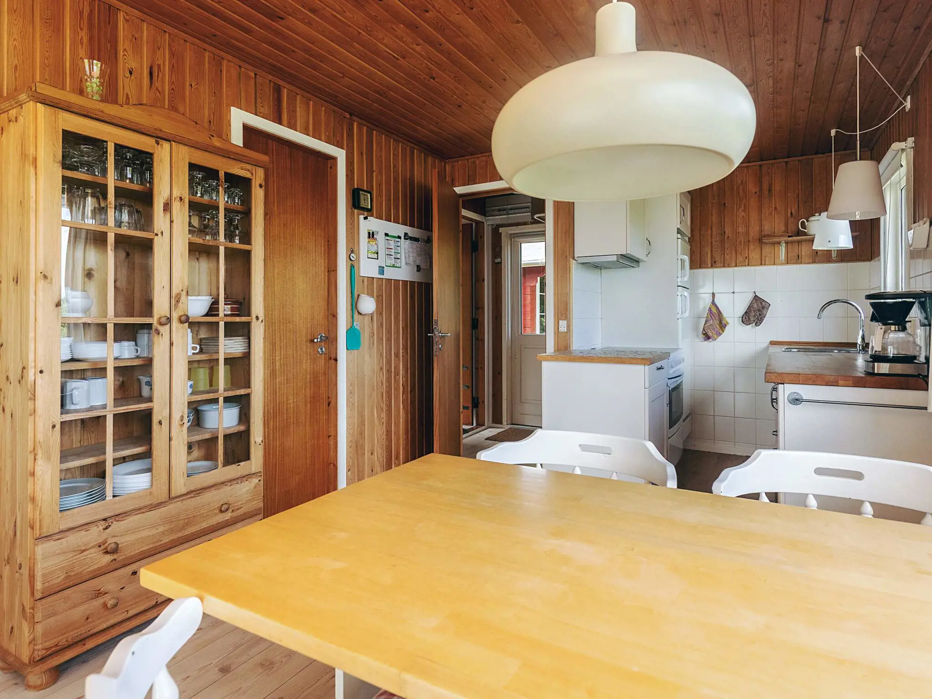 Das Ferienhaus bietet einen hellen, offenen Küchen-/Wohnbereich für das Familienleben, inklusive Holzofen und direktem Zugang zur Terrasse davor. Zur technischen Ausstattung gehören freies WLAN, Flachbild-TV und eine digitale Satellitenschüssel mit internationalen Sendern zur Auswahl. Die Küchenausstattung ist ausgestattet mit u.a. Ceranfeld, Mikrowelle und Geschirrspüler. Außerdem zwei Schlafzimmer und helles WC mit einfacher Handbrause im Haus. Für kleine Urlauber steht ein Hochstuhl bereit.