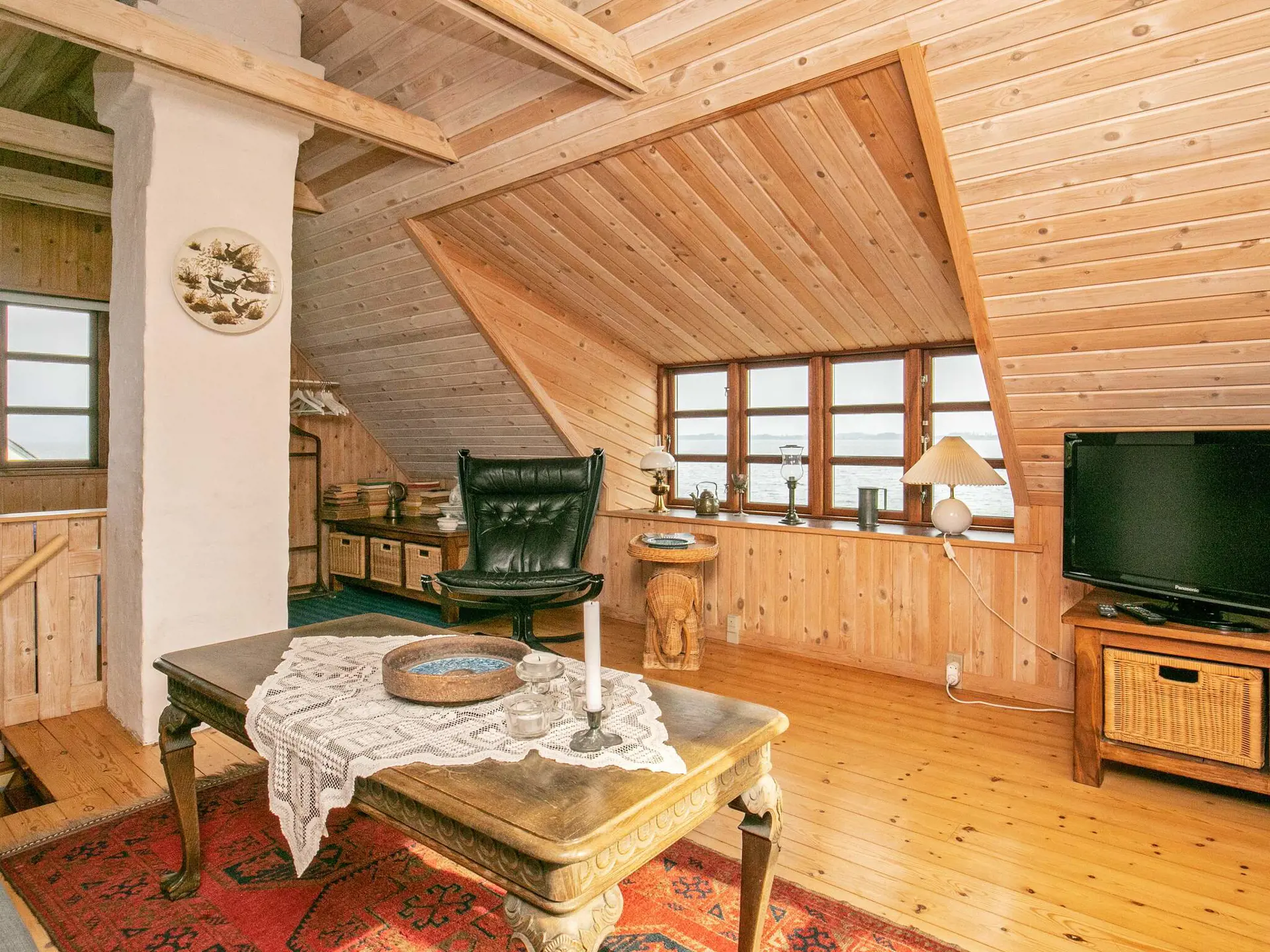 Im Dachgeschoss findet man einen offenen Aufenthaltsbereich mit besonders schönem Meerblick! Neben dem Treppenaufgang steht an der einen Seite ein Doppelbett (siehe Foto), sodass die 1. Etage sowohl als Schlafzimmer als auch als Wohnzimmer dient.