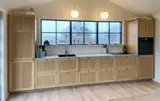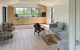 Machen Sie es sich auf der gemütlichen Sofalandschaft bequem. Die warmen Naturmaterialien und die liebevollen Details an den Wänden schaffen ein harmonisches, wohnliches Ambiente. Nutzen Sie die gemütlichen Sessel für eine Lesepause oder entspannte Gespräche. Bereiten Sie Ihre Mahlzeiten in der modernen, offenen Küche zu und genießen Sie dabei den Blick in den Garten durch die großen Fenster. Öffnen Sie die Terrassentüren und lassen Sie frische Luft in den Raum.