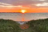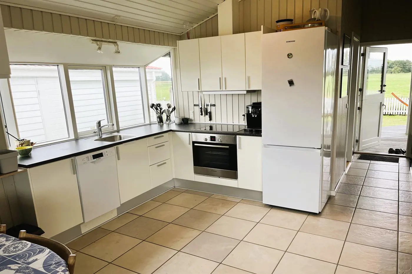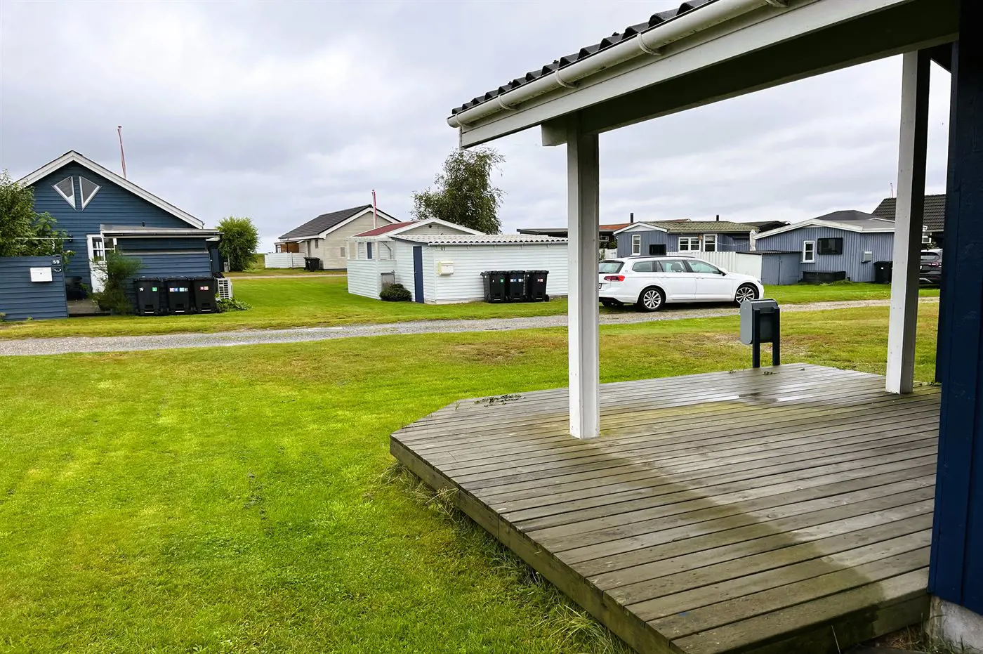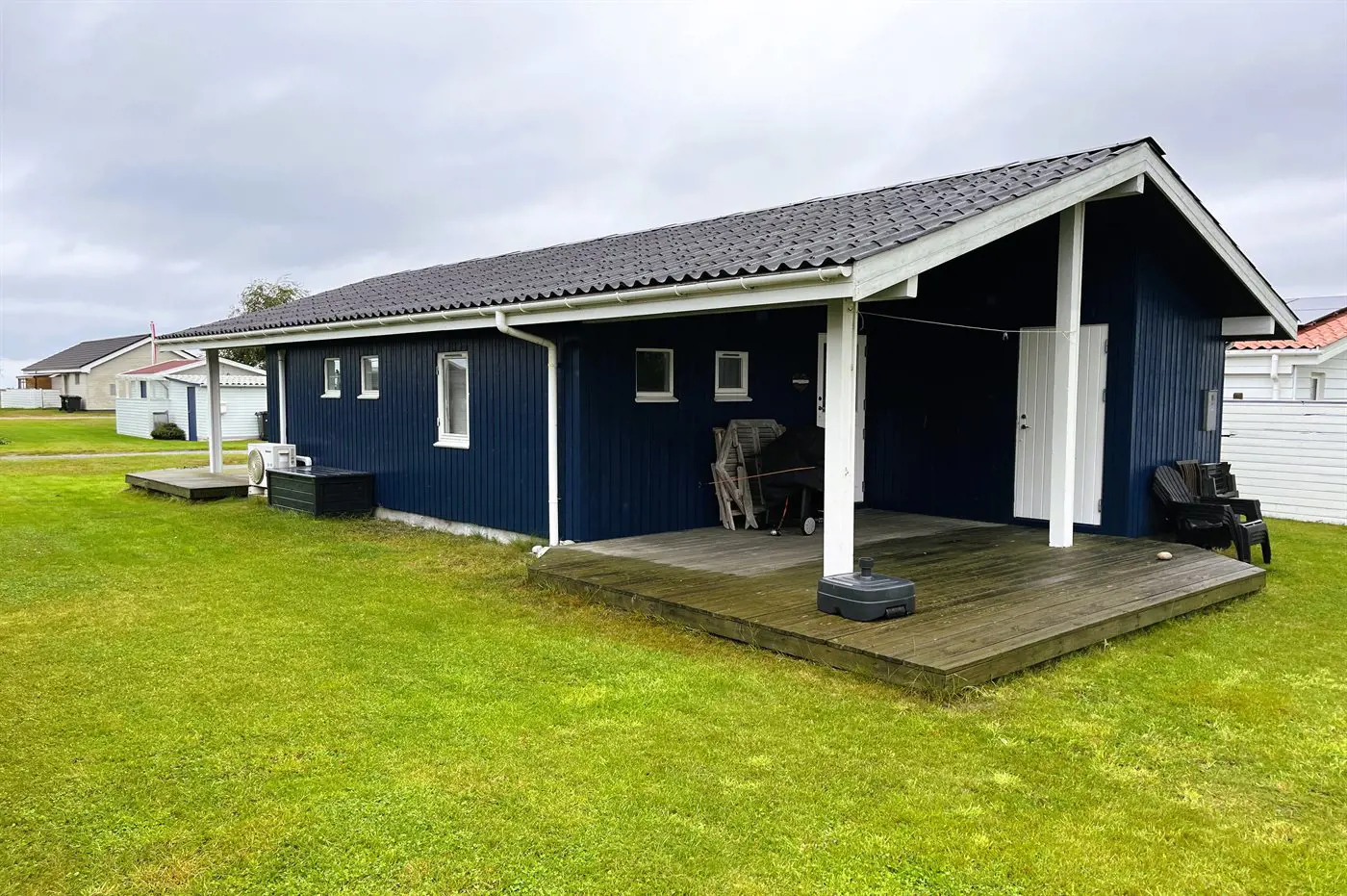 Das Haus liegt in der dritten Reihe, aber dennoch nah am Wasser. Von der ungestörten, nach Südwesten ausgerichteten Terrasse hinter dem Haus habt ihr Blick auf offene Felder. Vor und hinter dem Haus gibt es überdachte Terrassen.