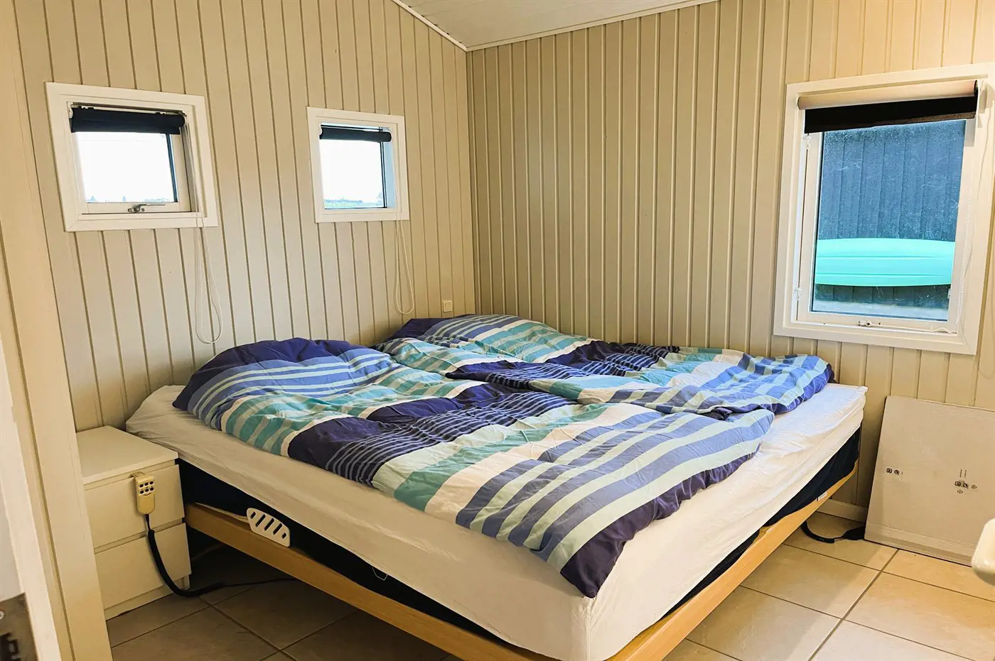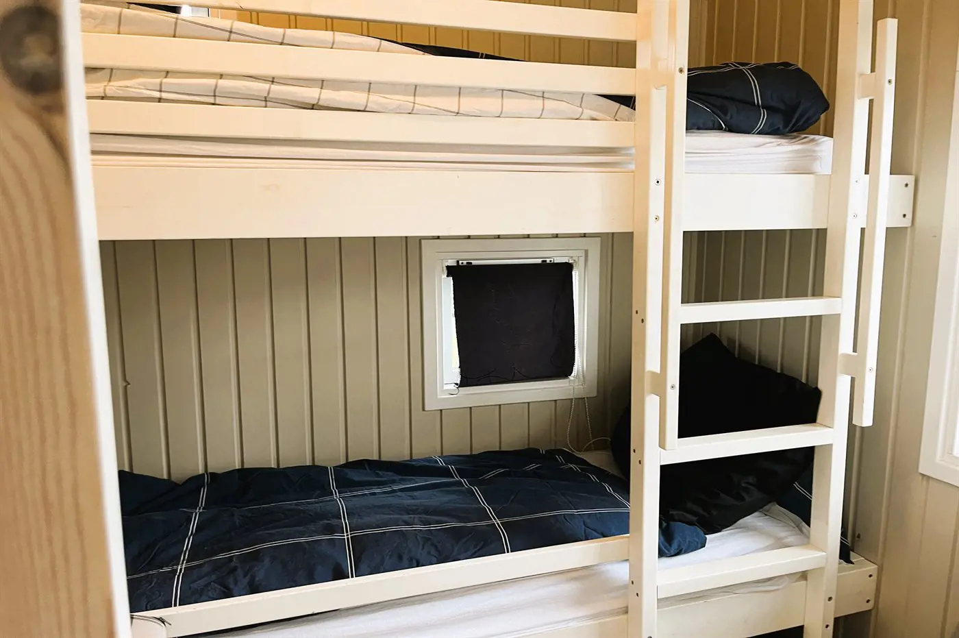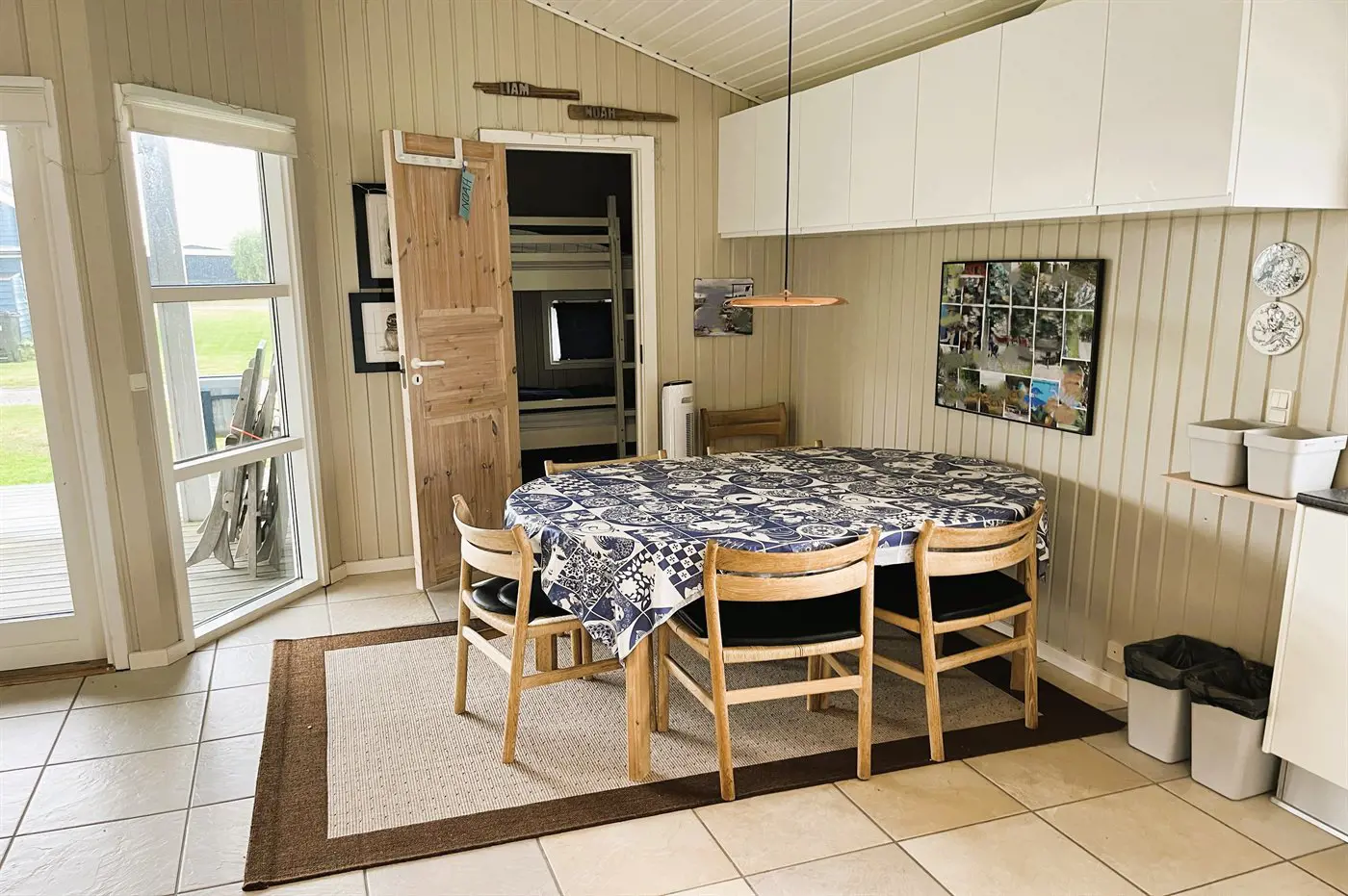 Die Schlafplätze verteilen sich auf 2 Schlafräume. 2 Schlafplätze in einem Doppelbett. 2 Schlafplätze in einem Etagenbett. Ferner steht ein Kinderbett zur Verfügung.