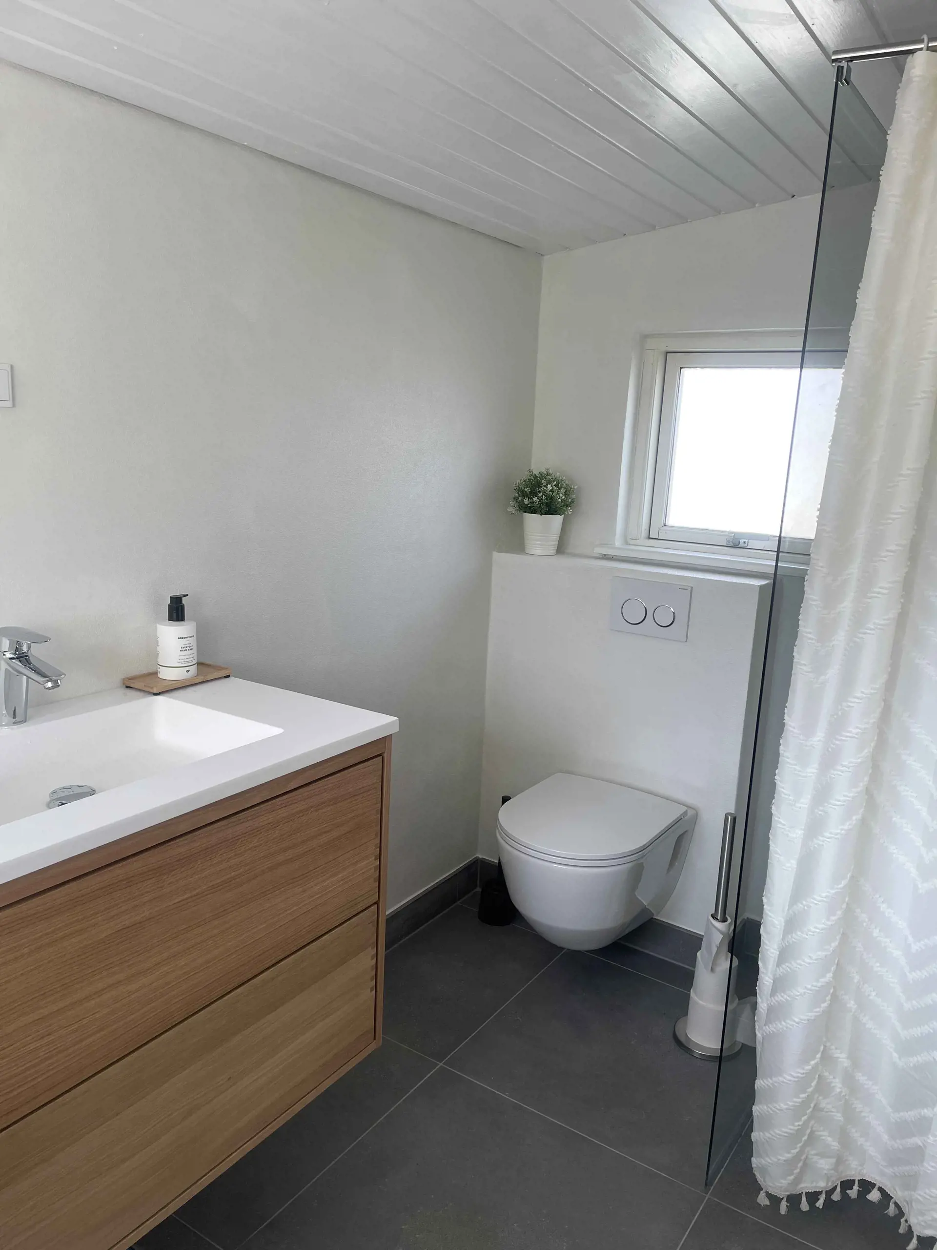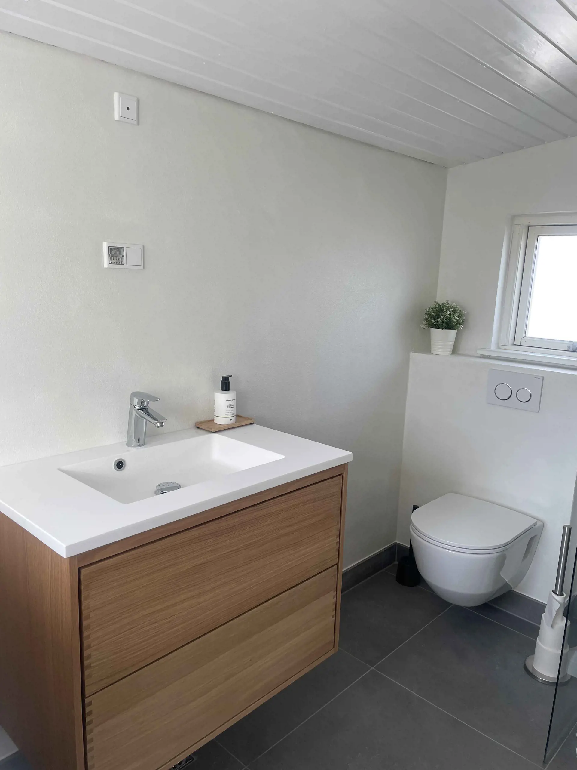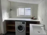Das Badezimmer ist hell und renoviert und verfügt über eine Dusche und ein WC. Es gibt eine Waschmaschine.