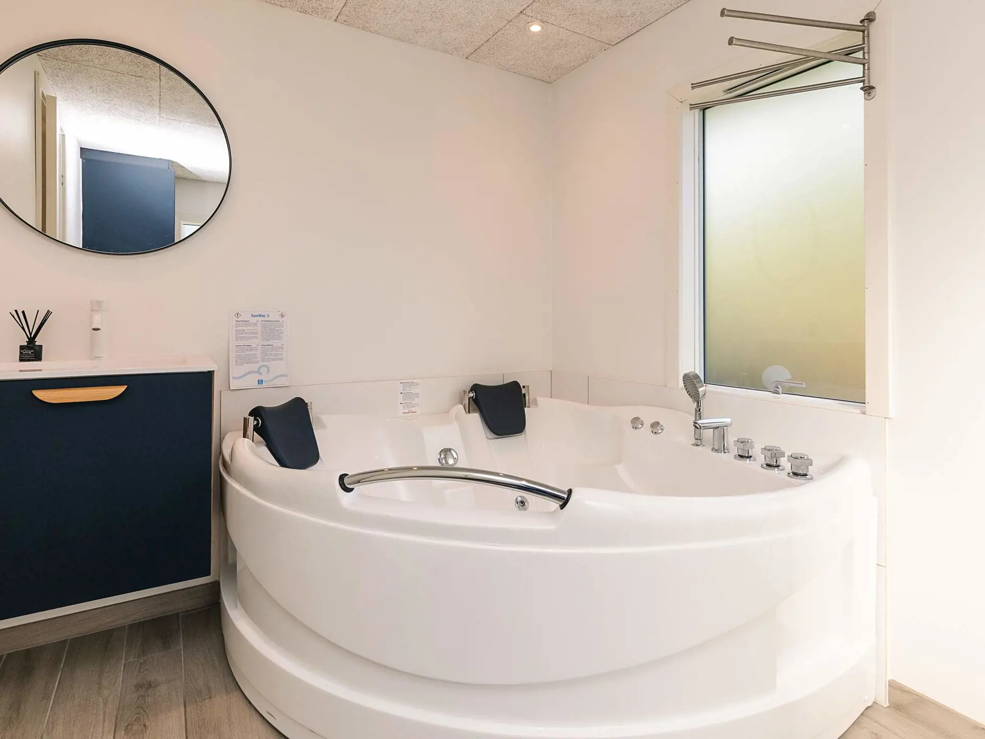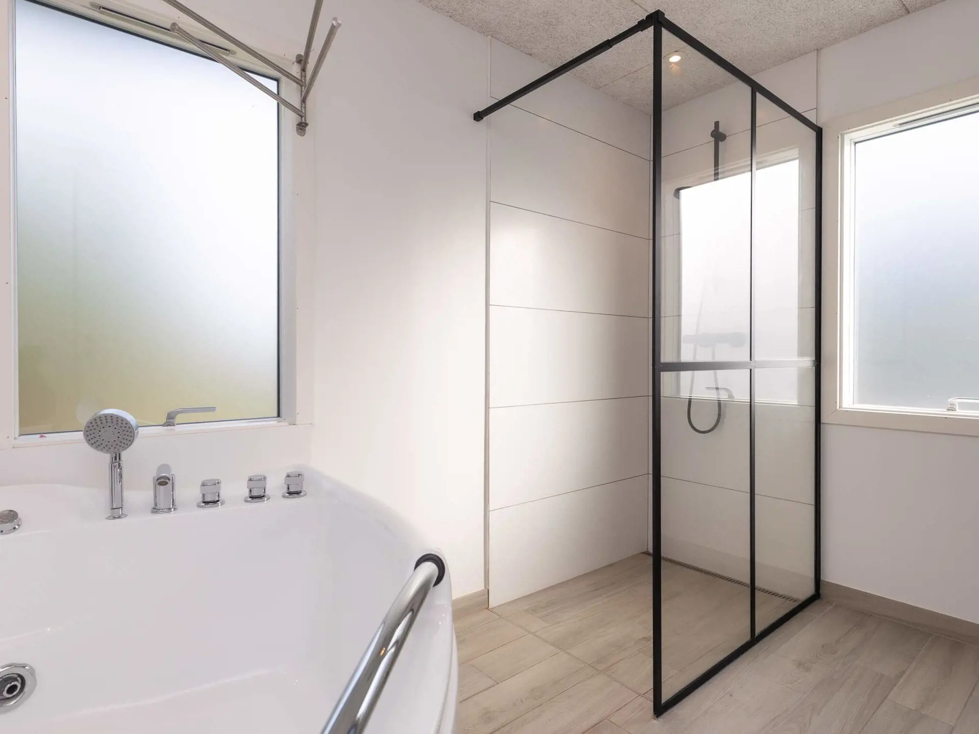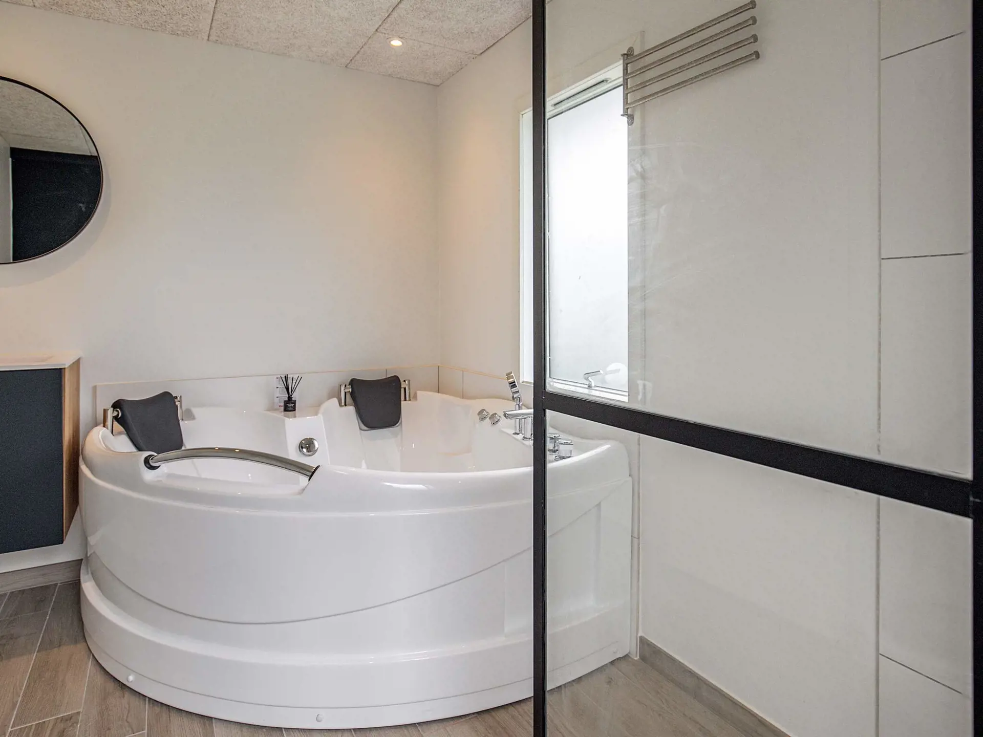 Das Haus verfügt über drei Schlafzimmer für bis zu acht Gäste sowie ein gut ausgestattetes Badezimmer mit Dusche und Innenwhirlpool für zusätzlichen Luxus. Draußen umgibt das Haus ein großzügiges Naturgrundstück mit Gartenmöbeln und einem großen Whirlpool – viel Platz für die ganze Familie. Ob entspannendes Bad unter freiem Himmel oder Faulenzen auf der Terrasse – der Außenbereich ergänzt die Wellness-Einrichtungen des Hauses perfekt.