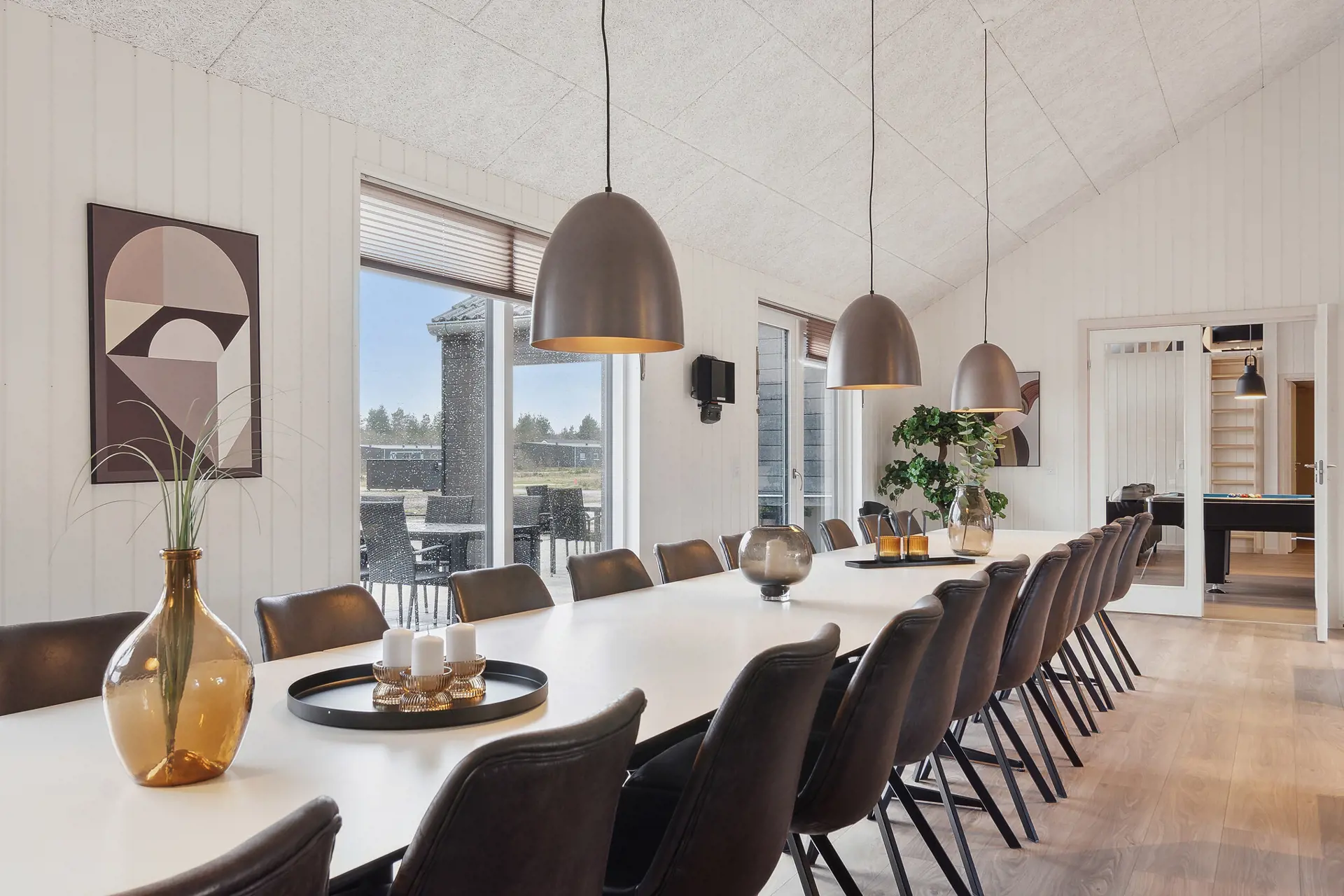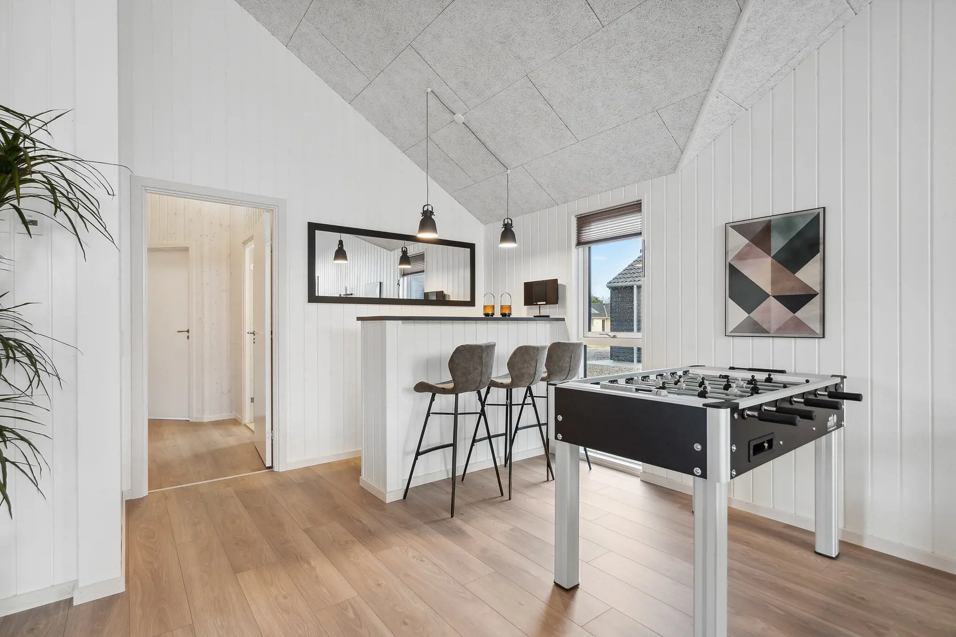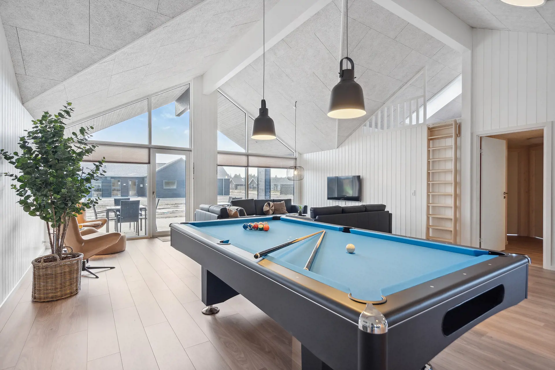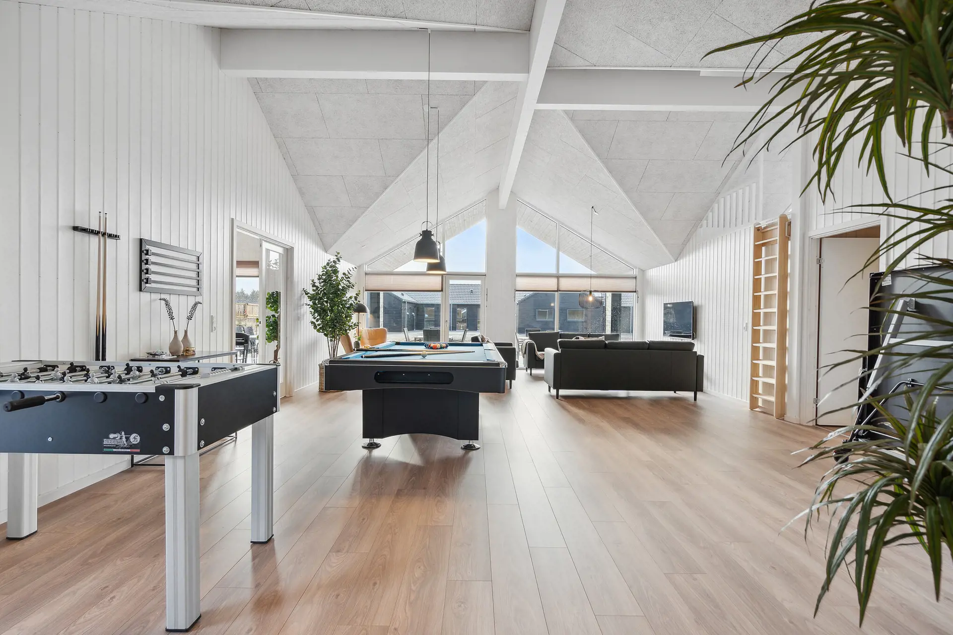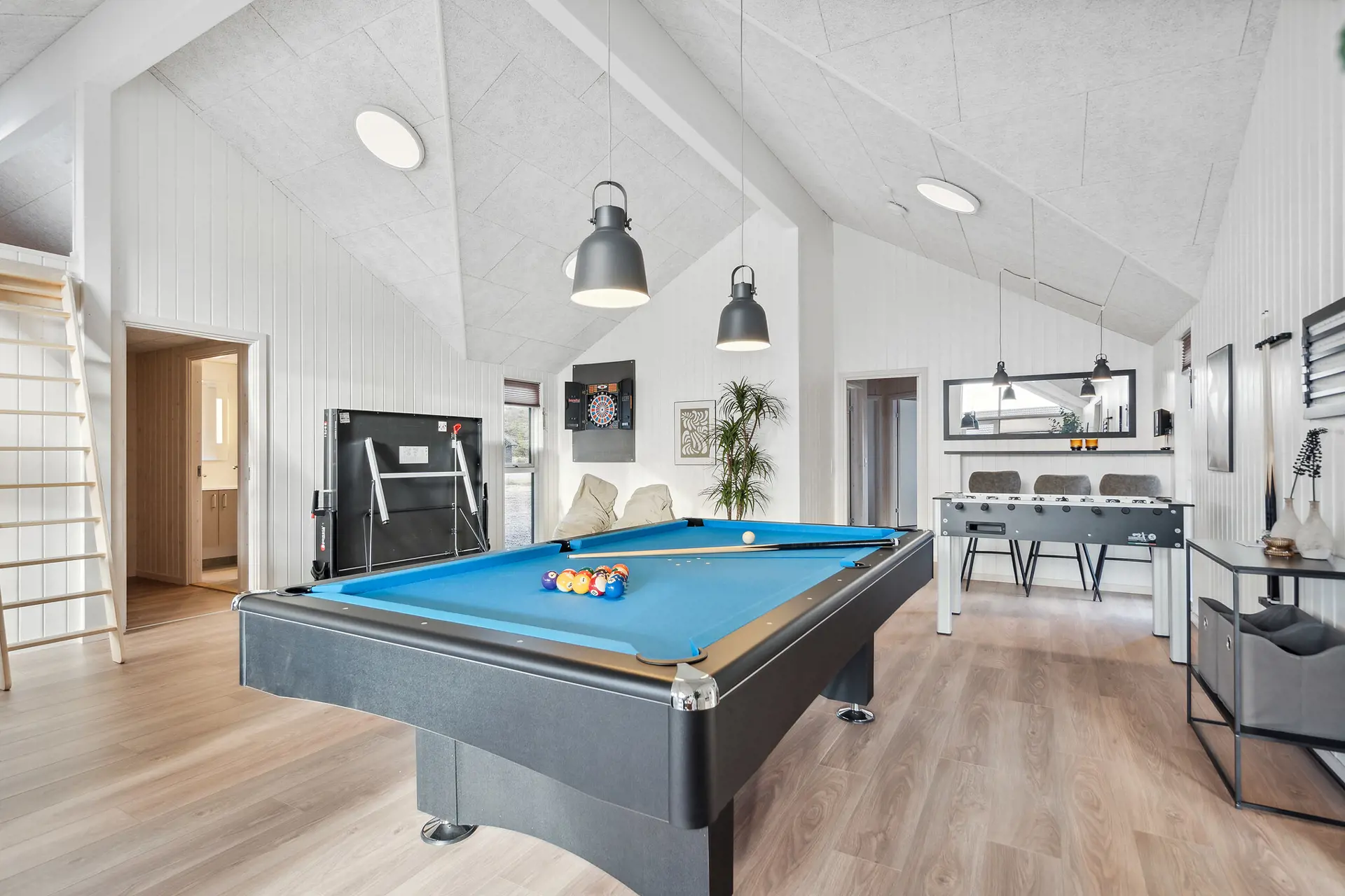 Dieses großzügige Poolhaus auf Fünen bietet Platz für bis zu 20 Personen und ist ideal für große Familien oder Freundesgruppen, die Luxus, Aktivitäten und Entspannung verbinden möchten. Der Poolbereich mit Rutsche, Gegenstromanlage und Platz für Wasserspiele wird schnell zum Mittelpunkt des Hauses. Im Aktivitätsraum sorgen Billard, Tischtennis, Tischfußball, Darts, Bar und Sofaecke für gesellige Stunden. Die große XL-Küche ist perfekt auf Gruppen ausgelegt und geht offen in Ess- und Wohnbereich über, der dank großer Fenster hell und einladend ist. Das Haus verfügt über acht Schlafzimmer, vier Badezimmer und zusätzliche Schlafplätze auf dem Dachboden. Draußen erwartet Sie ein privater Wellnessbereich mit Whirlpool, Sauna und Außendusche sowie Terrasse, Trampolin, Spielplatz und Mehrzweckspielfeld. Der nahegelegene Skåstrup Strand rundet das Urlaubserlebnis ab.