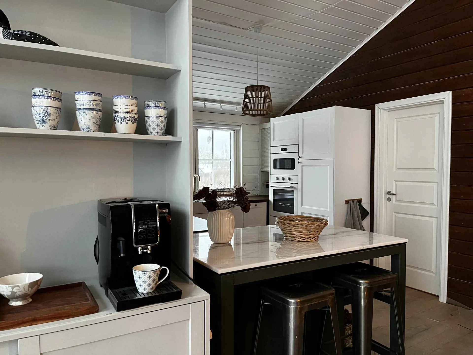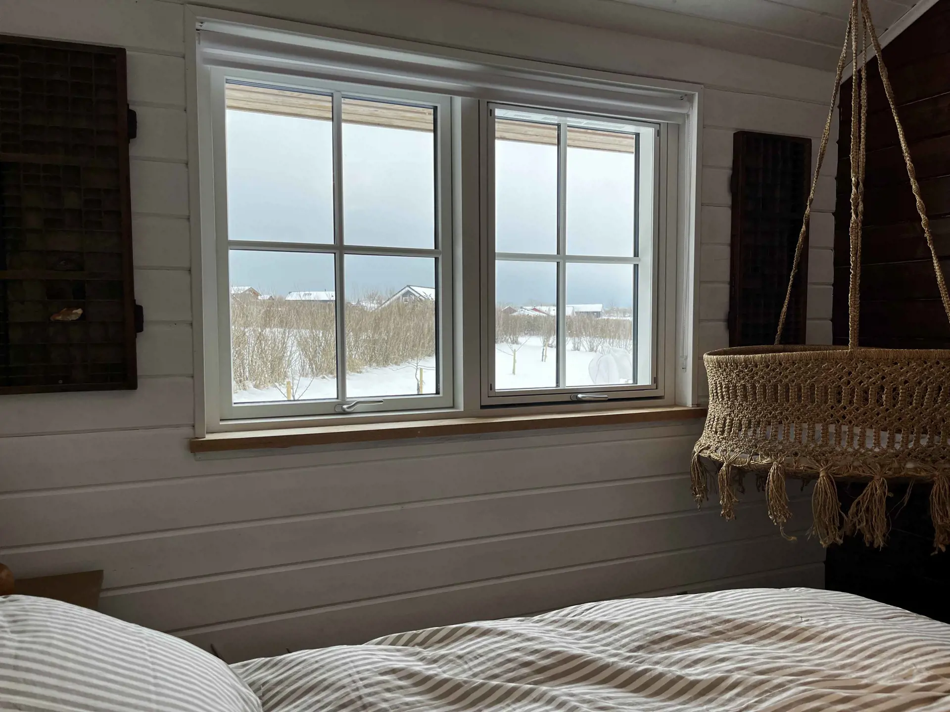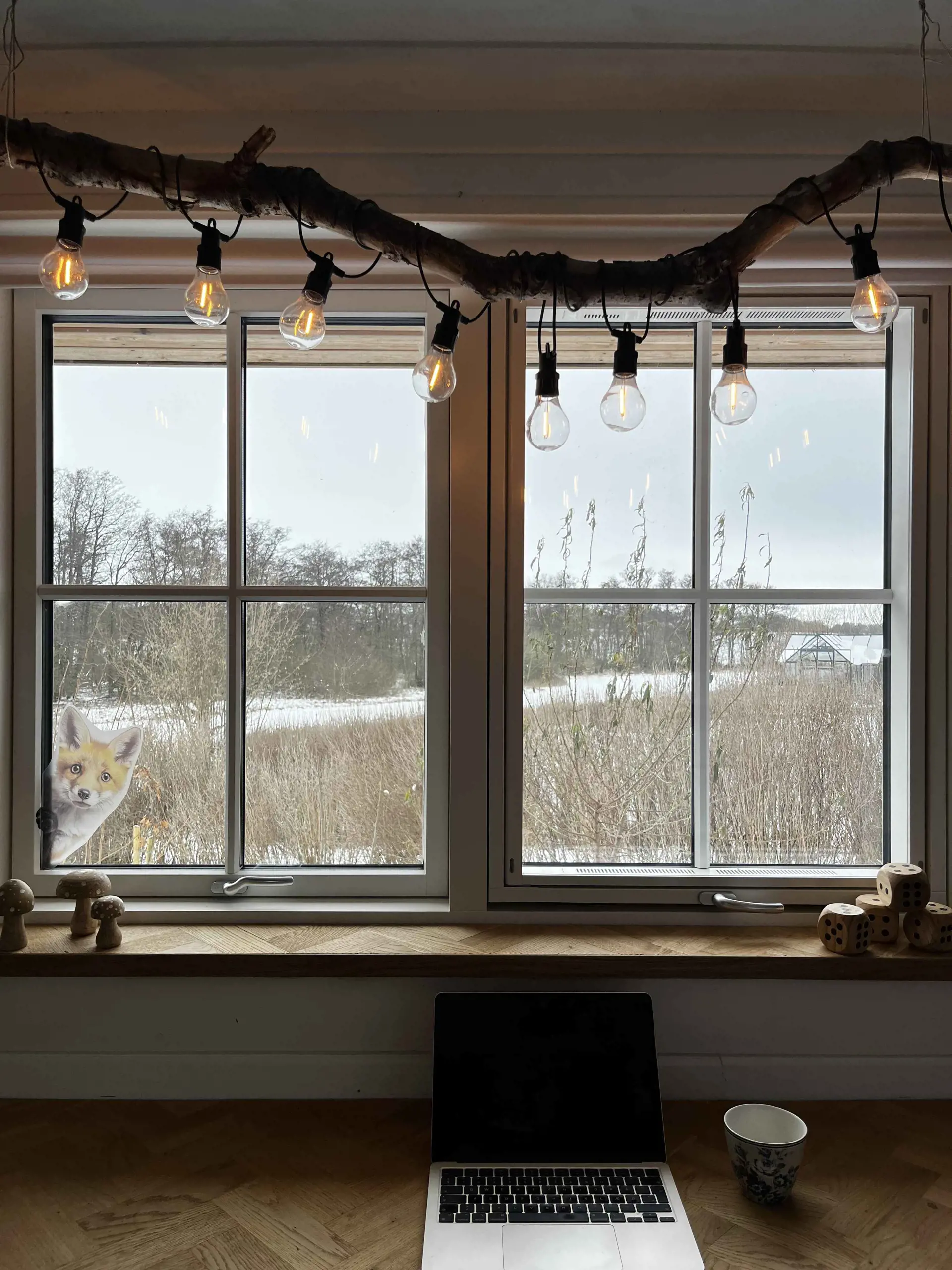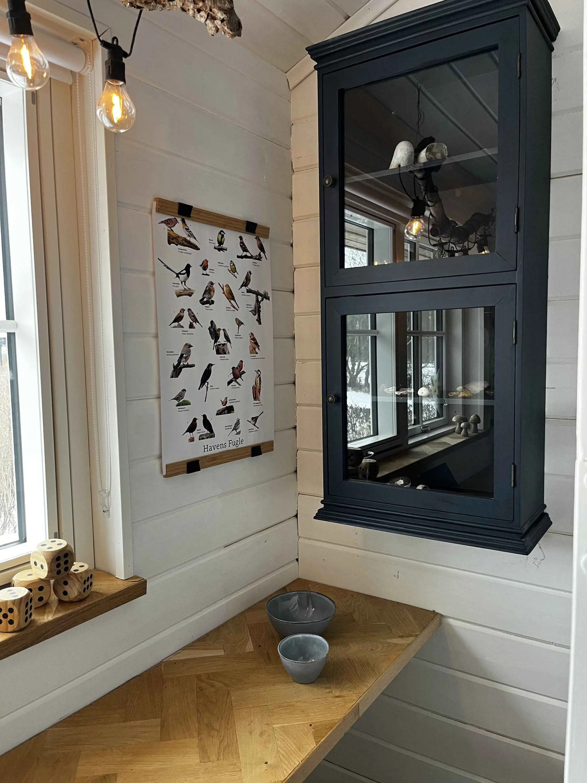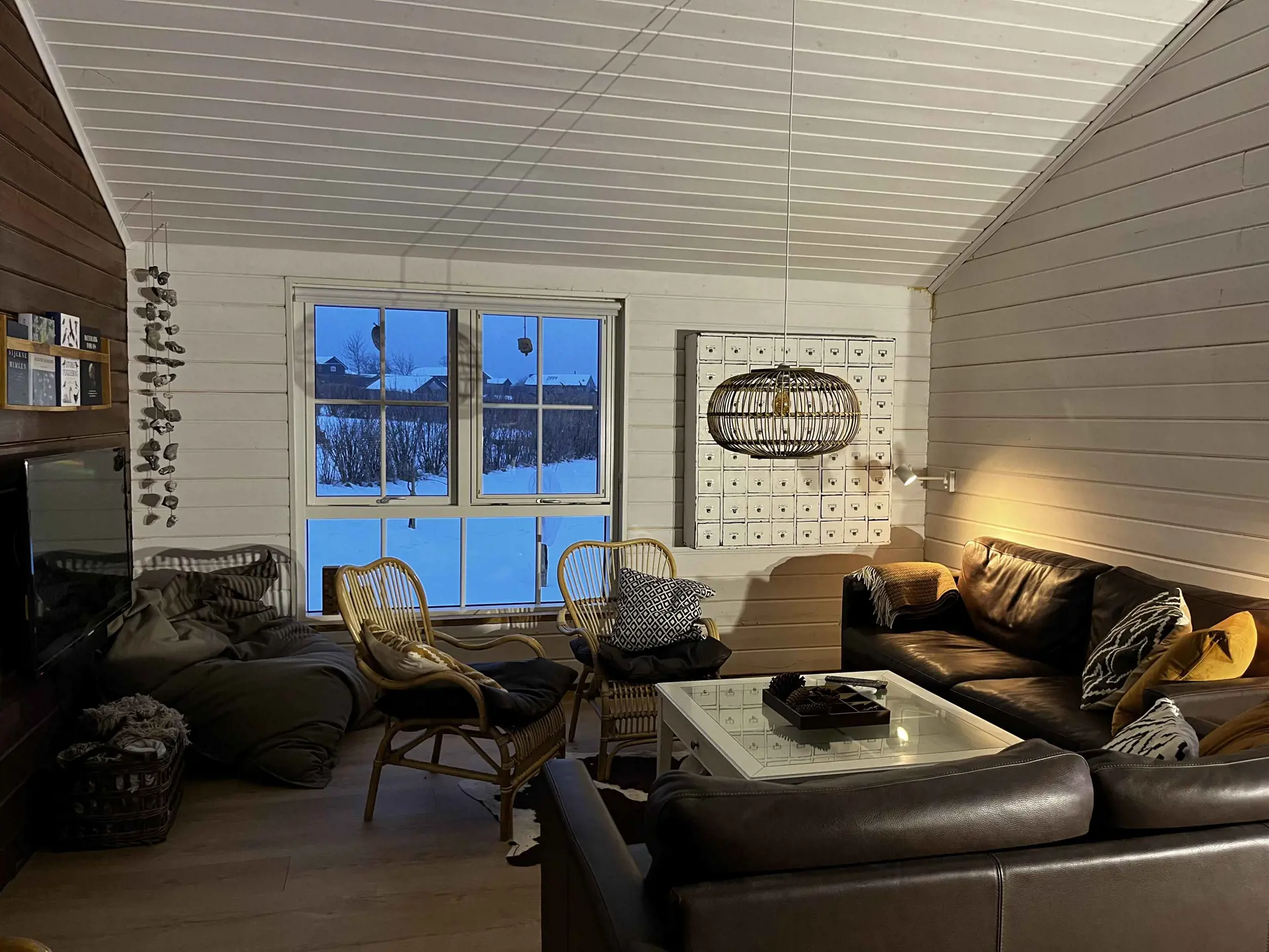 Der offene Wohnbereich ist das Herz des Hauses. Hier kann sich die ganze Familie beim Kochen versammeln und gemeinsam am großen Holztisch essen, der auch perfekt für Spiele und andere Aktivitäten ist. Entspannt euch in den Sesseln beim Knistern des Kamins oder nehmt Platz auf der Bank vor den großen Panoramafenstern mit Blick auf das Tierleben im Garten. Wenn es dunkel wird, lädt die Sofaecke zu gemütlichen Filmabenden ein.
