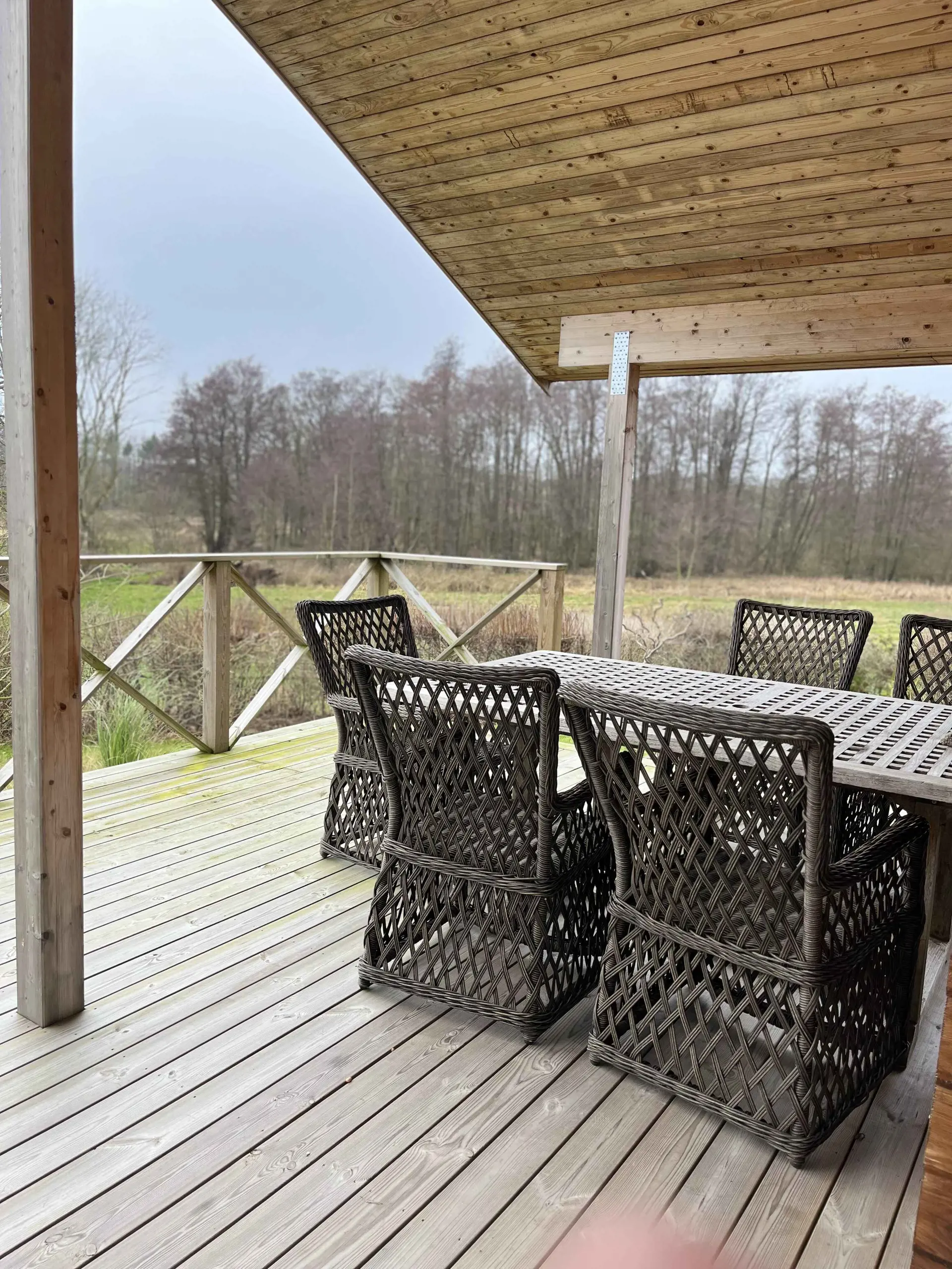 Vom Haus aus gelangt man über zwei überdachte Terrassen in den Garten, wo ihr das Wildnisbad, die Feuerstelle oder das Orangerie genießen könnt – ideal für kühlere Frühjahrs- und Herbsttage. Unter den Weinranken kann man hier mit Blick auf die Obstbäume und Beerensträucher im Garten sitzen. Durch eine Öffnung in der Hecke gelangt man zu Fußball- und Bouleplätzen. Geht man durch den kleinen Wald, erreicht man den Campingplatz mit frisch gebackenem Morgenbrot im Sommer – alles nur 500 Meter vom Strand entfernt.