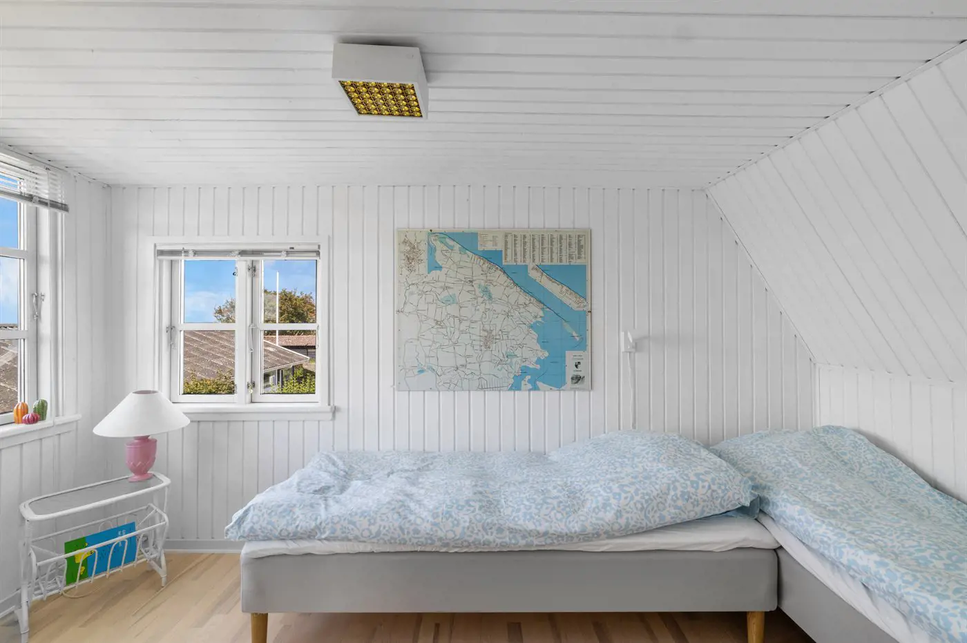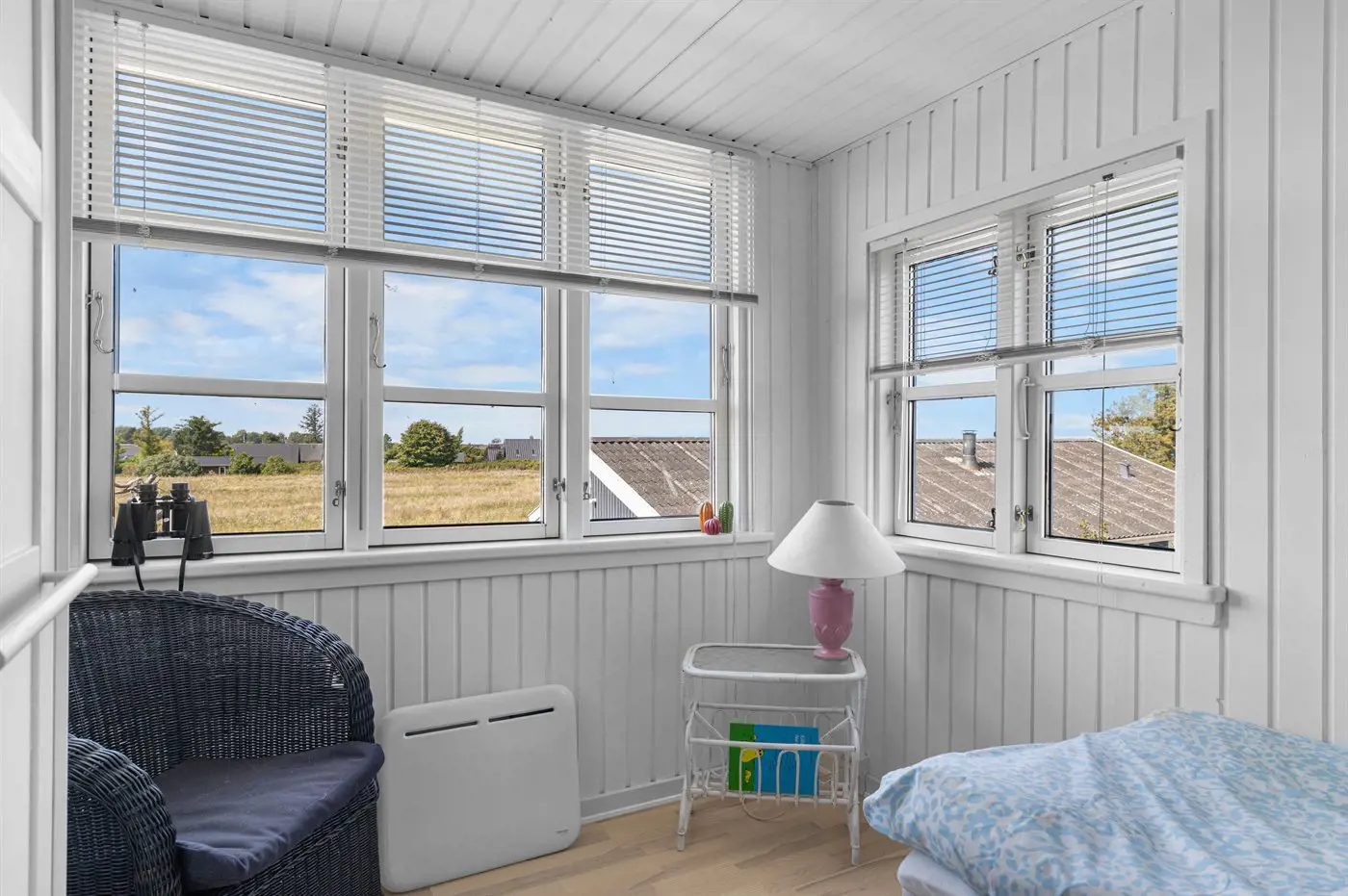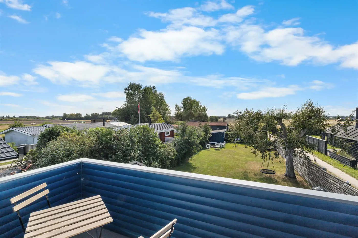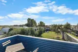 Im Obergeschoss befinden sich die beiden Schlafzimmer. In einem der Zimmer steht ein Etagenbett mit einem extra breiten unteren Bett, das auch von 2 Personen genutzt werden kann. Von hier hast du außerdem Zugang zum Balkon.