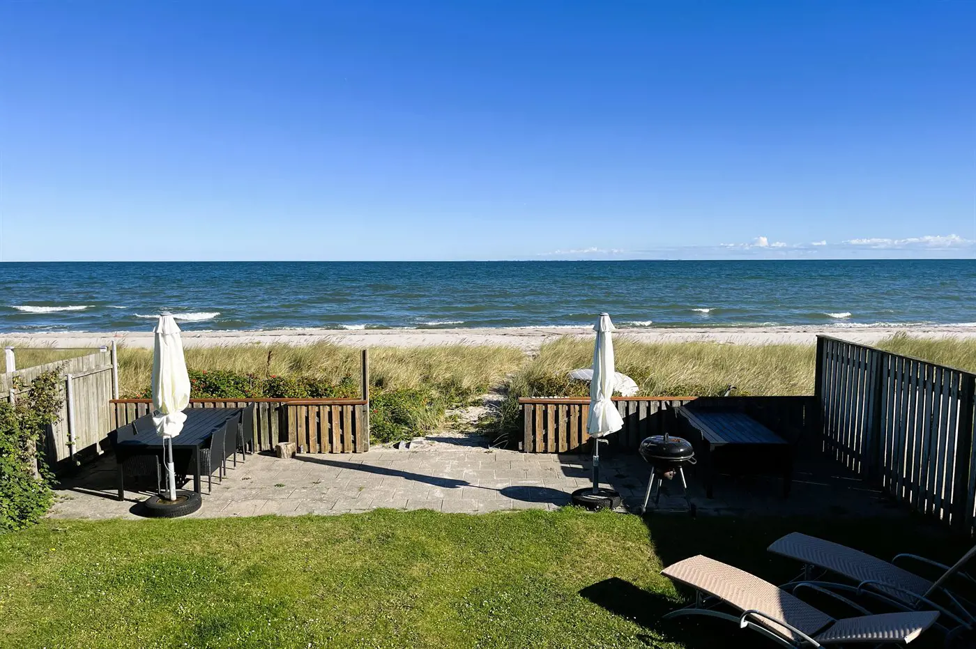 Das Haus liegt erhöht und bietet vom Küchen-, Wohnbereich und der vorderen Terrasse einen wirklich herrlichen Blick auf den Strand und das Wasser. Außerdem gibt es eine Terrasse direkt am Strandrand, sodass man fast das Gefühl hat, auf dem Strand zu sitzen und hinter dem Haus lädt eine weitere Terrasse zum Verweilen ein. Hier findet man an windigen Tagen Schutz vor dem auflandigen Wind.