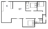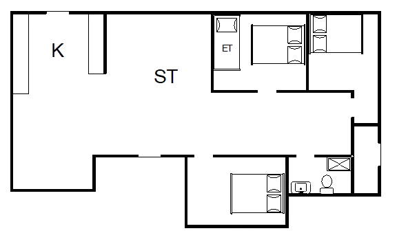 Im Haus gibt es einen offenen Küchen-/Wohnbereich mit Ess- und Sitzecke sowie einen Holzofen für kühlere Abende. Über einen kleinen Flur hat man Zugang zu allen drei Schlafzimmern mit je zwei Schlafplätzen in Betten sowie zum kleinen Bad mit Dusche/WC.