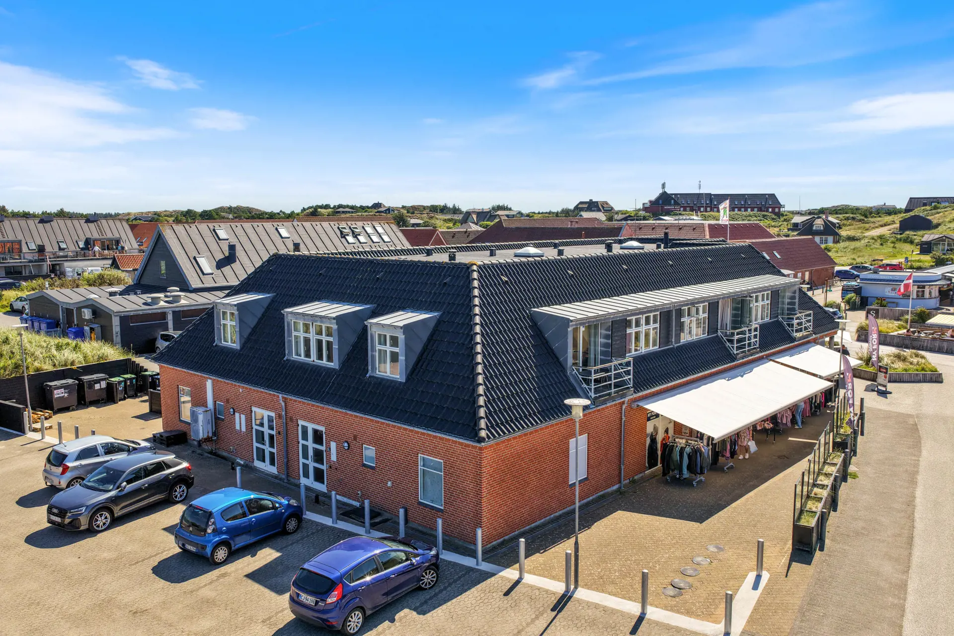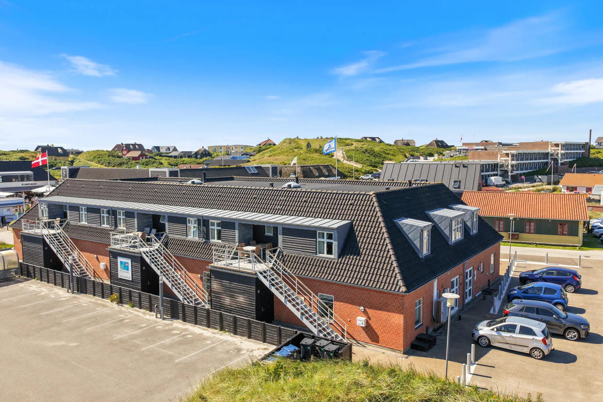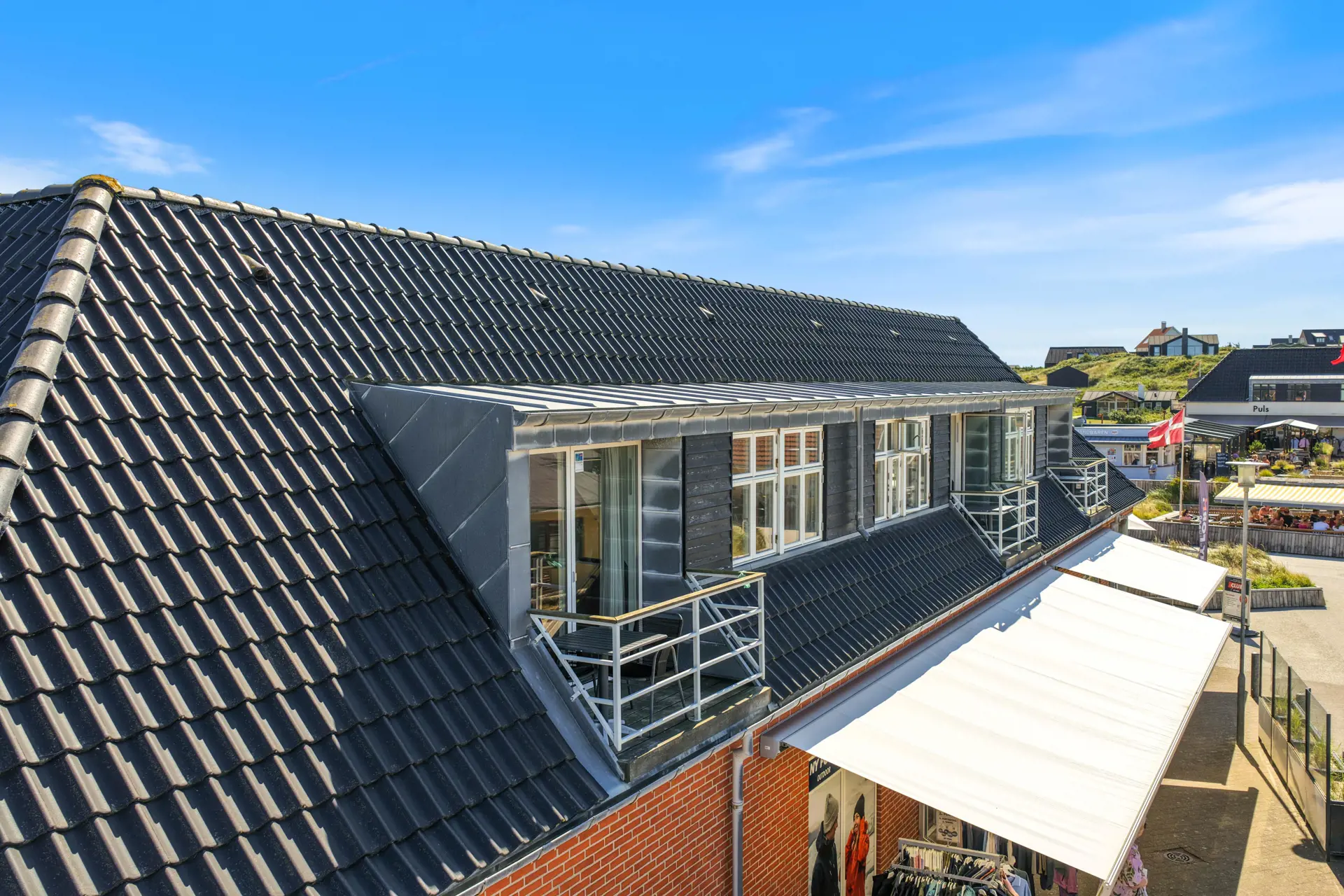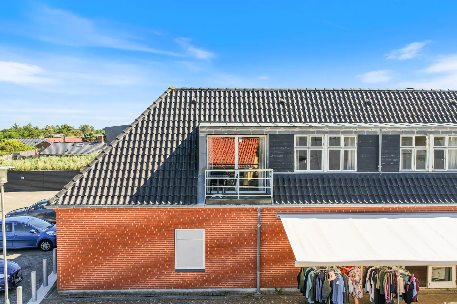 Zu dieser wirklich schönen Wohnung gehört sowohl eine kleine Dachterrasse, welche mit Gartenmöbeln und Grill ausgestattet ist als auch ein Balkon Richtung “Sonnenuntergang”. Von der Terrasse hast du einen Blick auf die Hauptstraße von Henne Strand. Hier spürst du die entspannte Ferienstimmung und kannst vom Morgen bis zum Nachmittag die Sonne z.B. bei einer Tasse Kaffee oder einem Eis genießen.