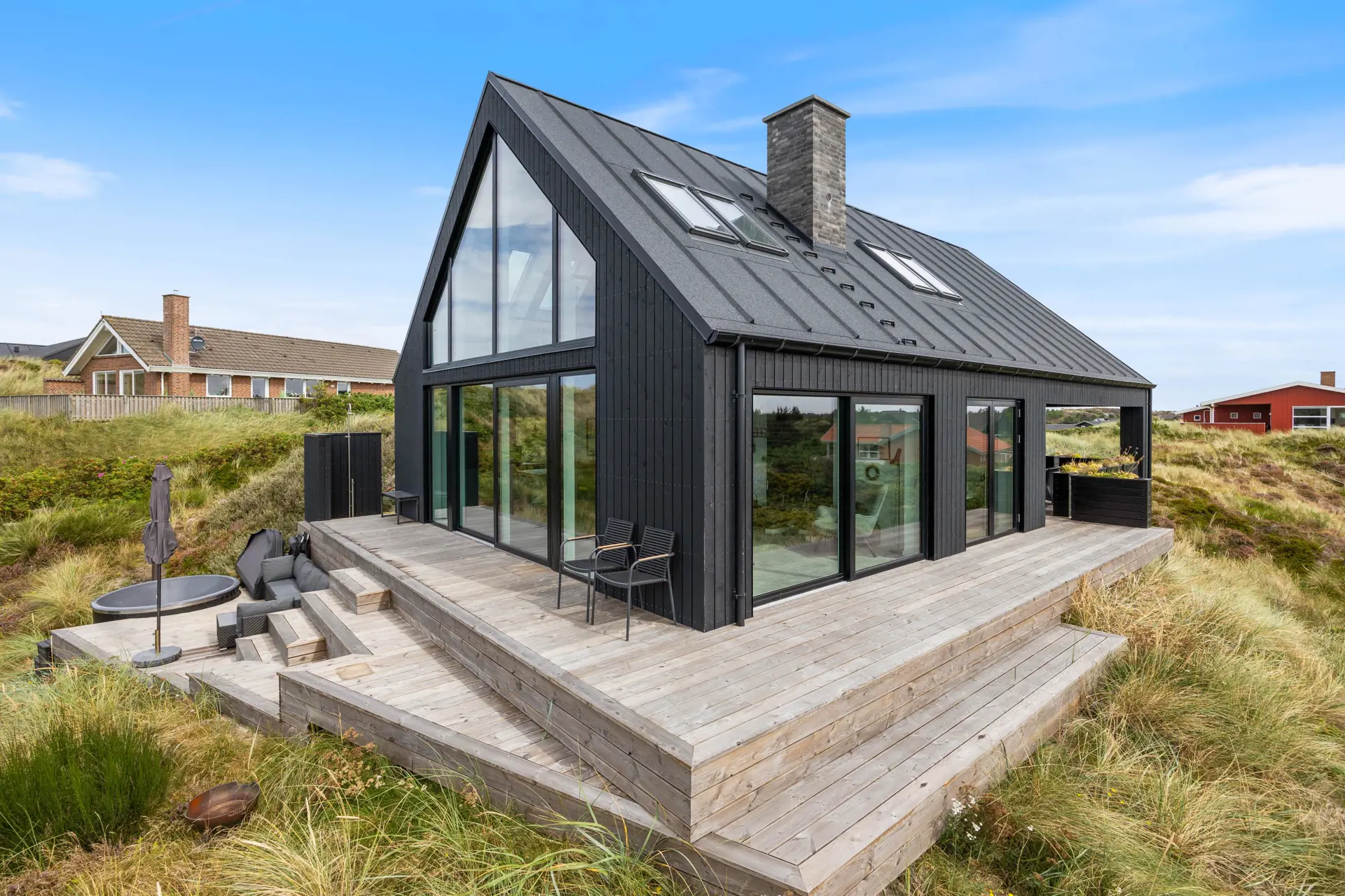 Angekommen im Ferienhaus erwartet euch eine Einrichtung mit köstlichen und natürlichen Materialen, beginnend in der großzügigen Eingangshalle, in der sich auch die Waschmaschine und der Trockner befinden. Weiterhin gibt es die ersten beiden Schlafzimmer, sowie auch ein helles Bad, bevor Ihr die gut ausgestattete Küche und das Esszimmer des Ferienhauses erreicht. Hier gibt es große Glasflächen, die nicht nur für einen fantastischen Lichteinfall sorgen, sondern auch für einen einzigartigen Blick auf die Dünen – mit der Nordsee im Hintergrund.