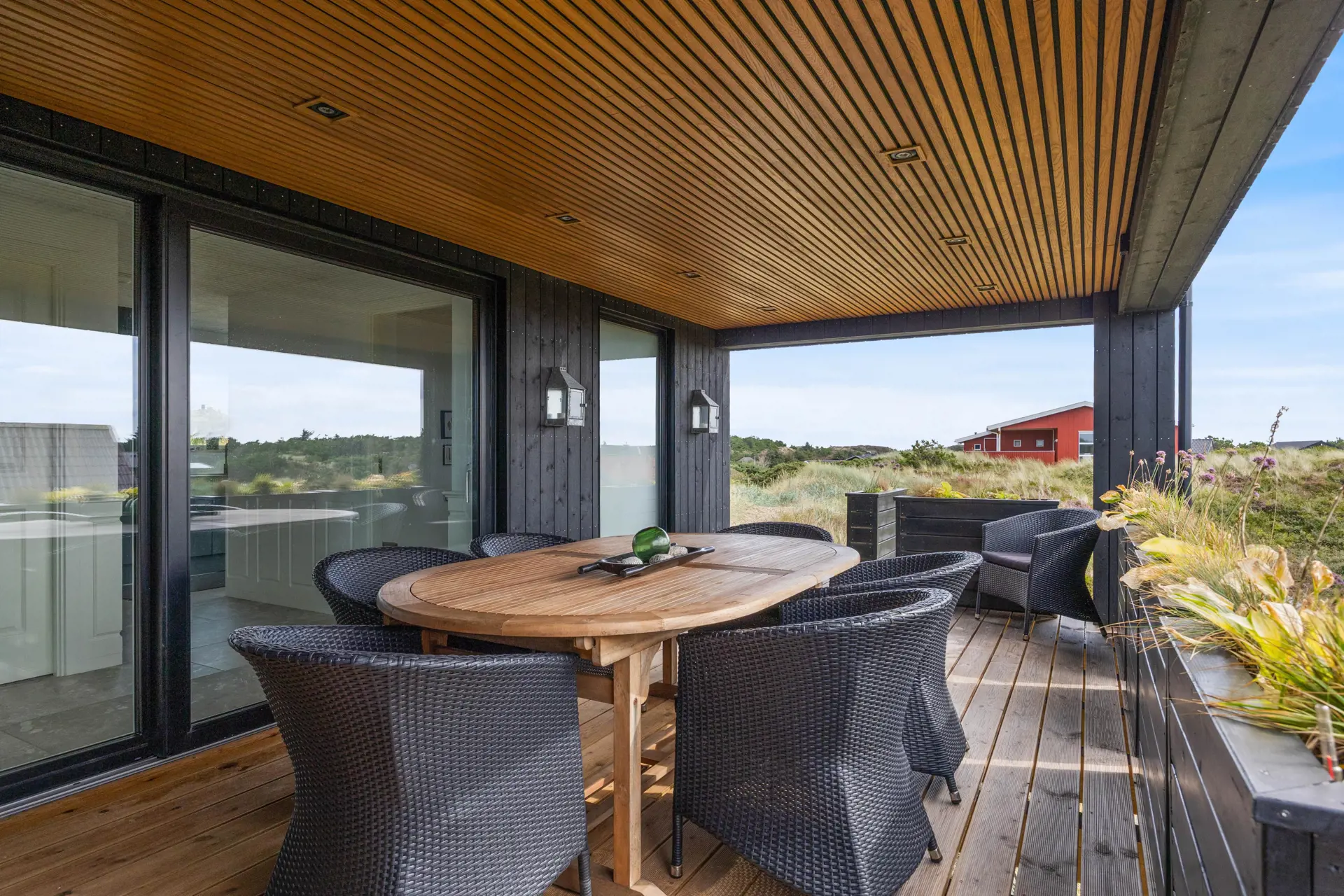 Auf der traumhaften Holzterrasse, die teilweise überdacht is und wo komfortable Gartenmöbel und Sonnenliegen zur Verfügung stehen, könnt Ihr enstpannende Stunden verbringen. Ein absolutes Highlight ist Außenwhirlpool - mit Ausblick in die Natur: Nach einer Abkühlung unter der Außendusche* könnt Ihr den Sternenhimmel über Henne im sprudelnden Wasser des Whirlpools genießen.