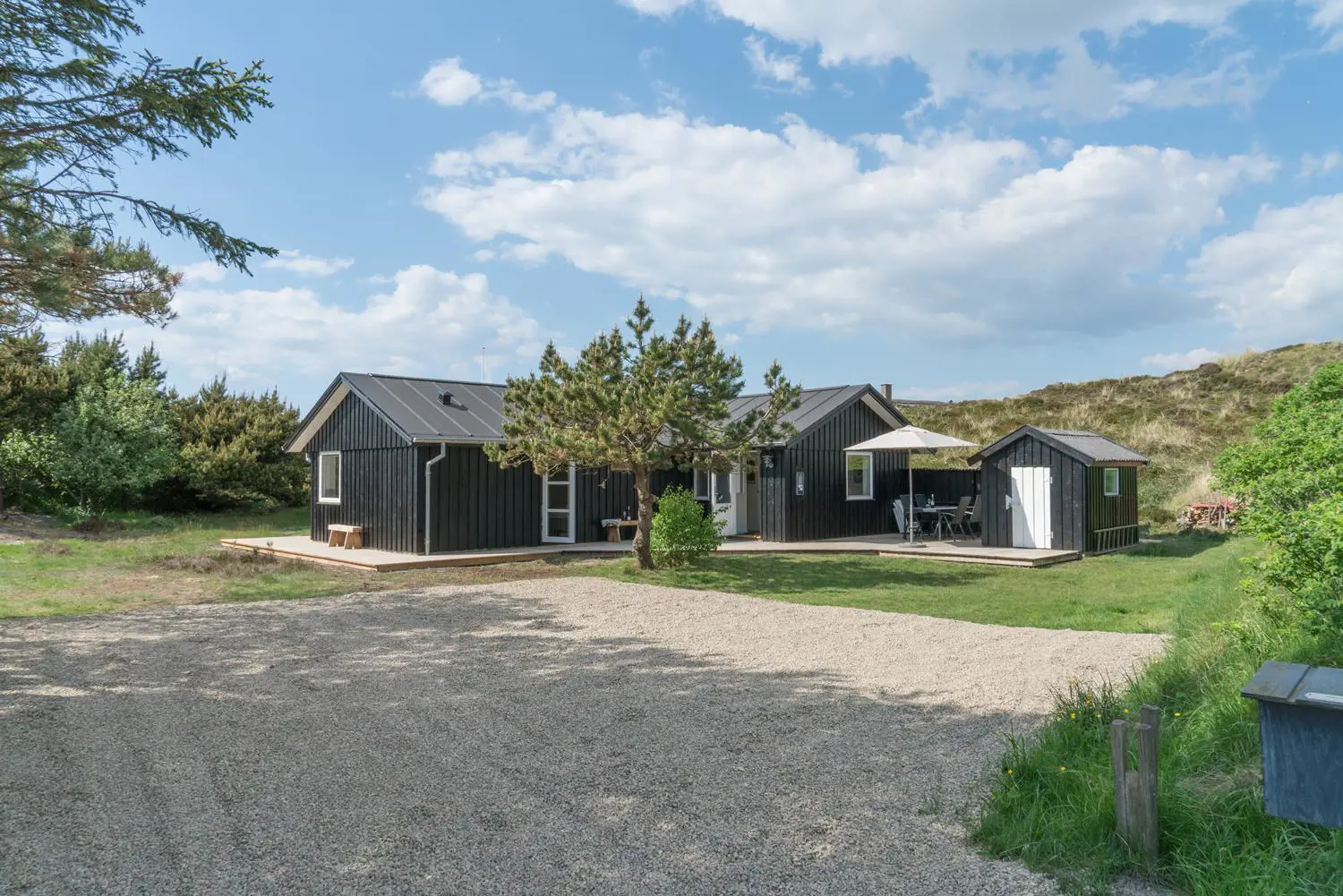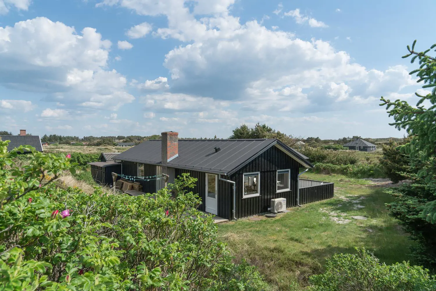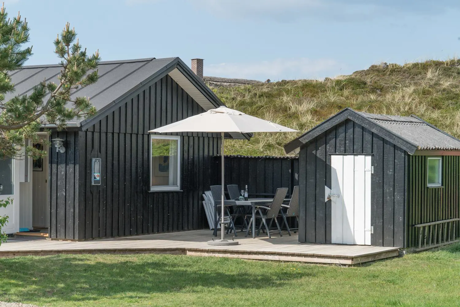 Auch der Außenbereich lässt keine Wünsche offen. Das Grundstück am Hjelmevej 73 liegt ruhig und naturnah mit herrlichem Blick auf die Dünenlandschaft der dänischen Westküste.