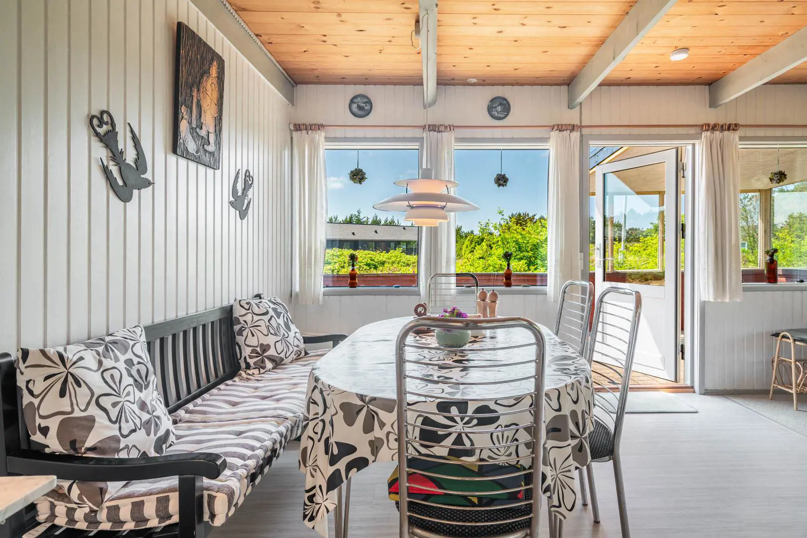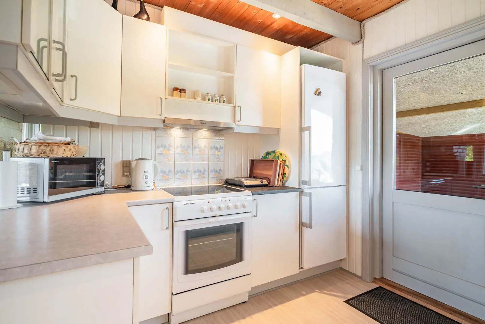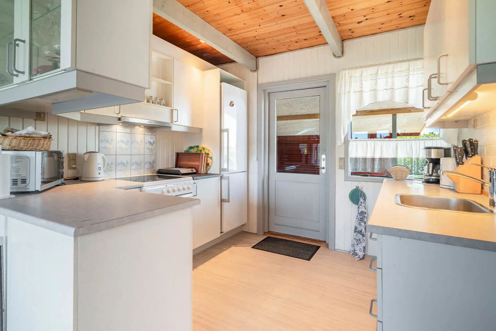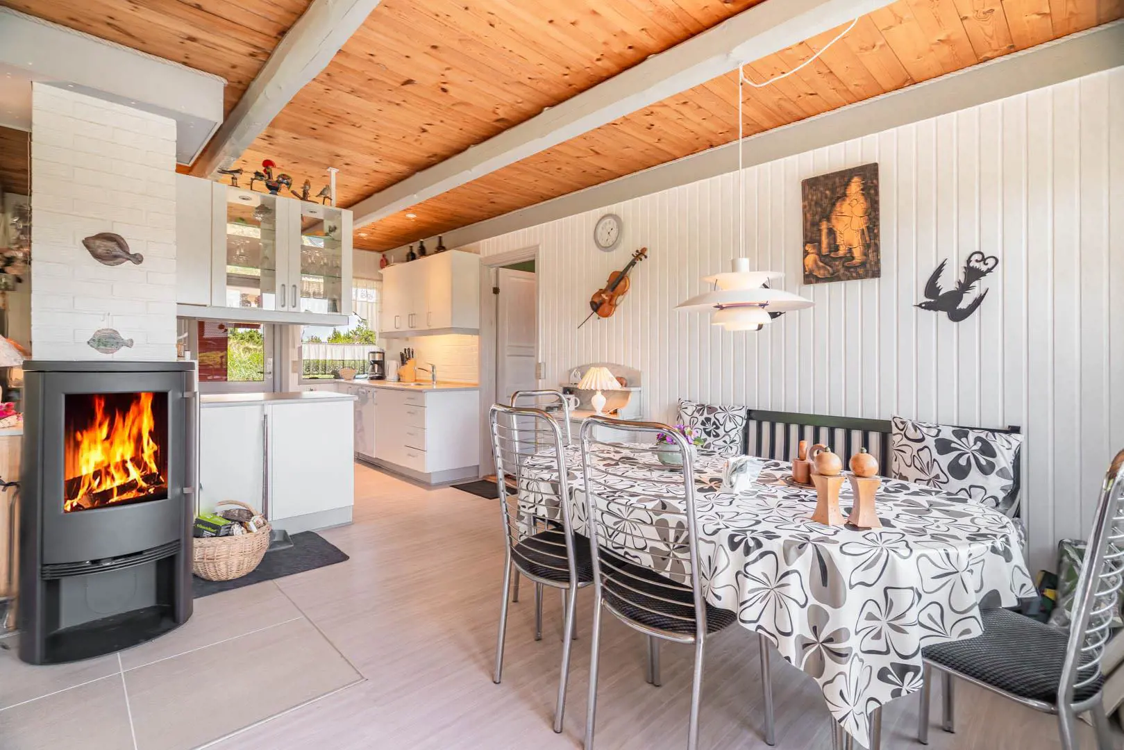 Im Inneren erwartet Sie eine freundliche und einladende Atmosphäre. Das Ferienhaus verfügt über ein neues, modernes Badezimmer sowie eine gut ausgestattete Küche mit gemütlicher Essecke, die zu gemeinsamen Mahlzeiten einlädt. Das helle und angenehme Wohnzimmer bietet direkten Zugang zur überdachten Terrasse, wo Sie Ihre Mahlzeiten genießen oder unabhängig vom Wetter entspannen können.