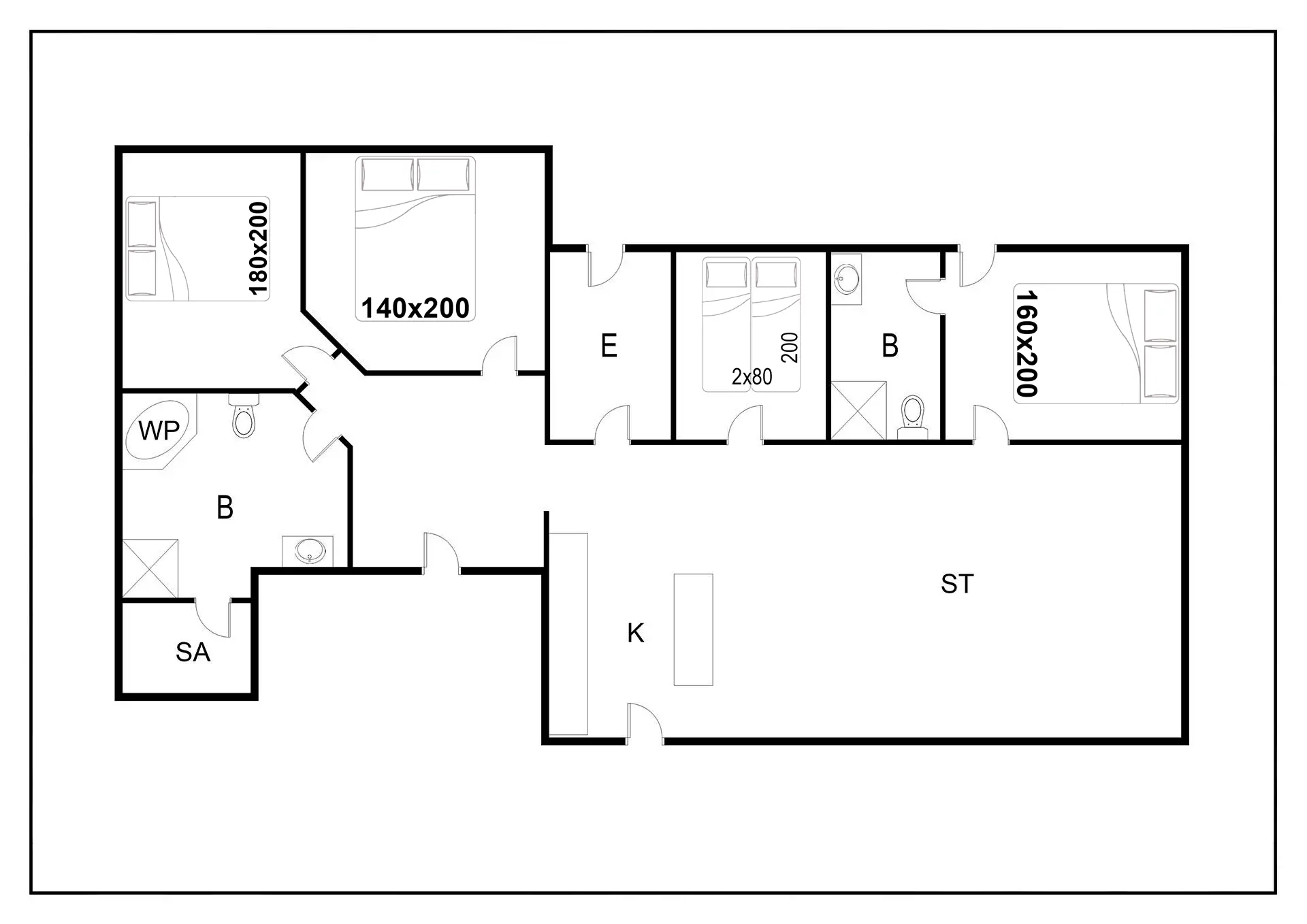 Bettengrösse: 1 Doppelbett 180 x 200 cm + 1 Doppelbett mit je 2 Matratzen á 80 x 200 cm (Ausziehbar) + 1 Doppelbett 160 x 200 cm + 1 Doppelbett 140 x 200 cm.