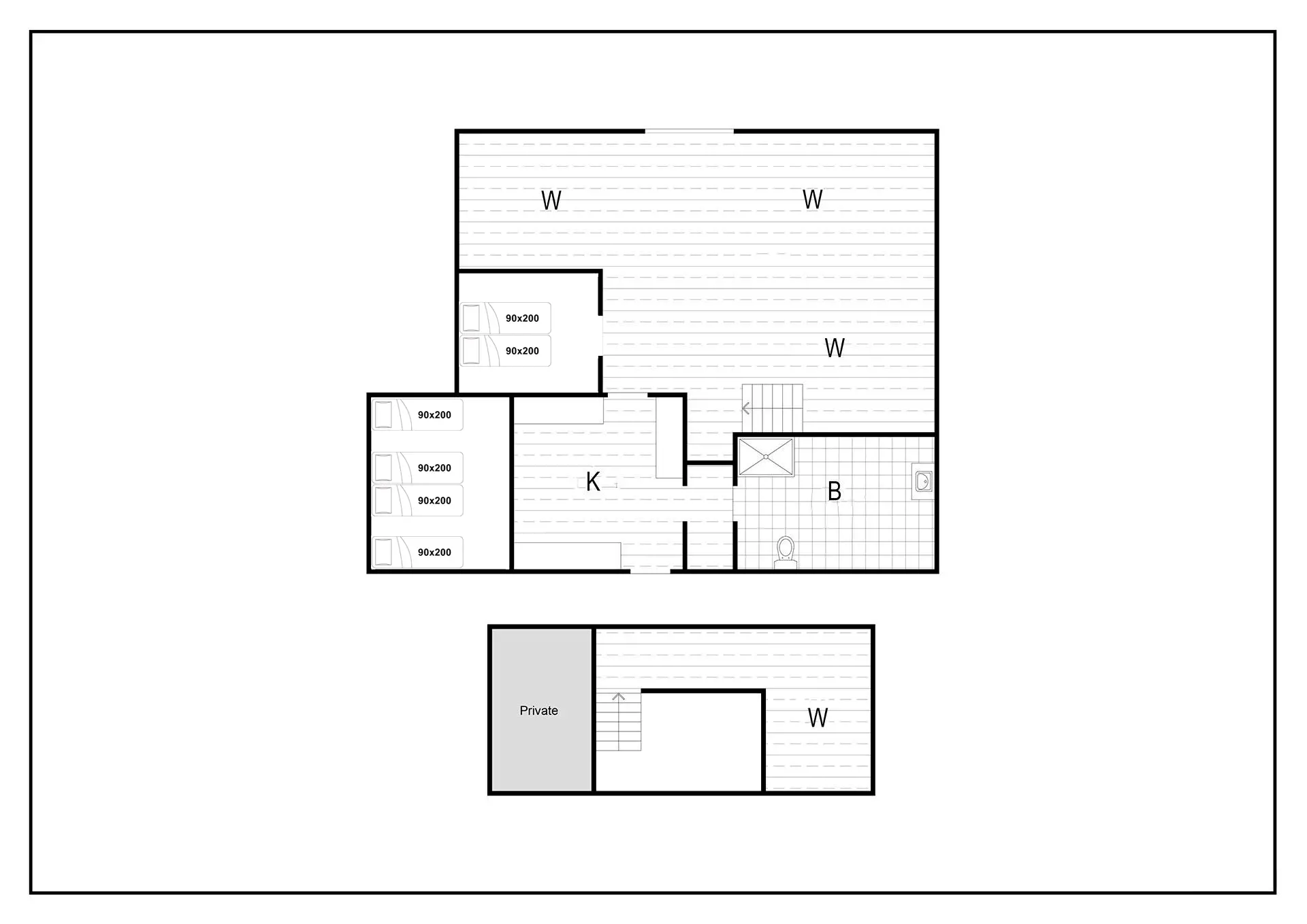 Bettengrösse: 2 Doppelbetten mit je 2 Matratzen á 90 x 200 cm + 2 Einzelbetten 90 x 200 cm.