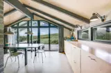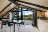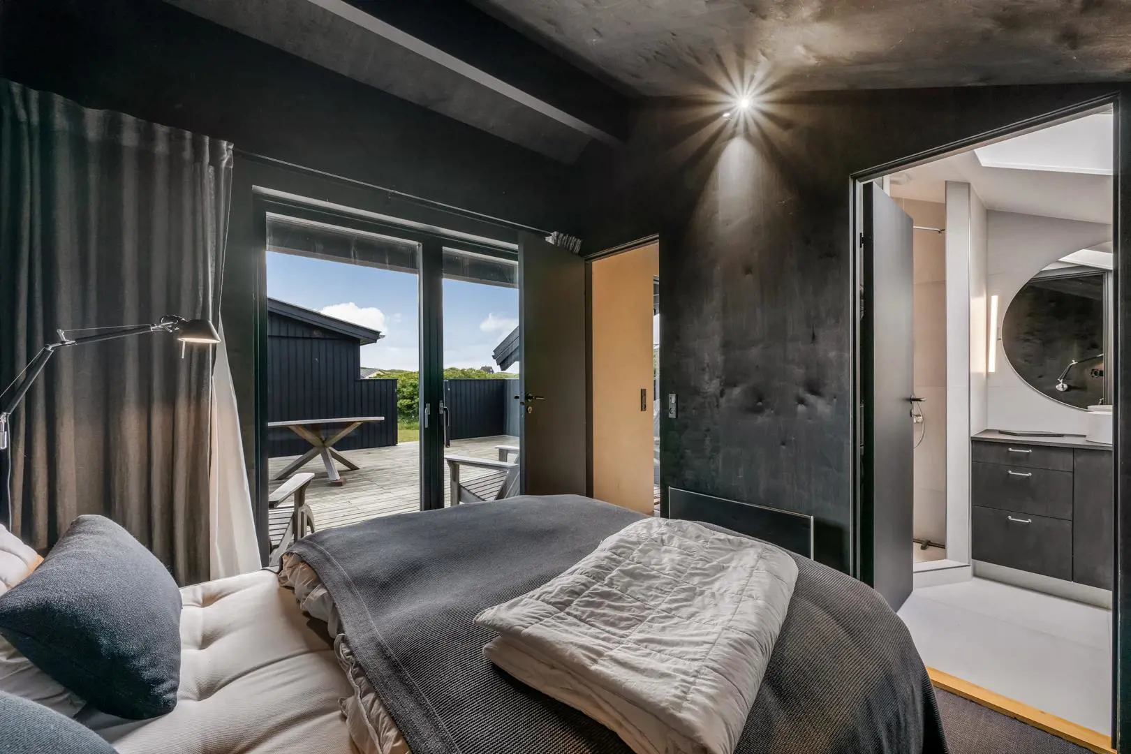 Die offene Küche bietet sehr viel Stauraum, großzügige Arbeitsflächen und eine Ausstattung, wie man sie in hochwertigen Ferienhäusern in Henne Strand nur selten findet. Vom Eingangsbereich gelangt ihr zu drei Schlafzimmern: zwei mit Doppelbett und eines mit zwei Einzelbetten. Ein Schlafzimmer verfügt über direkten Terrassenzugang – perfekt für den ersten Blick in die Dünen am Morgen.