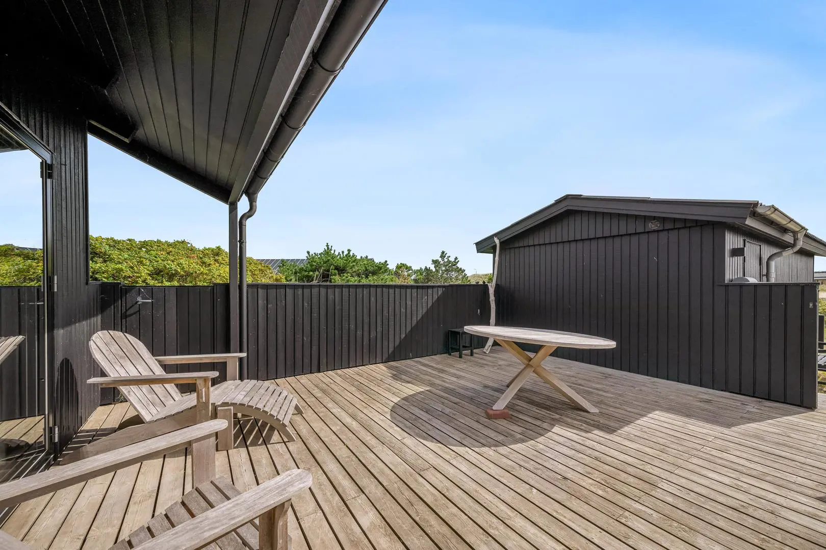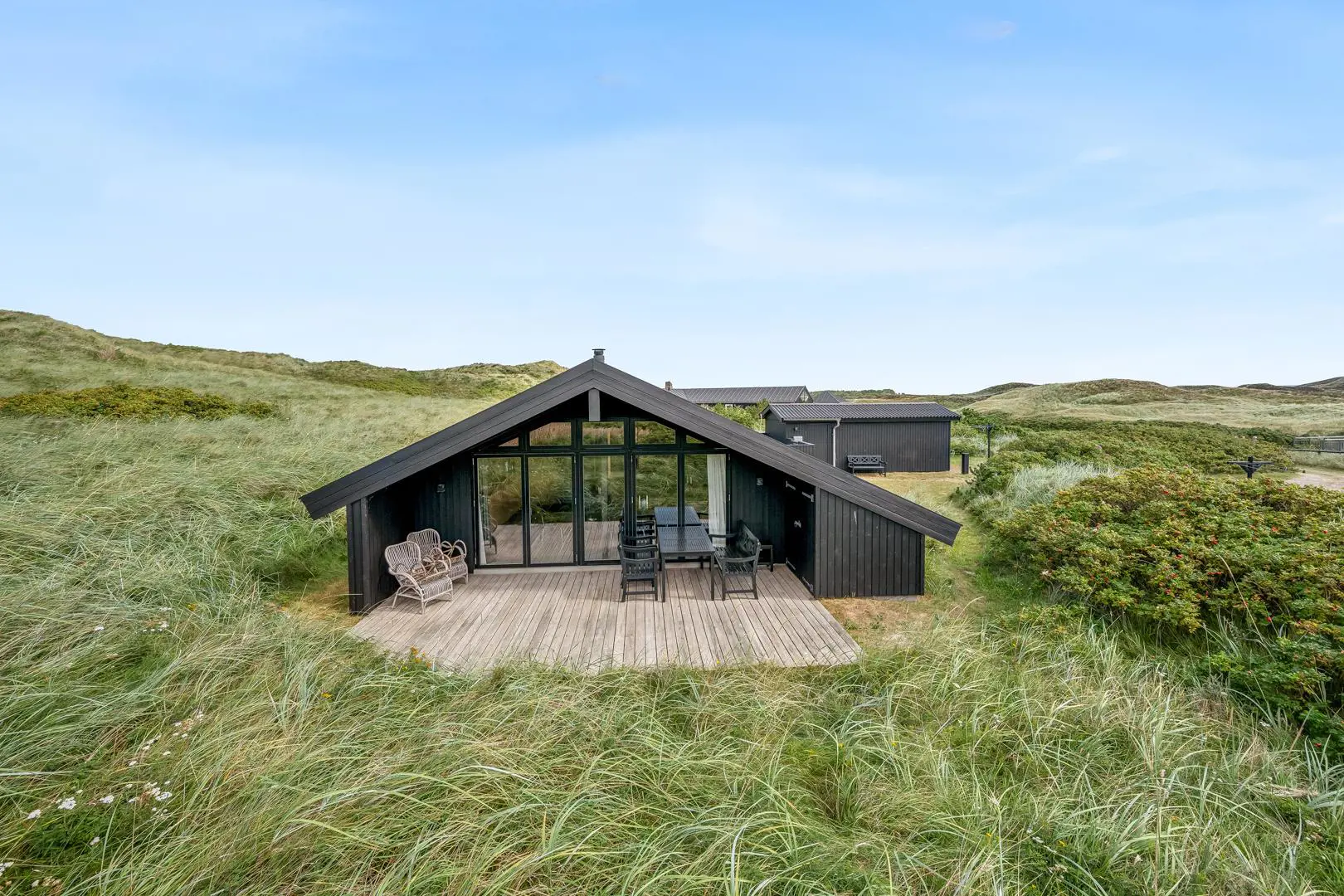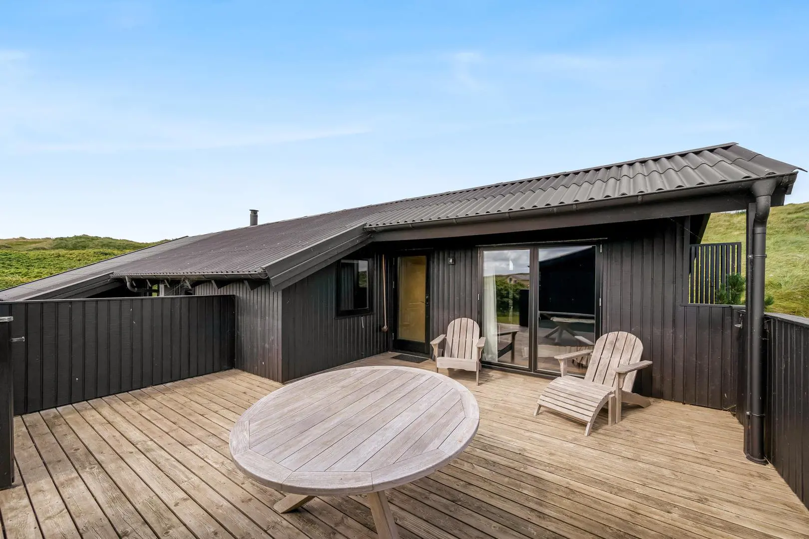Rund um das Ferienhaus sowie auf dem Naturgrundstück laden mehrere geschützte und sonnige Terrassen zum Verweilen ein. Von der uneinsehbaren, teilweise überdachten Westterrasse eröffnet sich ein fantastischer Blick über die umliegende Dünenlandschaft – hier erlebt ihr die schönsten Sonnenuntergänge Henne Strands.