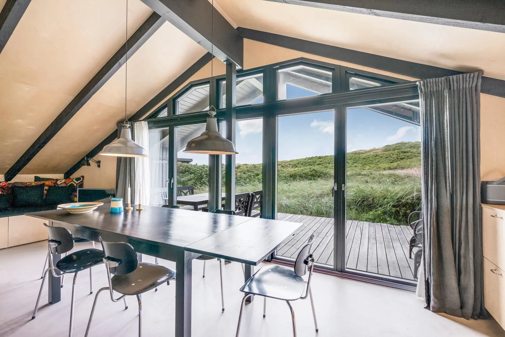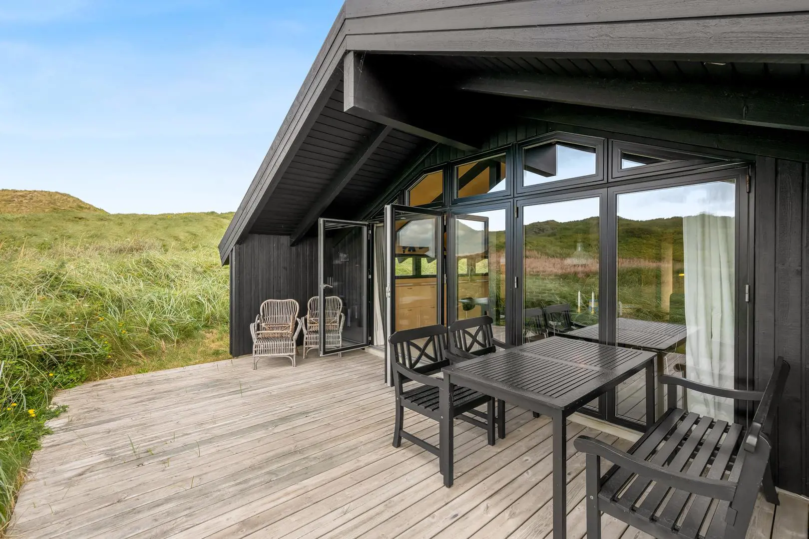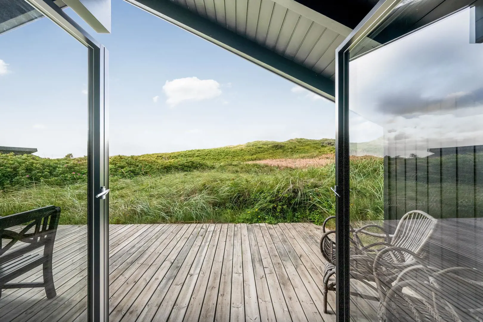 Rund um das Ferienhaus sowie auf dem Naturgrundstück laden mehrere geschützte und sonnige Terrassen zum Verweilen ein. Von der uneinsehbaren, teilweise überdachten Westterrasse eröffnet sich ein fantastischer Blick über die umliegende Dünenlandschaft – hier erlebt ihr die schönsten Sonnenuntergänge Henne Strands.