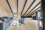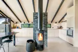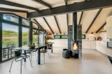 Der offene Wohnbereich mit Kamin und Wärmepumpe schafft eine gemütliche Atmosphäre – ideal für Familien oder Paare, die ein Ferienhaus an der Nordsee suchen. Große Fenster und der direkte Zugang zur Westterrasse lassen viel Licht und Dünenlandschaft in den Raum.