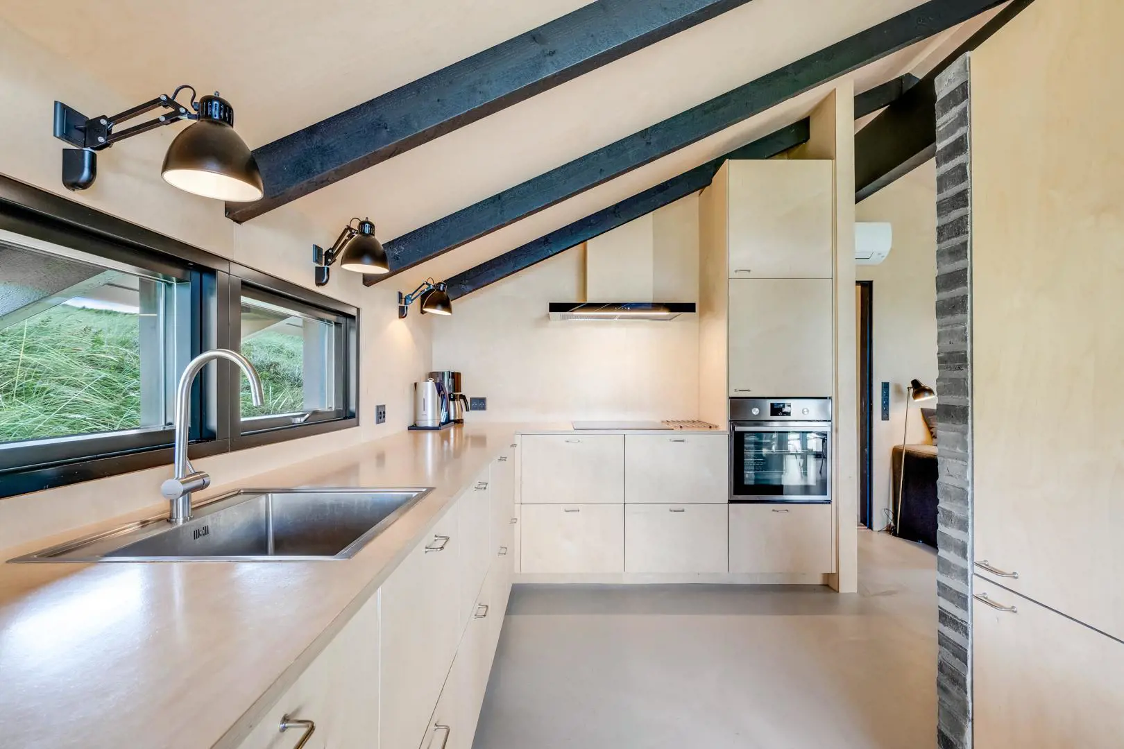 Das im Jahre 2018 umfassend renovierte Ferienhaus in Henne Strand präsentiert sich in einem Zustand, der deutlich über dem Standard liegt. Helles Birkenfurnier, robuste Betonböden mit Epoxy-Beschichtung und Fußbodenheizung in den Wohnbereichen sorgen für modernen Komfort.