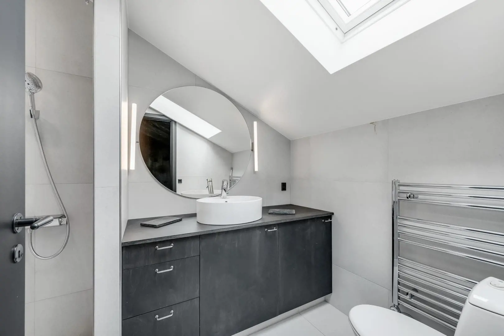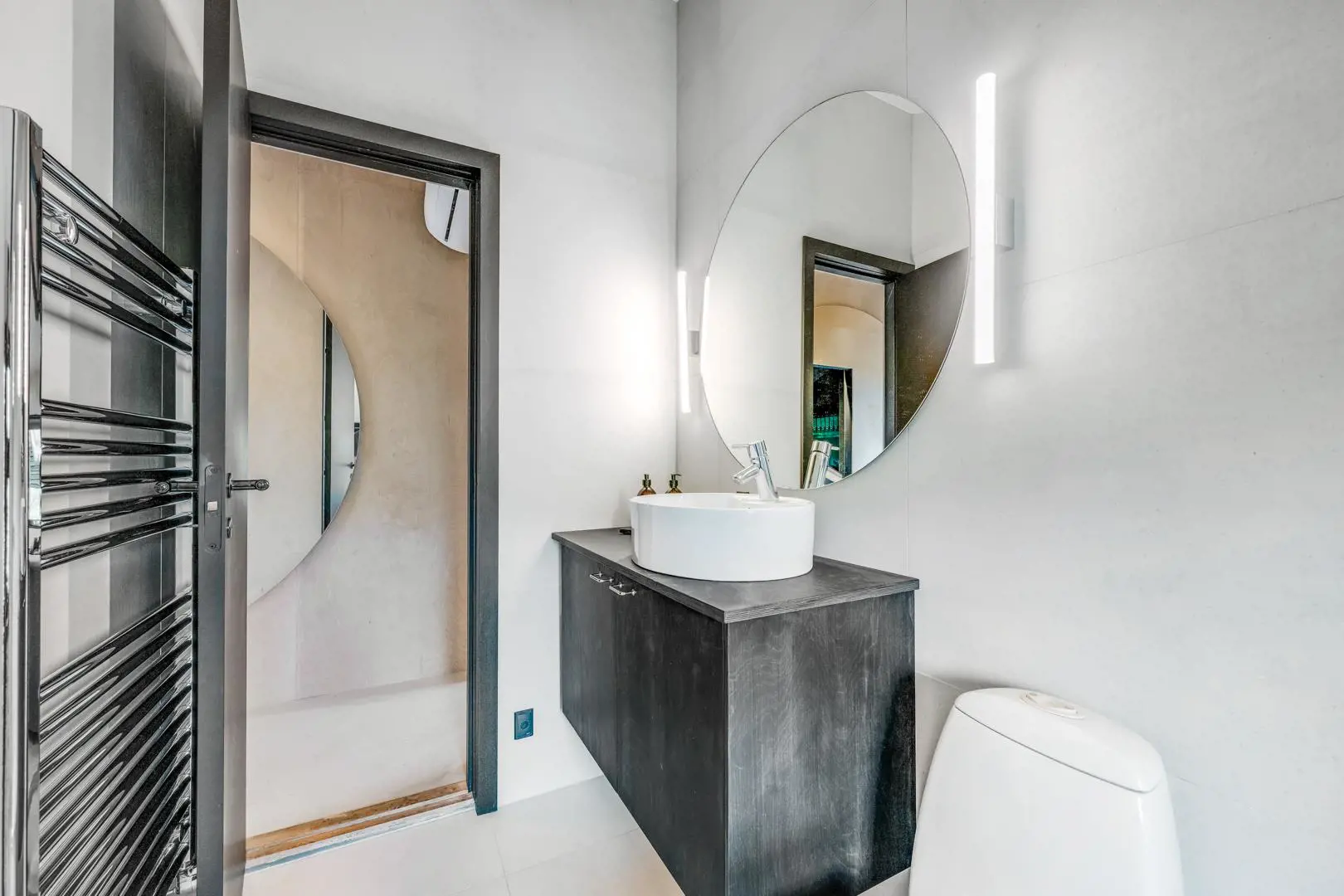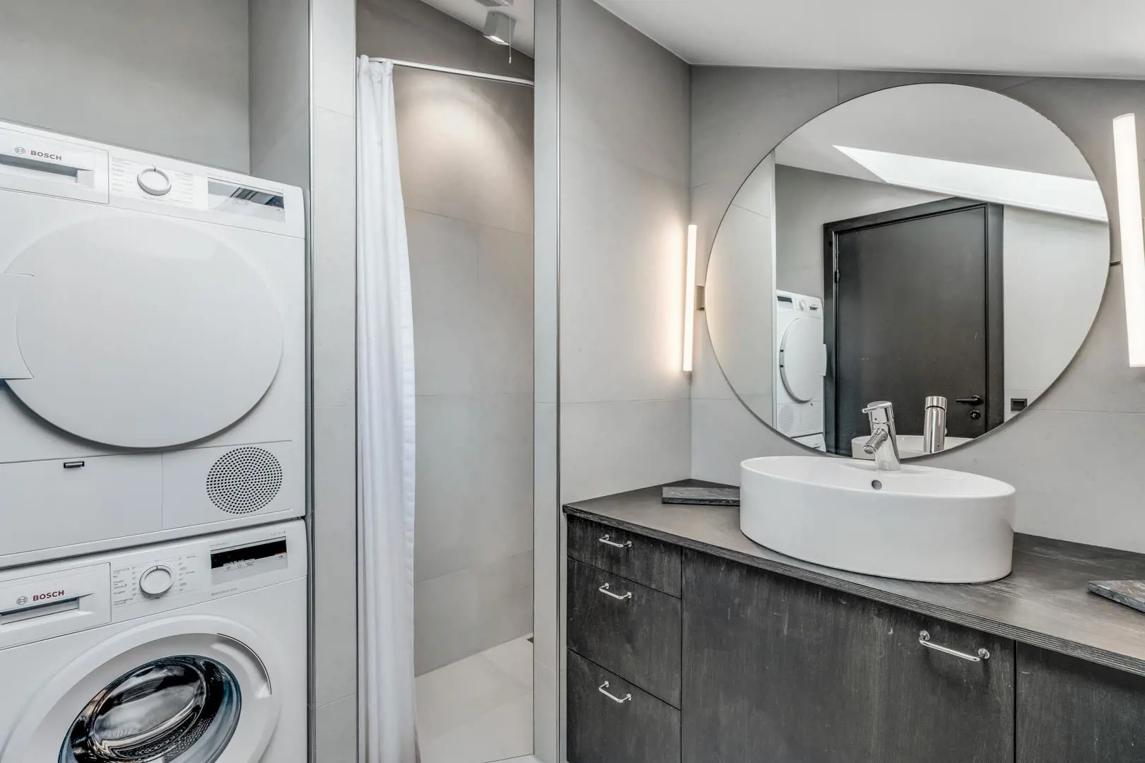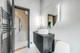 Zwei moderne Badezimmer, eines davon mit Waschmaschine und Trockner, runden die Ausstattung ab.