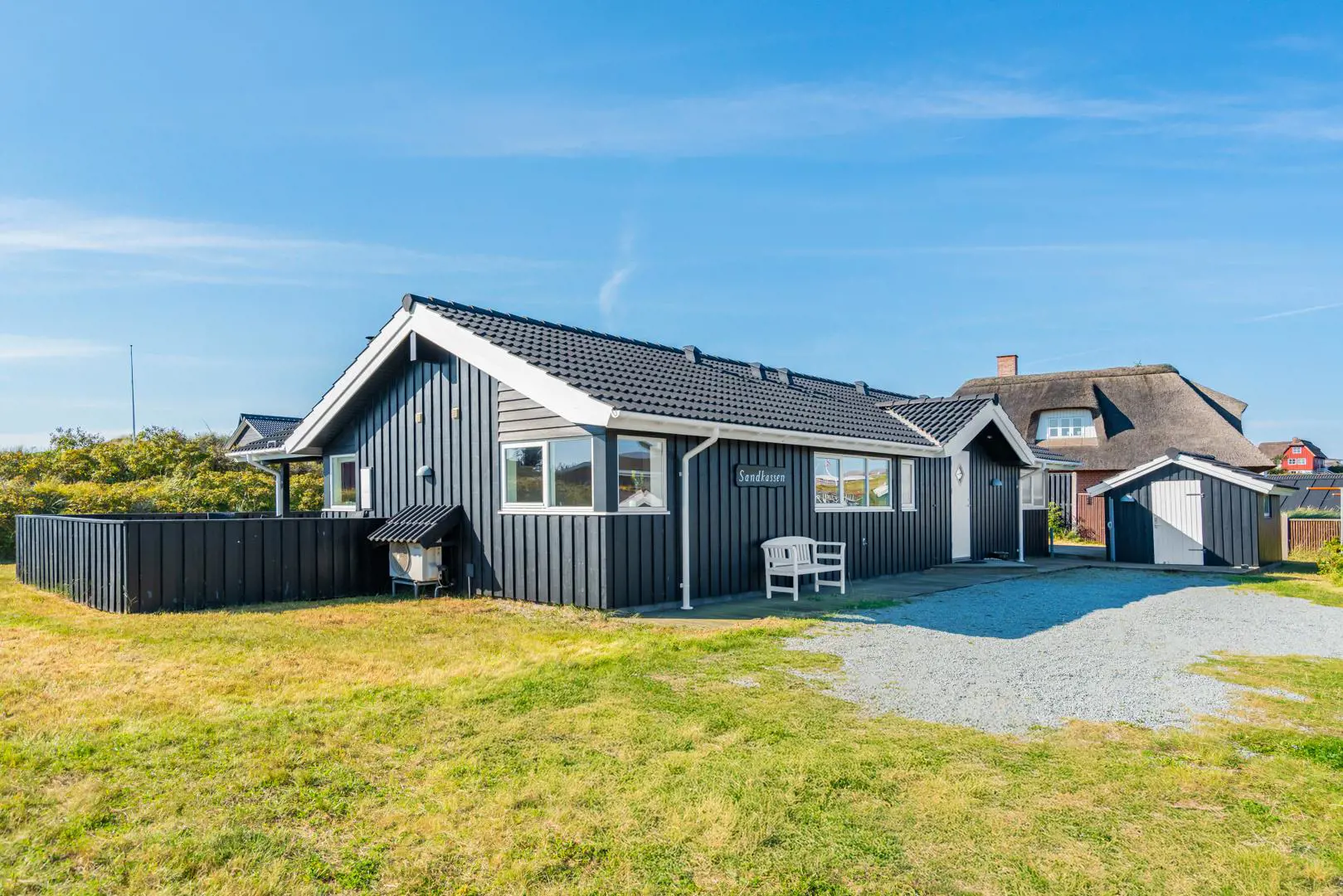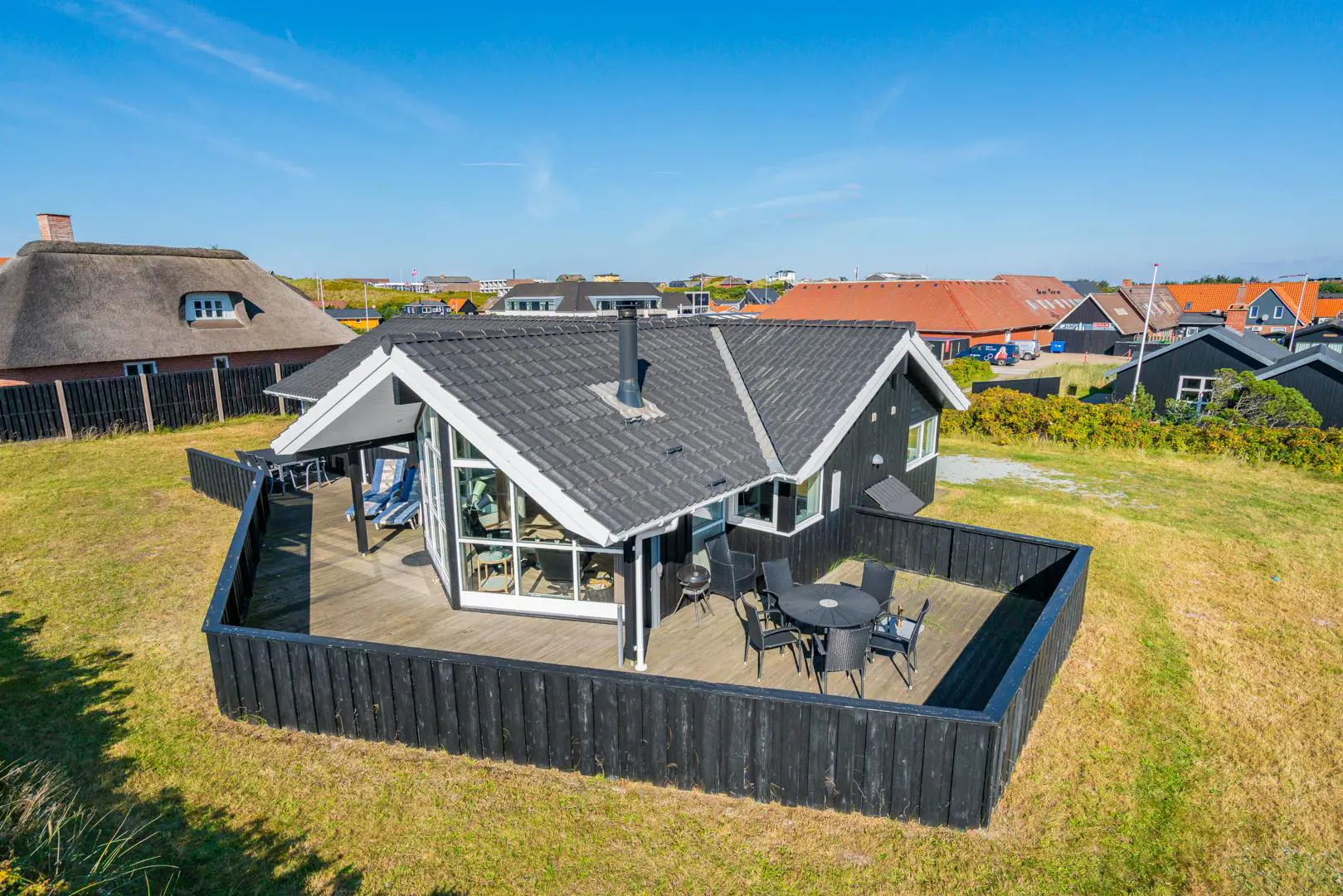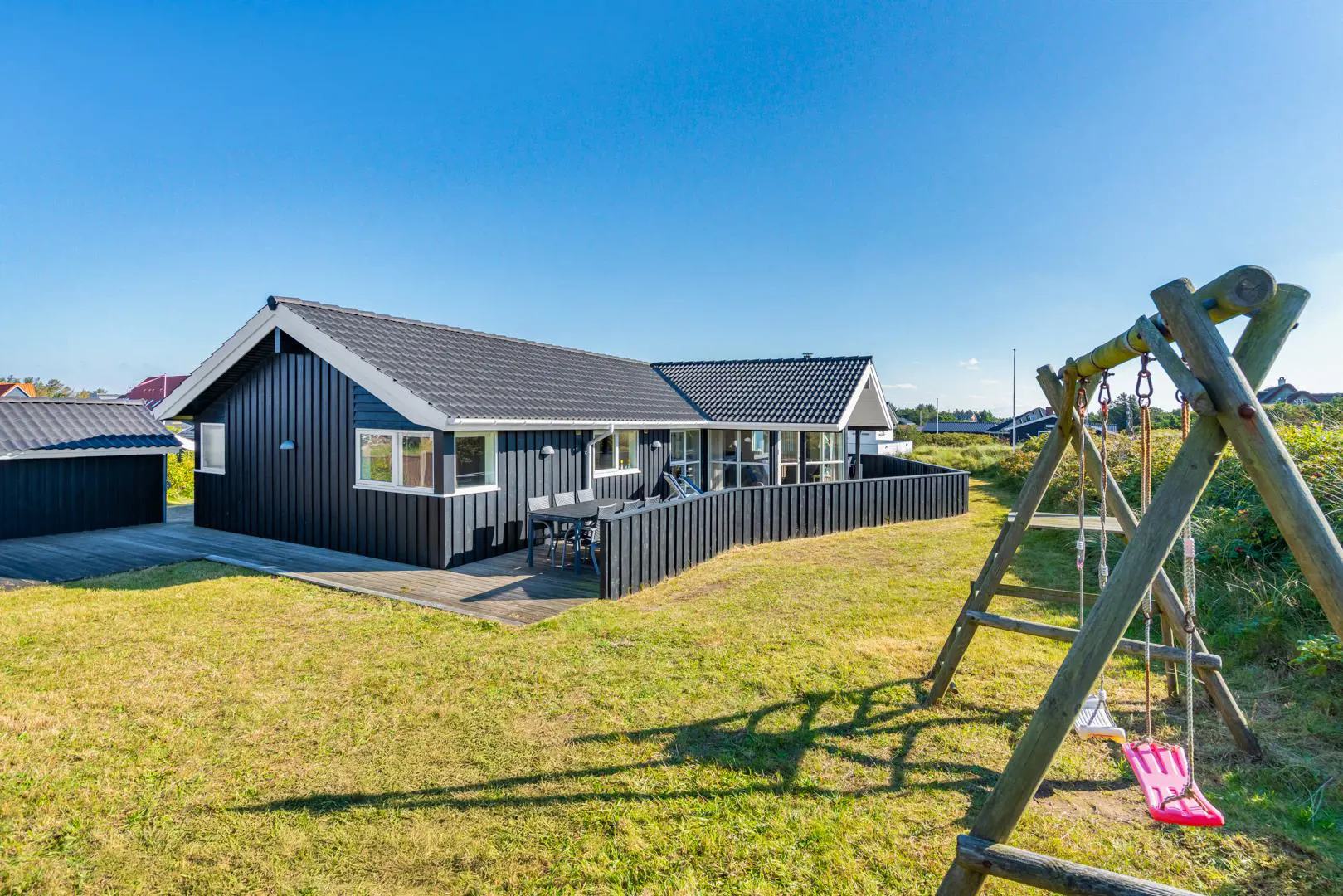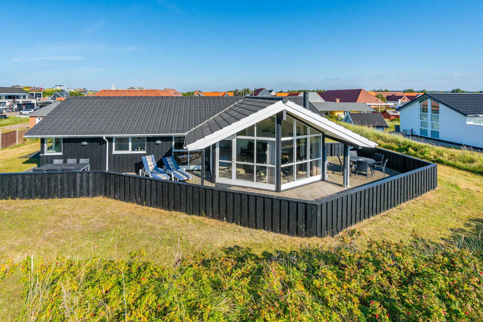 Auf einem schönen Dünengrundstück, nur 2 Gehminuten von Henne Strands Ortskern entfernt, liegt dieses Qualitätsferienhaus. Die große Fensterfront garantiert einen herrlichen Lichteinfall im Aufenthaltsbereich. Das Haus ist mit Sauna, Whirlpool ausgestattet. Zum Haus gehören mehrere schöne, ungestörte Terrassen, auf denen man immer eine vor dem Wind geschützte Ecke finden kann.