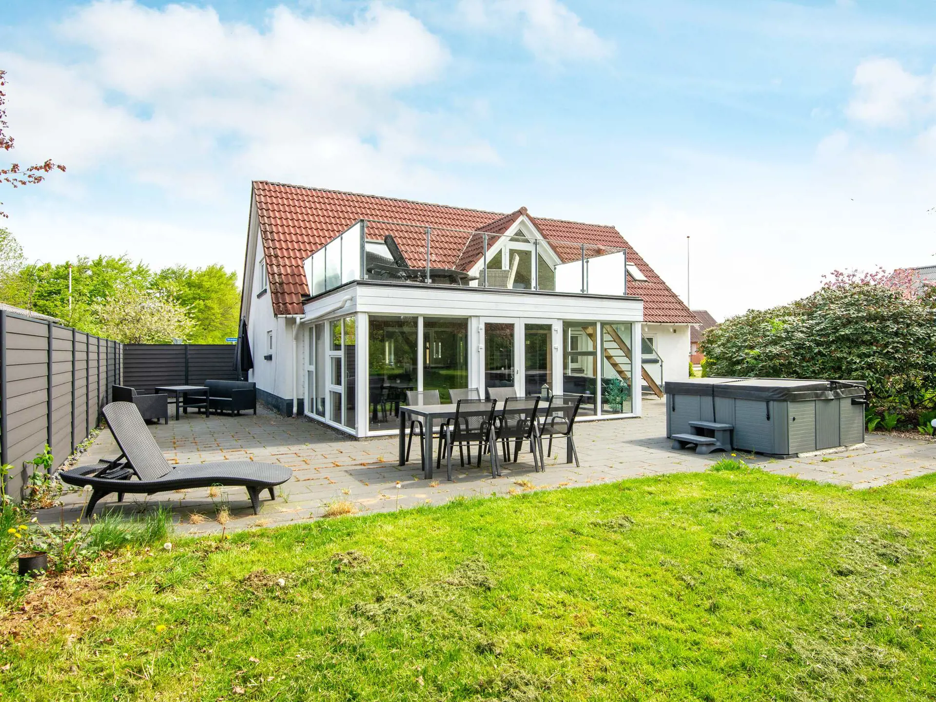 Privater Garten: Das Ferienhaus verfügt über mehrere schöne Terrassen, die das Leben im Freien zu einem natürlichen Teil des Urlaubs machen. Große Terrasse mit Whirlpool. Großer Wintergarten mit Infrarotsauna. Im 1. Stock befindet sich eine große Balkonterrasse mit direktem Zugang zum Garten. Zusätzlich gibt es einen Gemeinschaftsgarten (gemeinsam mit Haus 71b), der auch gemietet werden kann, wenn mehrere Personen zusammen Urlaub machen (bis maximal 20 Personen).