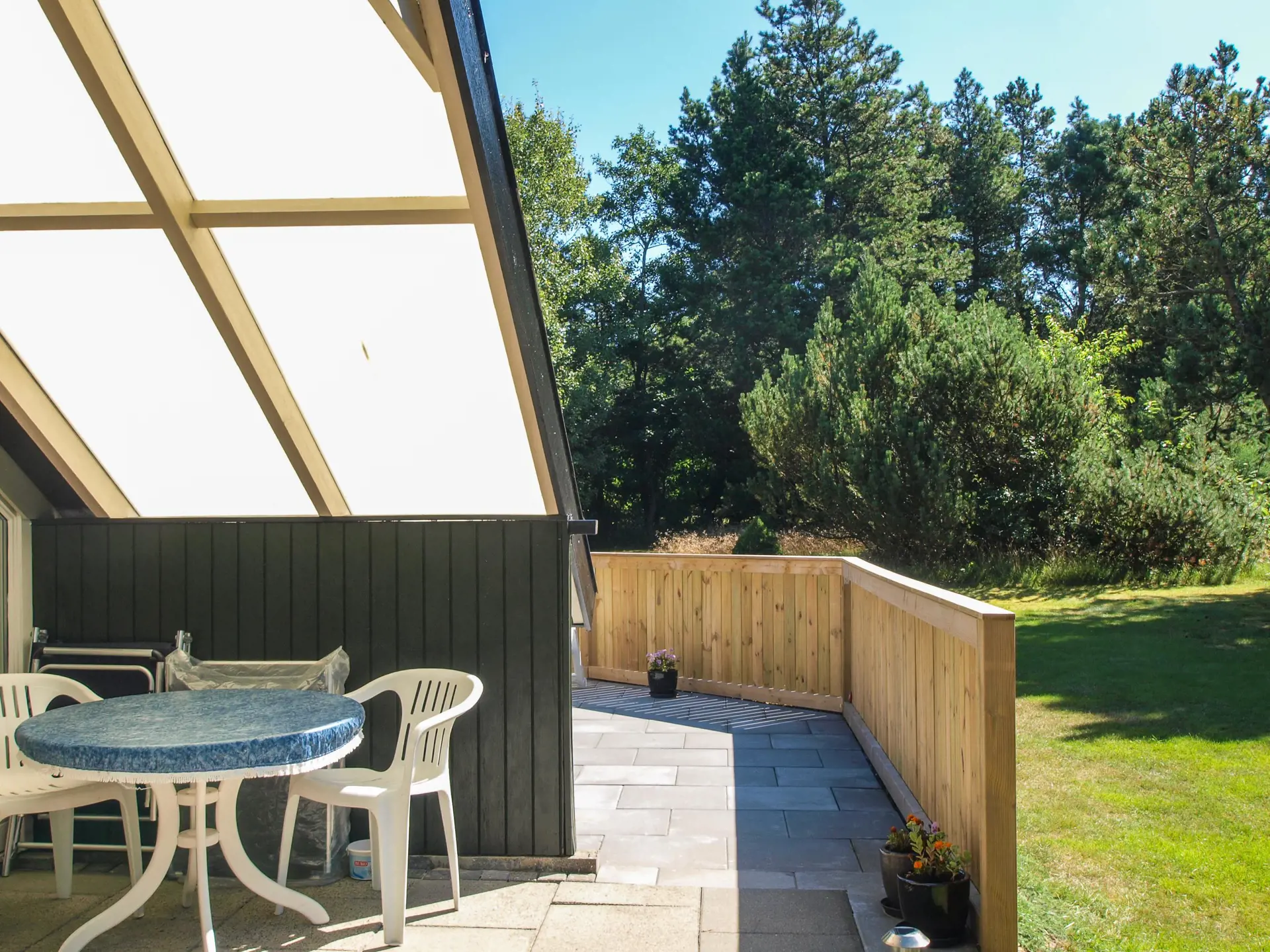 Vom Wohnraum aus habt ihr Zugang zur Terrasse, die mit einem lichtdurchlässigen Dach versehen ist. Hier könnt ihr gemütlich und trocken sitzen, auch wenn die Sonne einmal in Strömen lacht.