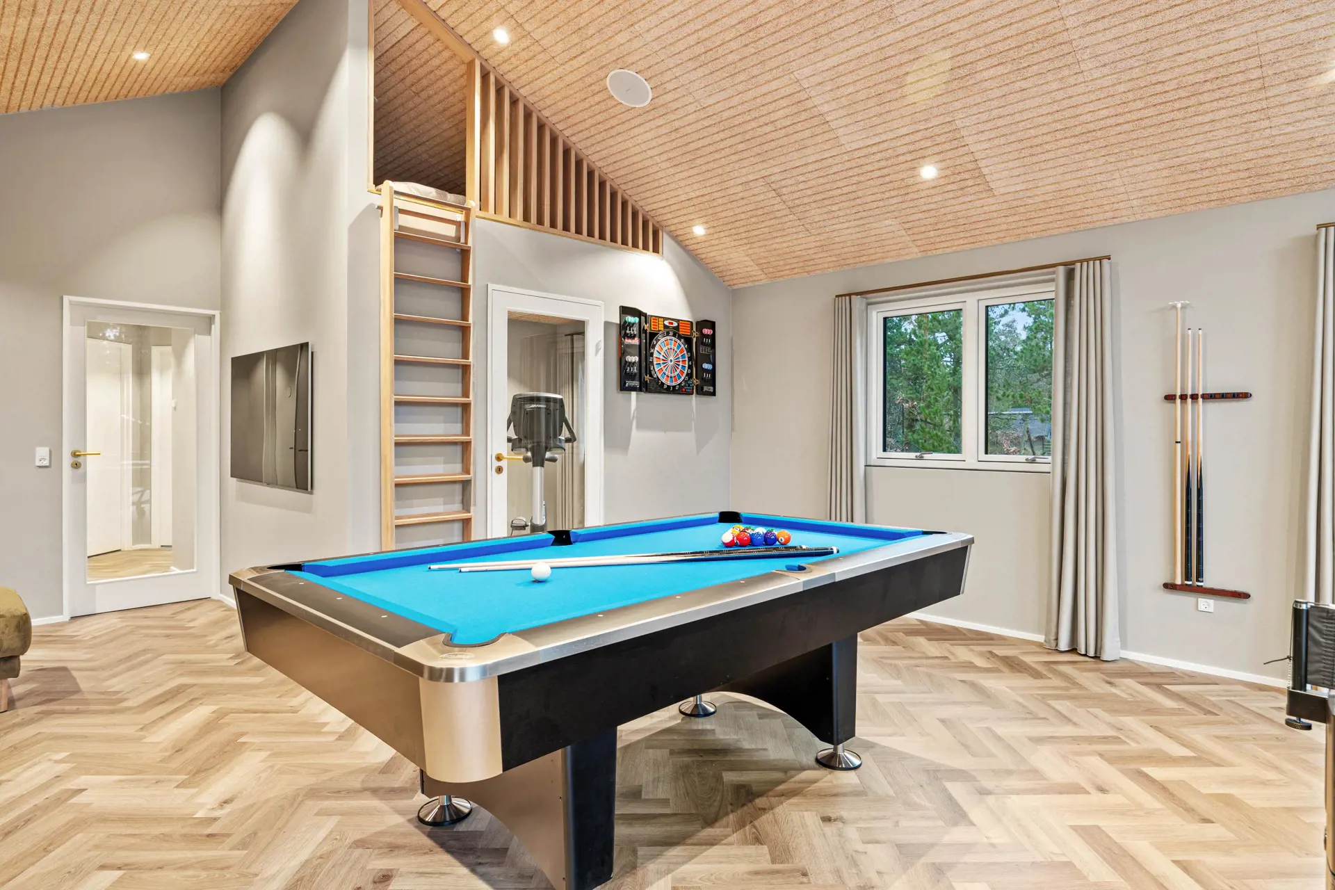 Eines der Highlights des Ferienhauses ist der 24 m² große Swimmingpool, der mit einer innovativen Gegenstromanlage ausgestattet ist. Ob ihr sportlich einige Bahnen ziehen oder einfach nur planschen wollt – dieser Pool bietet alles, was das Herz begehrt. Im Aktivitätsraum könnt ihr weitere sportliche Duelle ausfechten, ob beim Poolbillard oder beim Tischtennis.