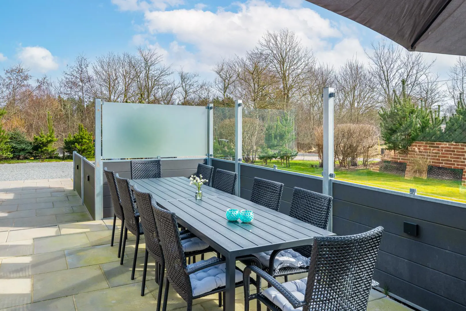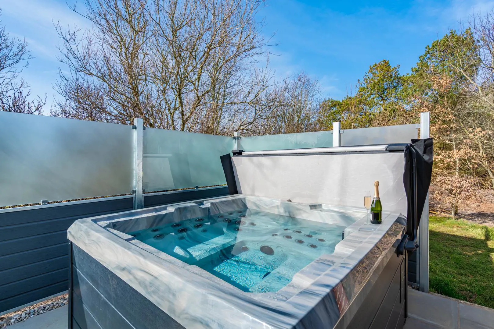 Auf der schönen Terrasse wartet ein echtes Highlight: der Außen-Whirlpool, der zu entspannten Abenden unter freiem Himmel einlädt. Direkt daneben befindet sich eine Außendusche, perfekt nach einem Saunagang oder einem Tag am Strand.