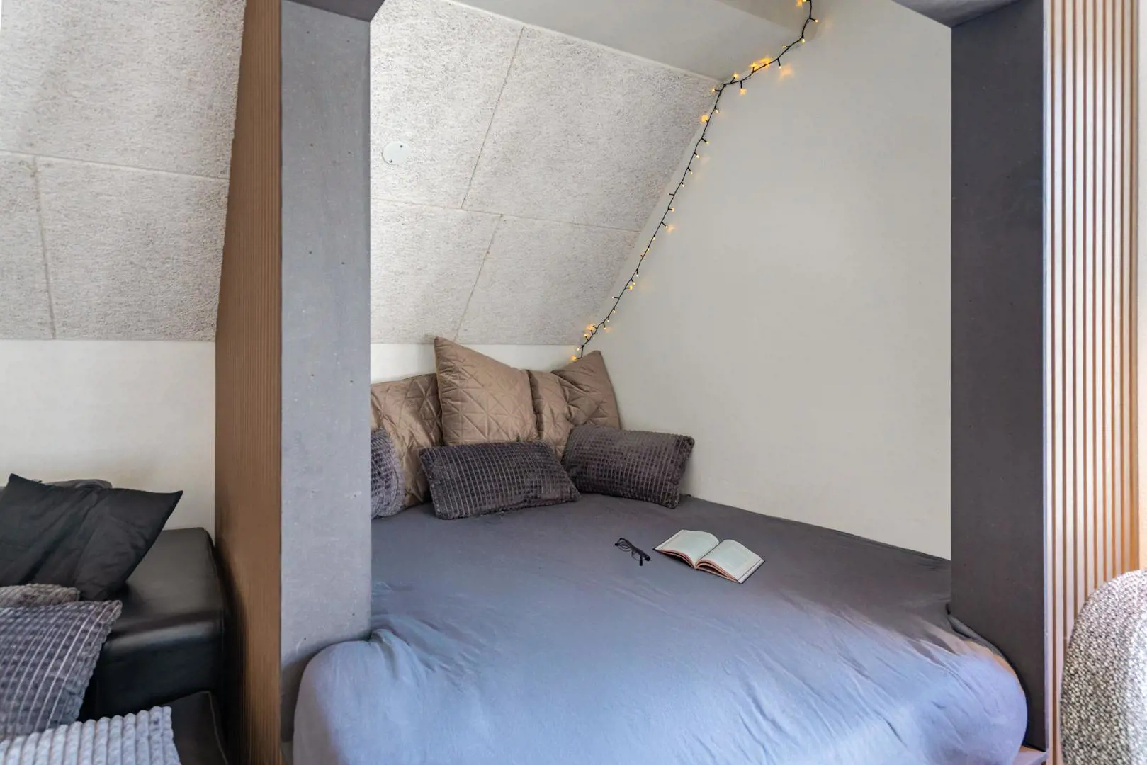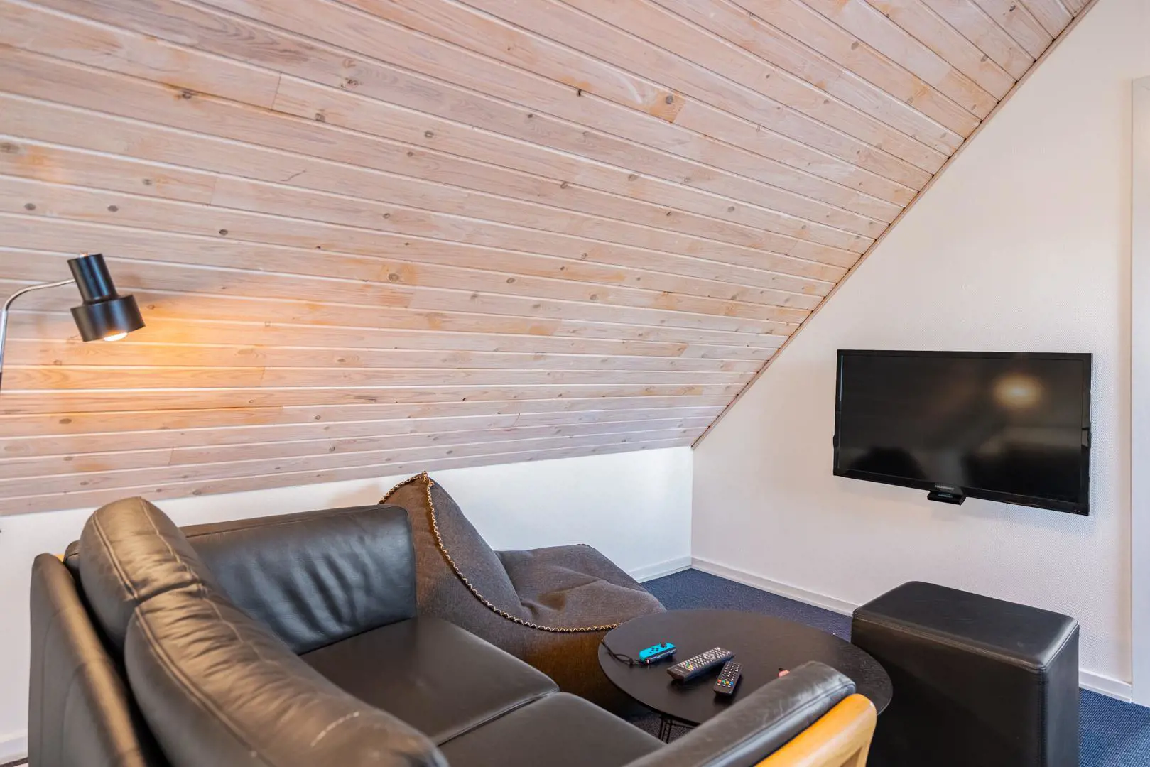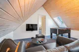 Im gemütlichen Wohnzimmer sorgt ein Kamin für echte Ferienhausstimmung, während eine energiesparende Wärmepumpe ganzjährig für angenehme Temperaturen sorgt. Vom Wohnbereich aus hast du direkten Zugang zur Terrasse, sodass drinnen und draußen nahtlos ineinander über gehen.