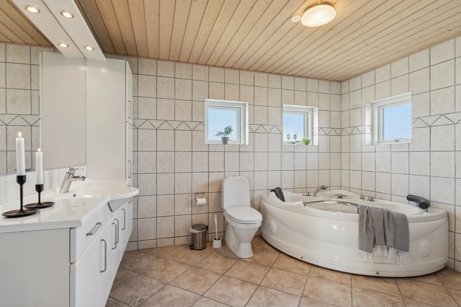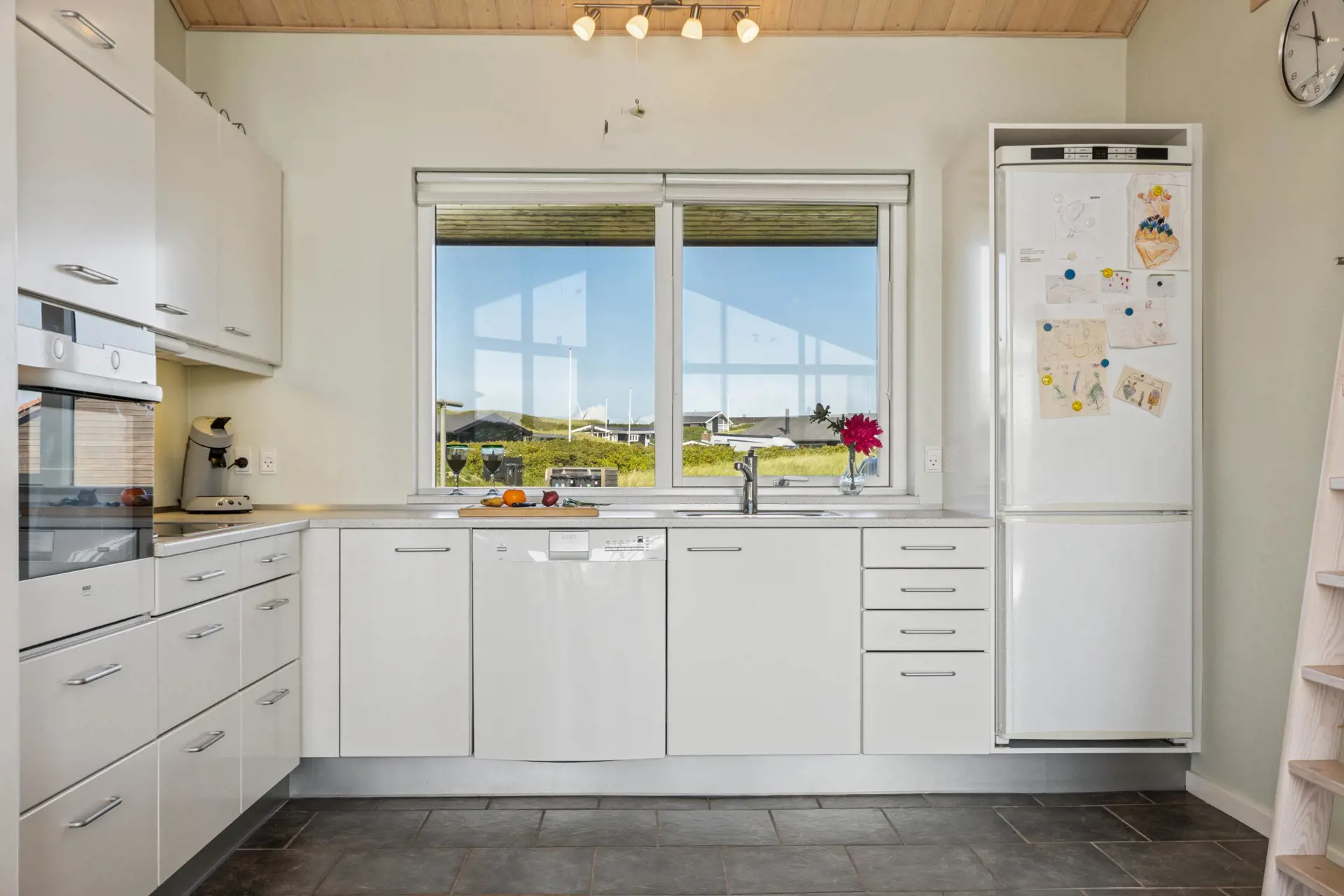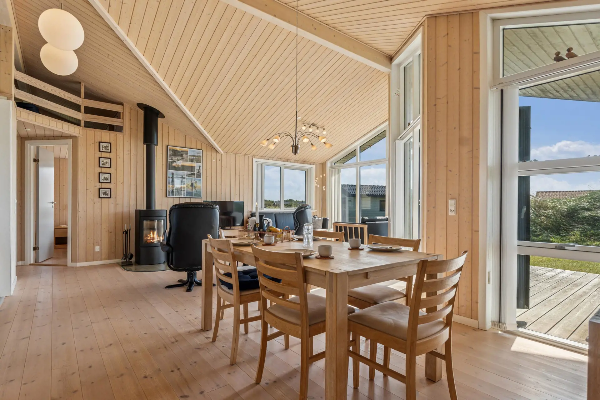 Das Ferienhaus bietet Platz für bis zu sechs Personen, verteilt auf drei Schlafzimmer mit Doppelbetten. Es gibt zwei elegante Badezimmer, beide mit Fußbodenheizung, sowie ein helles Wohnzimmer mit Holzboden, Wärmepumpe, Elektroheizung und einem gemütlichen Kaminofen. Für Familien mit Kindern steht zudem ein Hochstuhl zur Verfügung. Die Küche ist vollständig ausgestattet und bietet alles, was Sie für die Zubereitung von Mahlzeiten während Ihres Aufenthalts benötigen. Zur Ausstattung gehören ein Kühl-/Gefrierschrank, Backofen, Kochplatten, Mikrowelle, Kaffeemaschine, Wasserkocher und Geschirrspüler. Eine Waschmaschine ist ebenfalls vorhanden, sodass auch die praktischen Dinge des Alltags während des Urlaubs problemlos erledigt werden können.