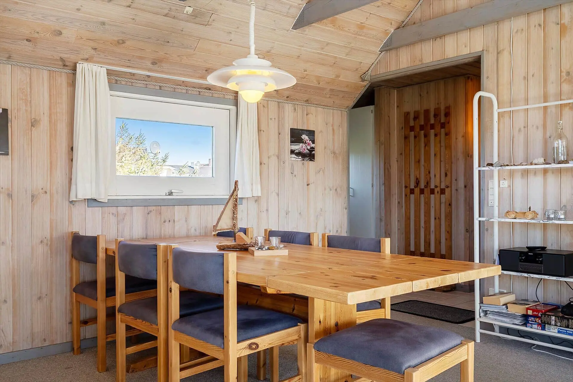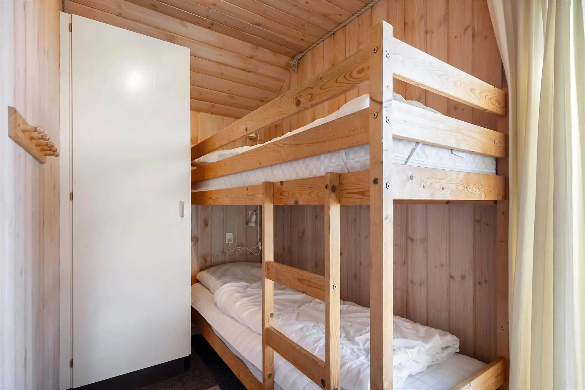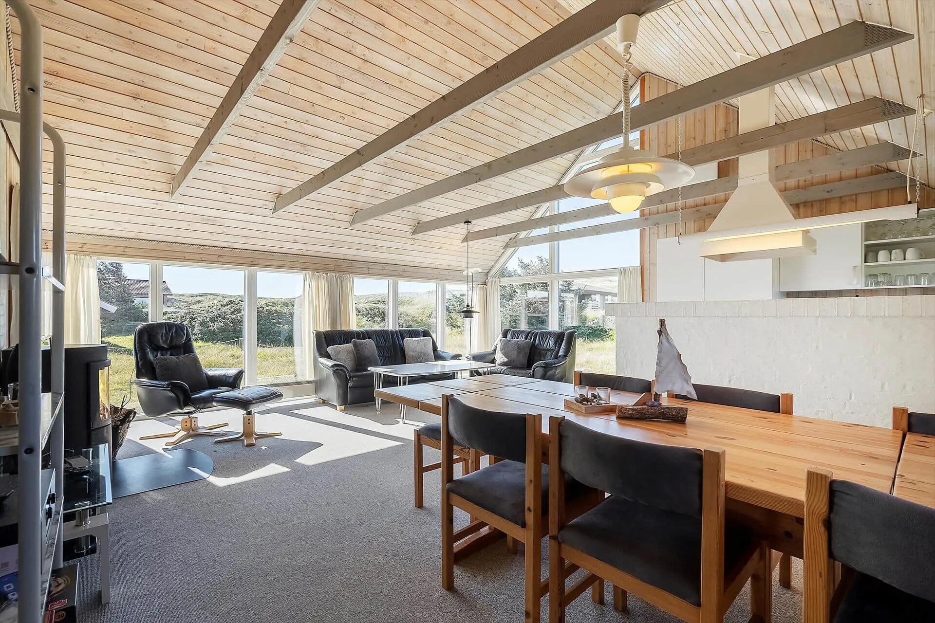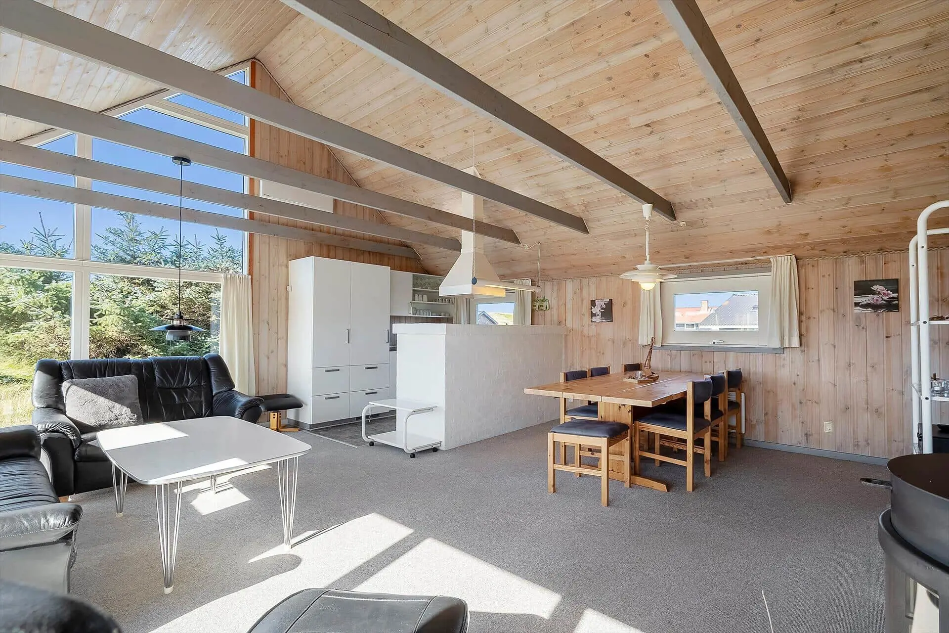 Im Inneren wirst du von einem großen, hellen und einladenden Wohn-Essbereich empfangen, in dem Küche, Essplatz und Wohnzimmer zu einer offenen Einheit verschmelzen. Die großen Fenster lassen das Licht herrlich hereinströmen und dies gibt dir das gute Gefühl, mitten in der Natur zu sein. Wenn der Abend hereinbricht, sorgt der Kaminofen für wohlige Wärme, während ihr euch mit Gesellschaftsspielen oder einem schönen Film auf dem Sofa entspannt. Von den drei Schlafzimmern hat jedes seinen Charme - zwei davon sind mit Doppelbetten bestückt und das dritte mit einem Etagenbett. Dieses werden die Kinder als ihren eigenen kleinen Freiraum wirklich lieben. Die Teppichböden im Wohnzimmer und in den Schlafzräumen schaffen eine wohlige Atmosphäre – schmeißt einfach Jacken und Schuhe und ihr fühlt euch von Anfang an absolut zuhause. Hier findet ihr den idealen Rahmen für Erholung und gemeinsame Zeit mit euren Liebsten.