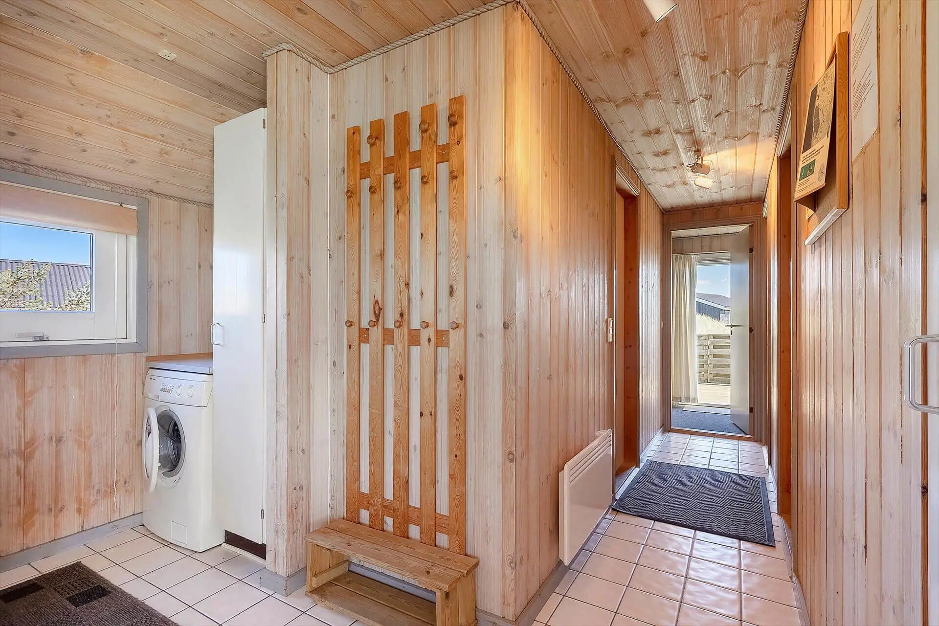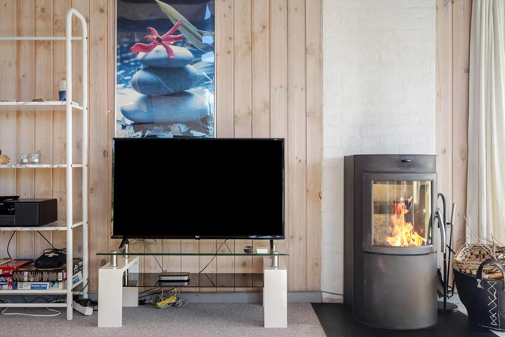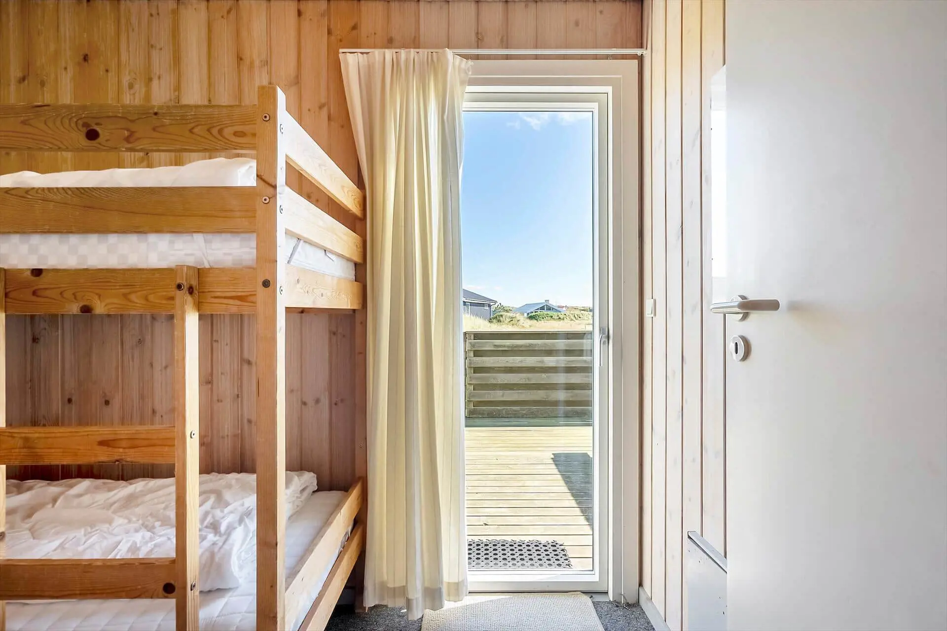 Im Inneren wirst du von einem großen, hellen und einladenden Wohn-Essbereich empfangen, in dem Küche, Essplatz und Wohnzimmer zu einer offenen Einheit verschmelzen. Die großen Fenster lassen das Licht herrlich hereinströmen und dies gibt dir das gute Gefühl, mitten in der Natur zu sein. Wenn der Abend hereinbricht, sorgt der Kaminofen für wohlige Wärme, während ihr euch mit Gesellschaftsspielen oder einem schönen Film auf dem Sofa entspannt. Von den drei Schlafzimmern hat jedes seinen Charme - zwei davon sind mit Doppelbetten bestückt und das dritte mit einem Etagenbett. Dieses werden die Kinder als ihren eigenen kleinen Freiraum wirklich lieben. Die Teppichböden im Wohnzimmer und in den Schlafzräumen schaffen eine wohlige Atmosphäre – schmeißt einfach Jacken und Schuhe und ihr fühlt euch von Anfang an absolut zuhause. Hier findet ihr den idealen Rahmen für Erholung und gemeinsame Zeit mit euren Liebsten.
