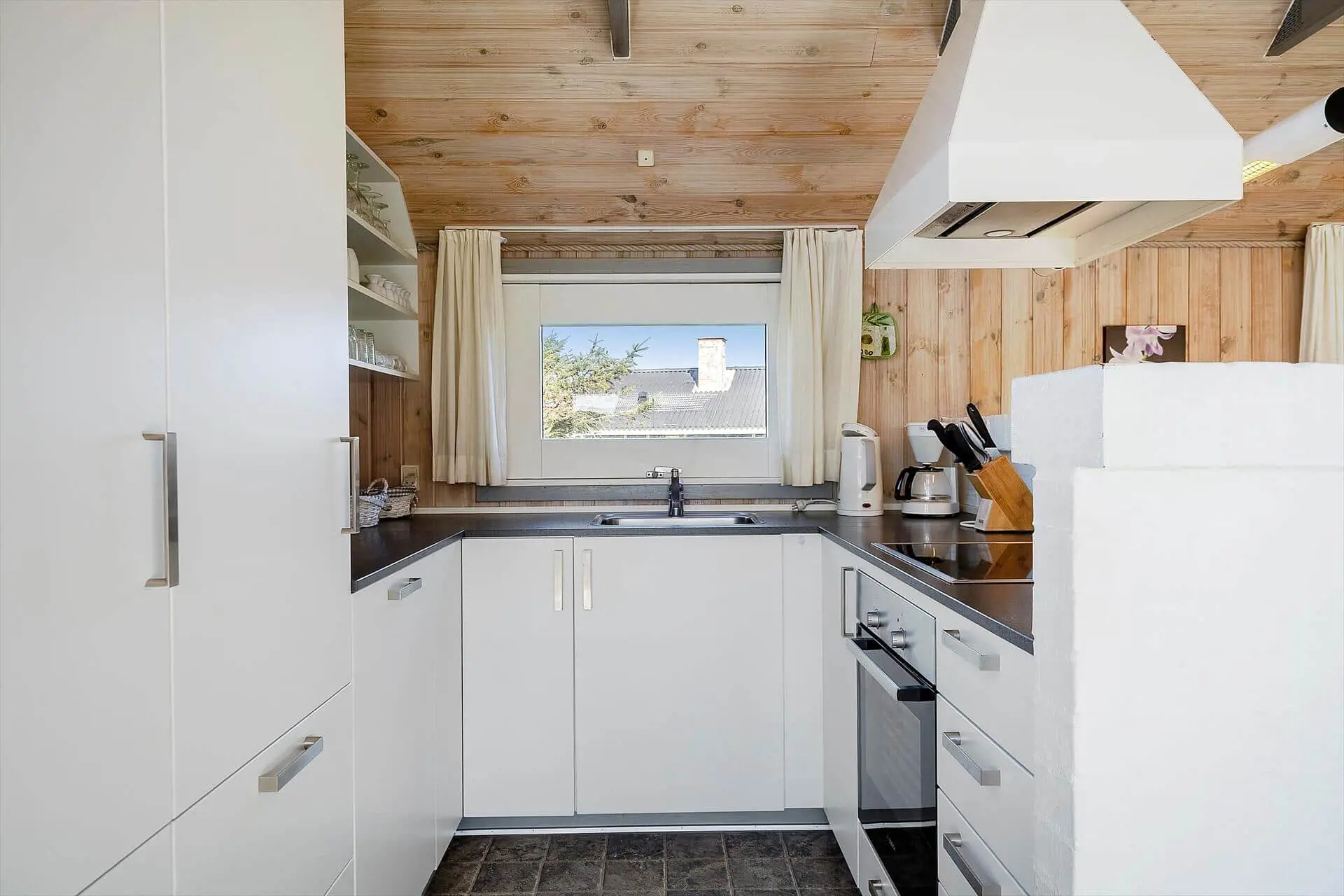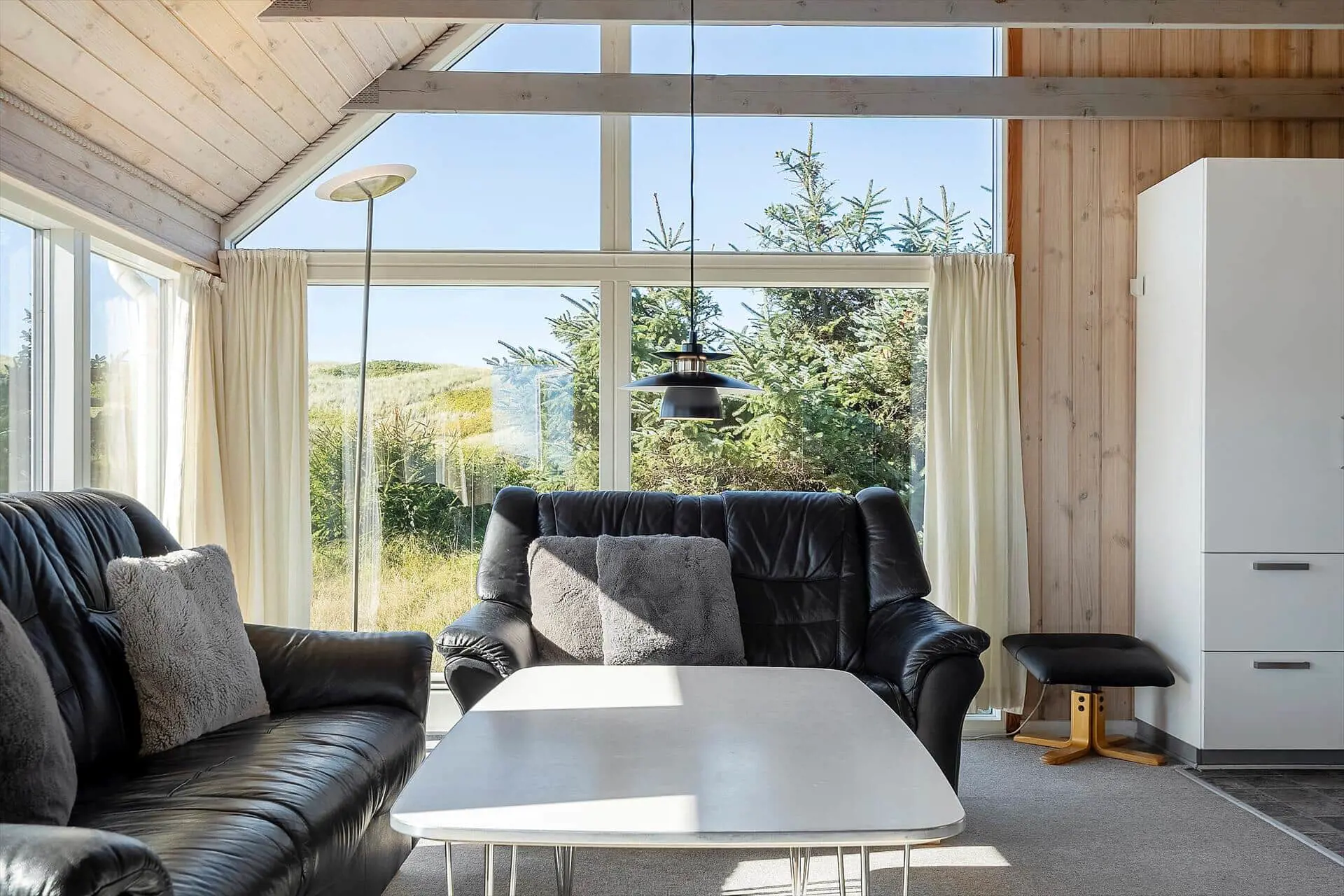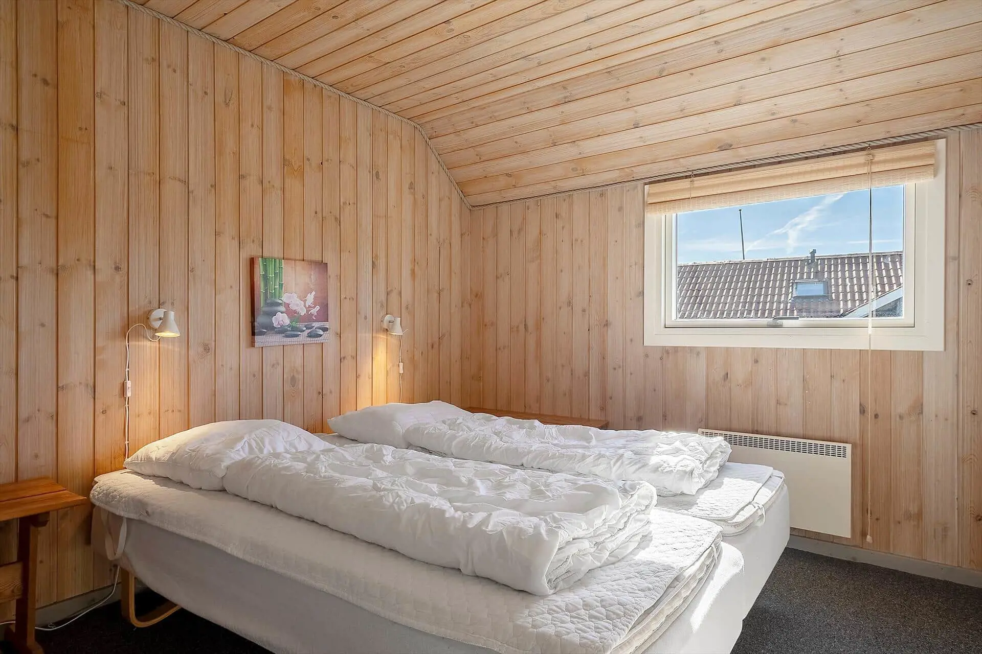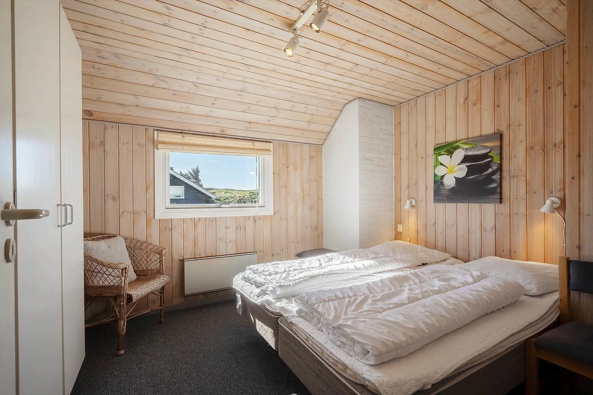 Im Inneren wirst du von einem großen, hellen und einladenden Wohn-Essbereich empfangen, in dem Küche, Essplatz und Wohnzimmer zu einer offenen Einheit verschmelzen. Die großen Fenster lassen das Licht herrlich hereinströmen und dies gibt dir das gute Gefühl, mitten in der Natur zu sein. Wenn der Abend hereinbricht, sorgt der Kaminofen für wohlige Wärme, während ihr euch mit Gesellschaftsspielen oder einem schönen Film auf dem Sofa entspannt. Von den drei Schlafzimmern hat jedes seinen Charme - zwei davon sind mit Doppelbetten bestückt und das dritte mit einem Etagenbett. Dieses werden die Kinder als ihren eigenen kleinen Freiraum wirklich lieben. Die Teppichböden im Wohnzimmer und in den Schlafzräumen schaffen eine wohlige Atmosphäre – schmeißt einfach Jacken und Schuhe und ihr fühlt euch von Anfang an absolut zuhause. Hier findet ihr den idealen Rahmen für Erholung und gemeinsame Zeit mit euren Liebsten.