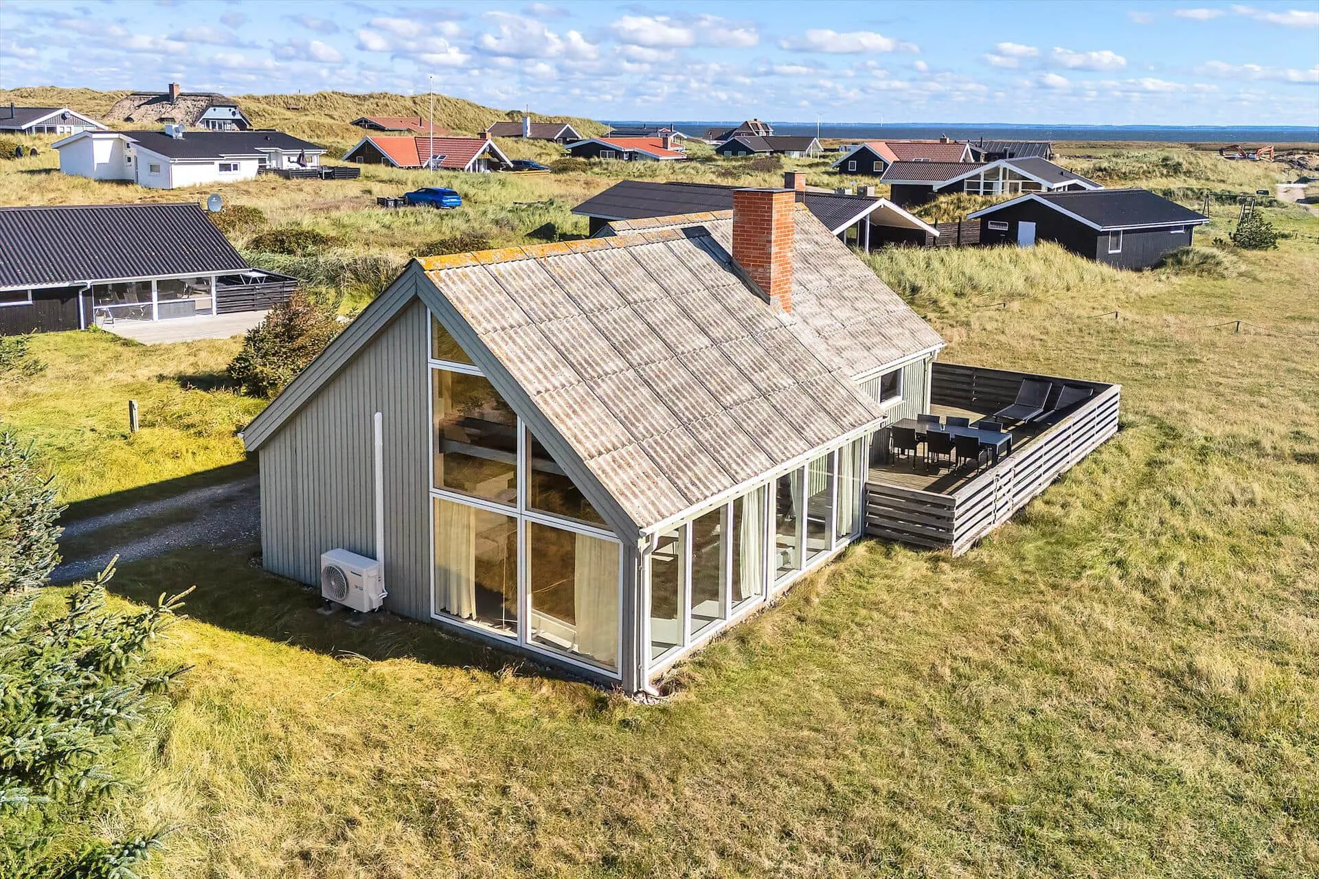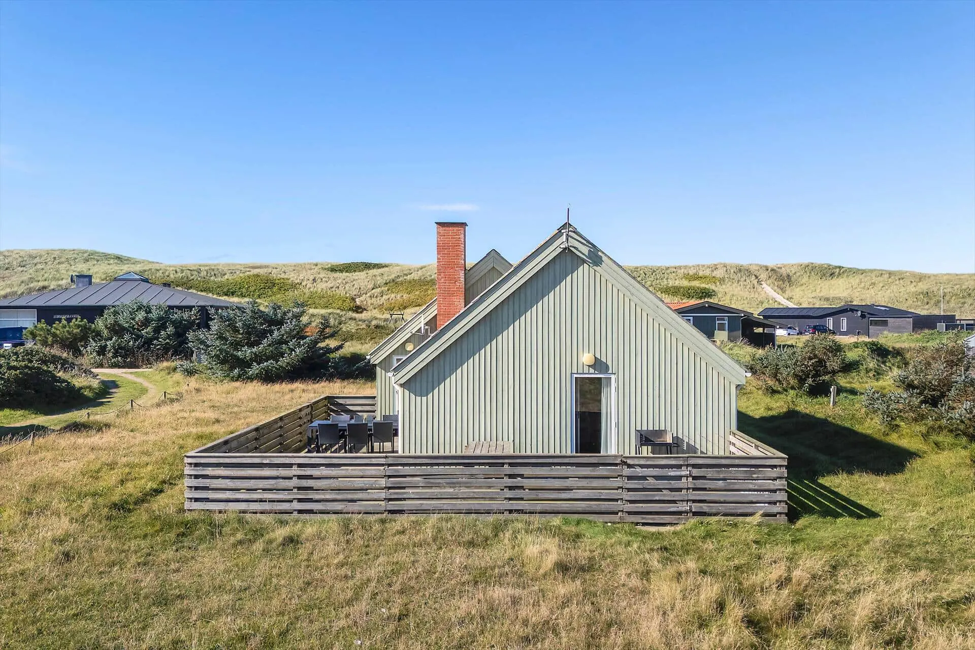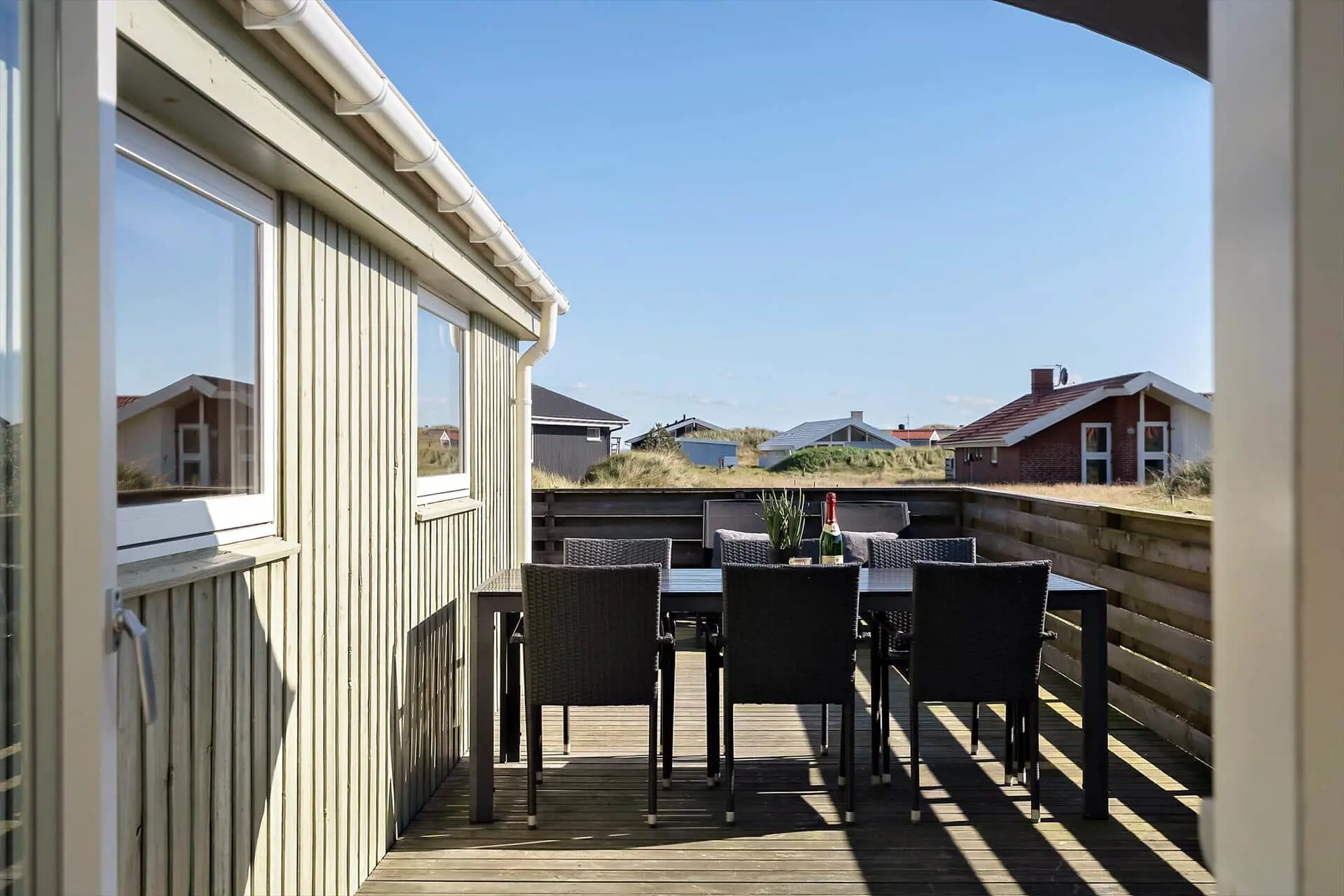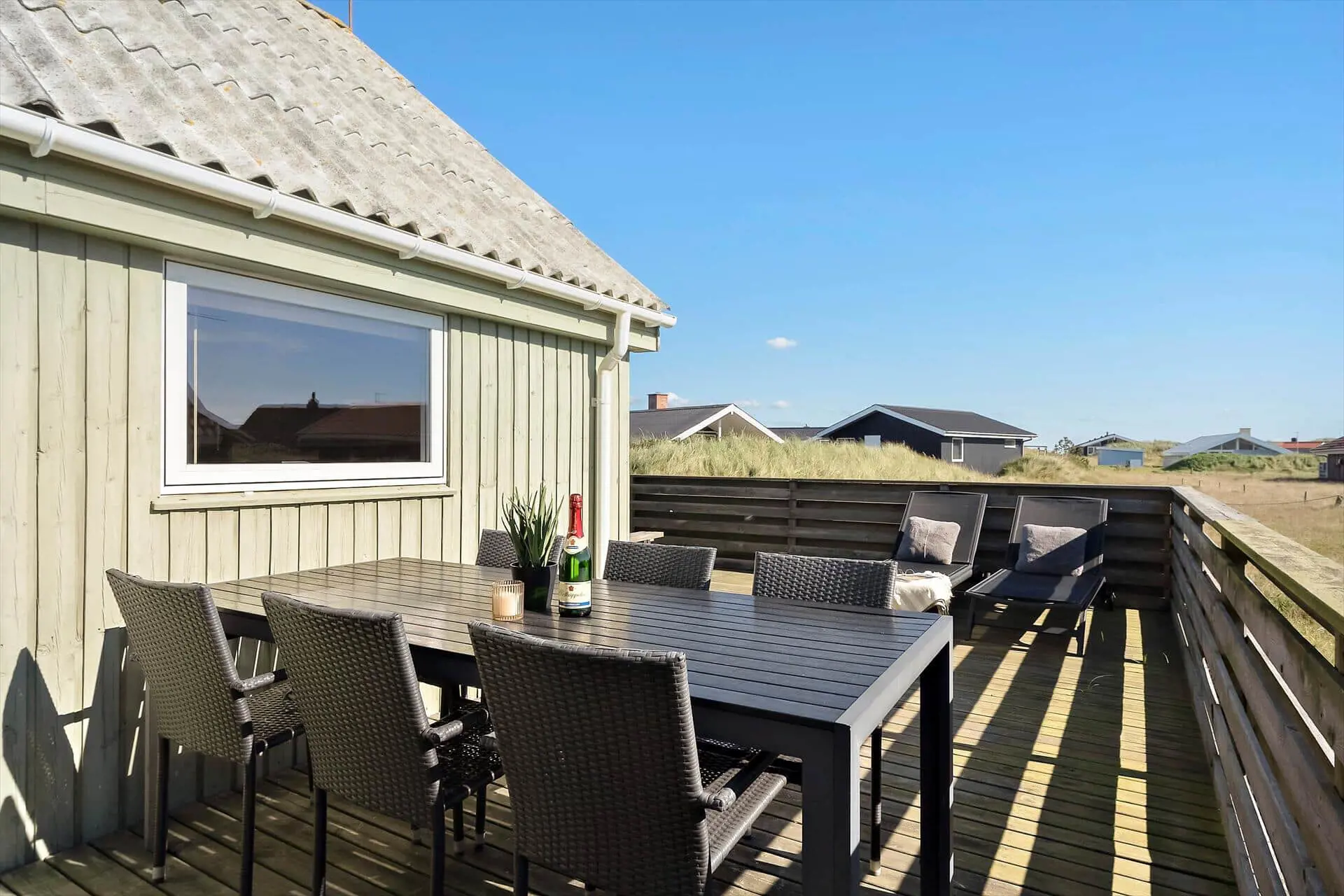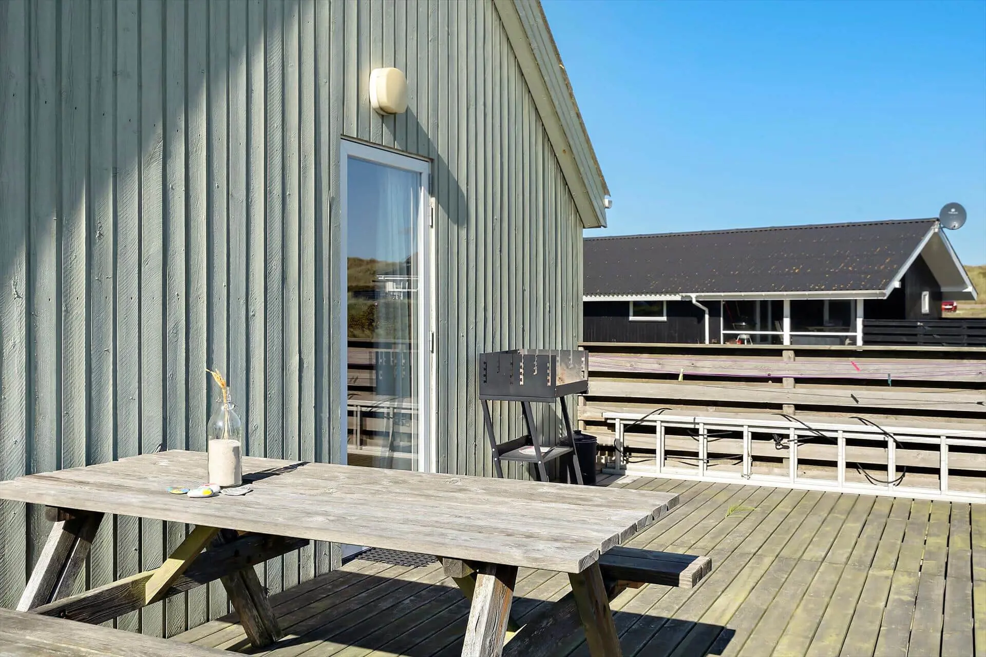 Die geschlossene Terrasse des Ferienhauses ist zweifellos eines der Highlights. Für Familien mit Kindern bedeutet diese eine gute Portion an Ruhe und Sicherheit, denn hier können die Jüngsten frei spielen, ohne dass ihr euch Sorgen machen müsst, wo die Kleinen abbleiben könnten. Für alle wird die Terrasse schnell zum Mittelpunkt des Urlaubs: Startet den Tag mit frischem Kaffee und Brötchen in der Morgensonne, genießt euer Mittagessen windgeschützt im Freien und verbringt die Abende mit leckeren Gerichten vom Grill und geselligen Gesprächen unter dem Sternenhimmel. Der kleine Garten rund ums Haus bietet geschützte Ecken, in denen ihr euch zurückgezogen entspannen könnt, während im Hintergrund das Rauschen des Meeres die Stimmung begleitet. Wir bei Feriepartner Hvide Sande wissen, dass genau diese stillen Momente – wo ihr einfach Zeit habt, für- und miteinander da und zusammen zu sein – euren Urlaub unvergesslich machen.
