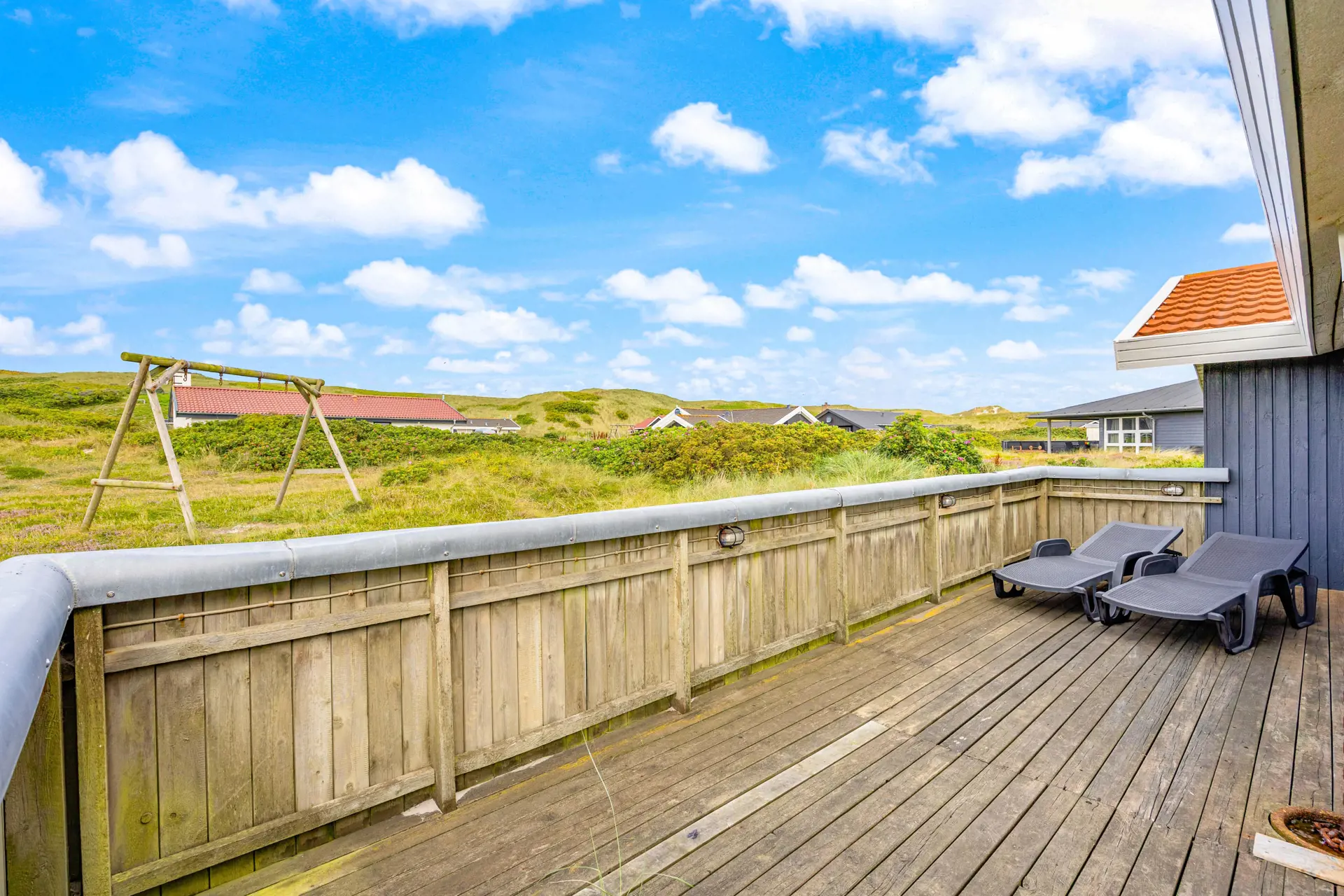 Auf gleich drei Seiten des Ferienhauses verläuft die geschlossene und teils überdachte Terrasse. Hier könnt ihr also mit der Sonne wandern und zu jeder Zeit einen Platz zum Entspannen finden. Genießt einen frisch gebrühten Kaffee und lasst euren Blick über das große Naturgrundstück und hin zu den Dünen schweifen. Sonnenliegen und bequeme Gartenmöbel laden zum Verweilen ein. Von hier aus könnt ihr sogar die nahe Nordsee rauschen hören.