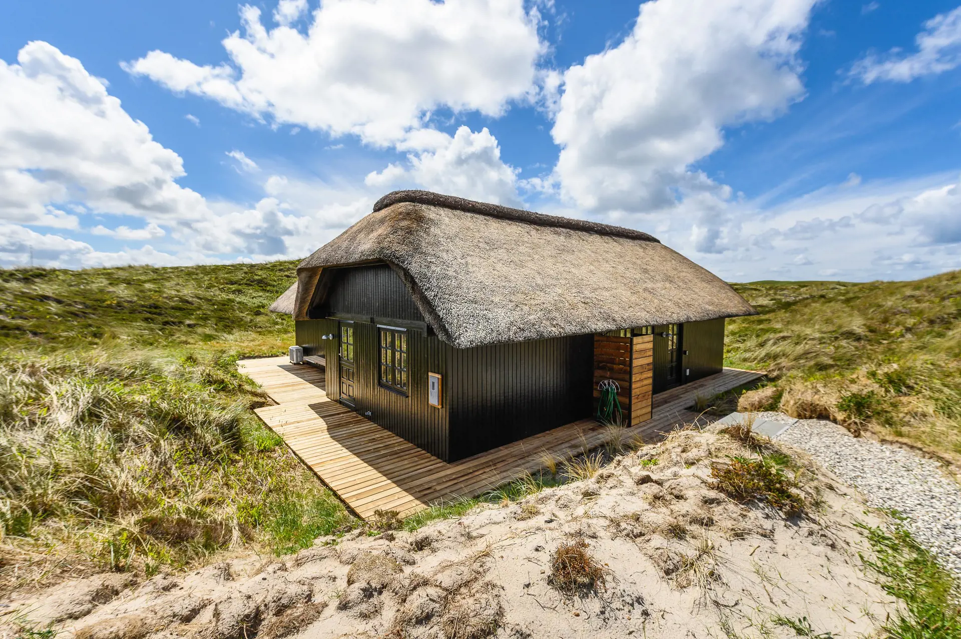 Die Terrasse umfasst das ganze Haus, damit jeder seinen Platz in der Sonne oder im Schatten finden kann. Von hier aus habt ihr einen tollen Blick auf die umliegenden Dünen und könnt einfach nur entspannen. Du kannst natürlich die Gartenmöbel draußen nutzen, um gemeinsam Kuchen zu essen oder abends draußen neben dem Grill zu essen.