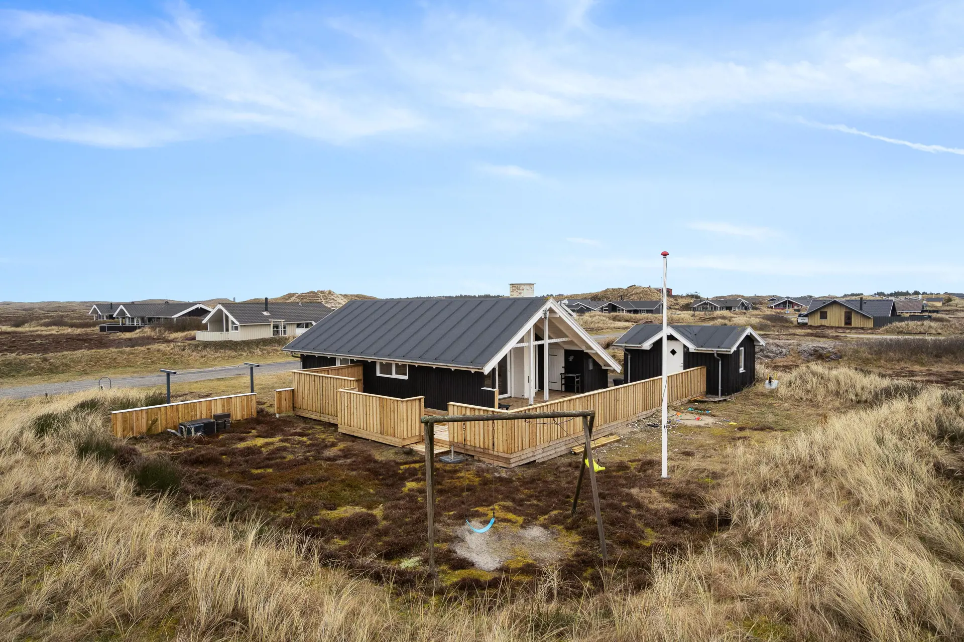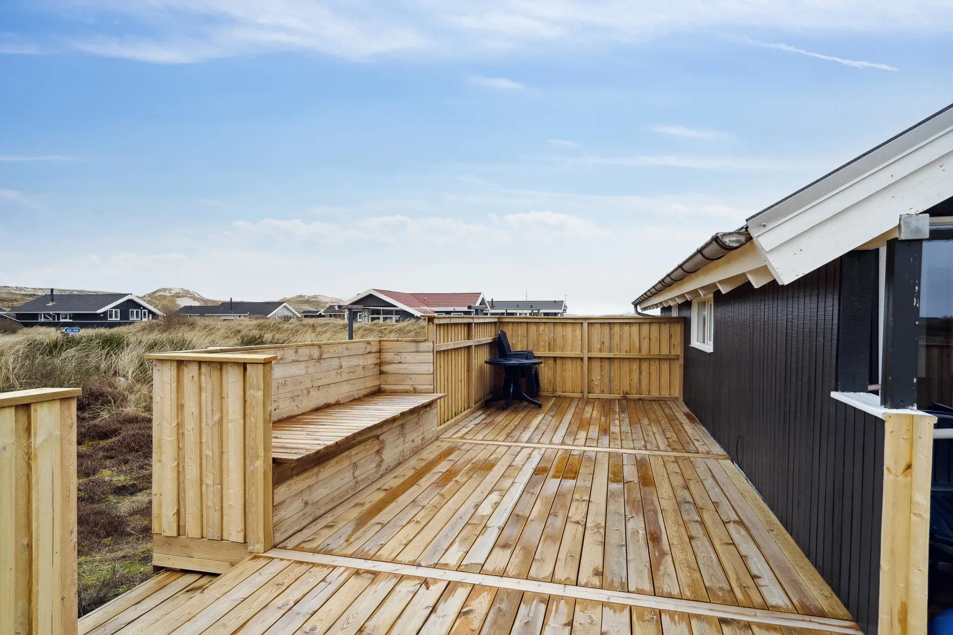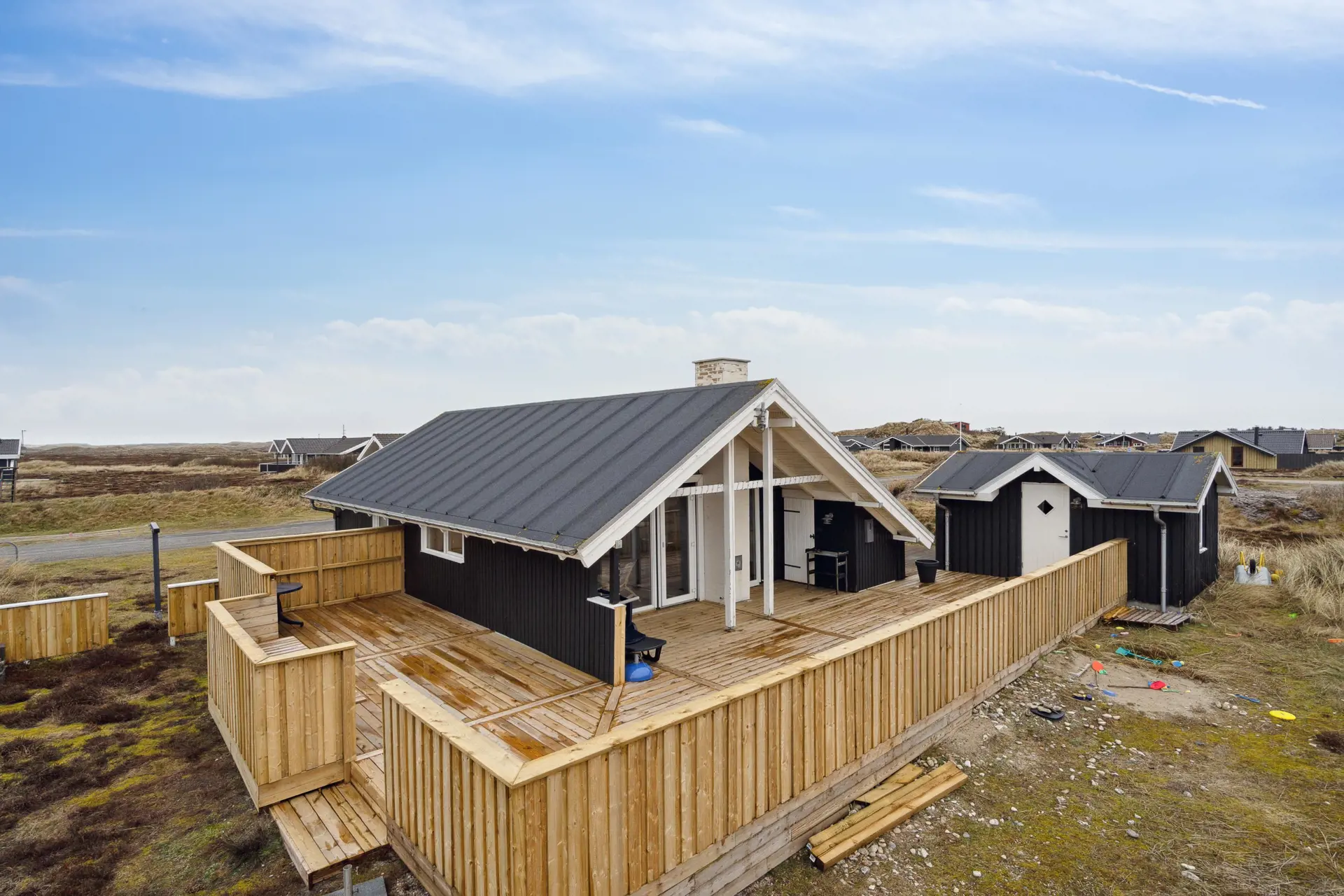 Euer schönes Ferienhaus ist von einem 1200 qm großen Naturgrundstück umgeben und liegt inmitten der hier so typischen Dünen- und Heidelandschaft. Auf zwei Seiten des Ferienhauses befindet sich eine teils abgeschirmte und teils überdachte Terrasse, die mit ihren bequemen Gartenmöbeln und Sonnenliegen zum Entspannen einlädt.