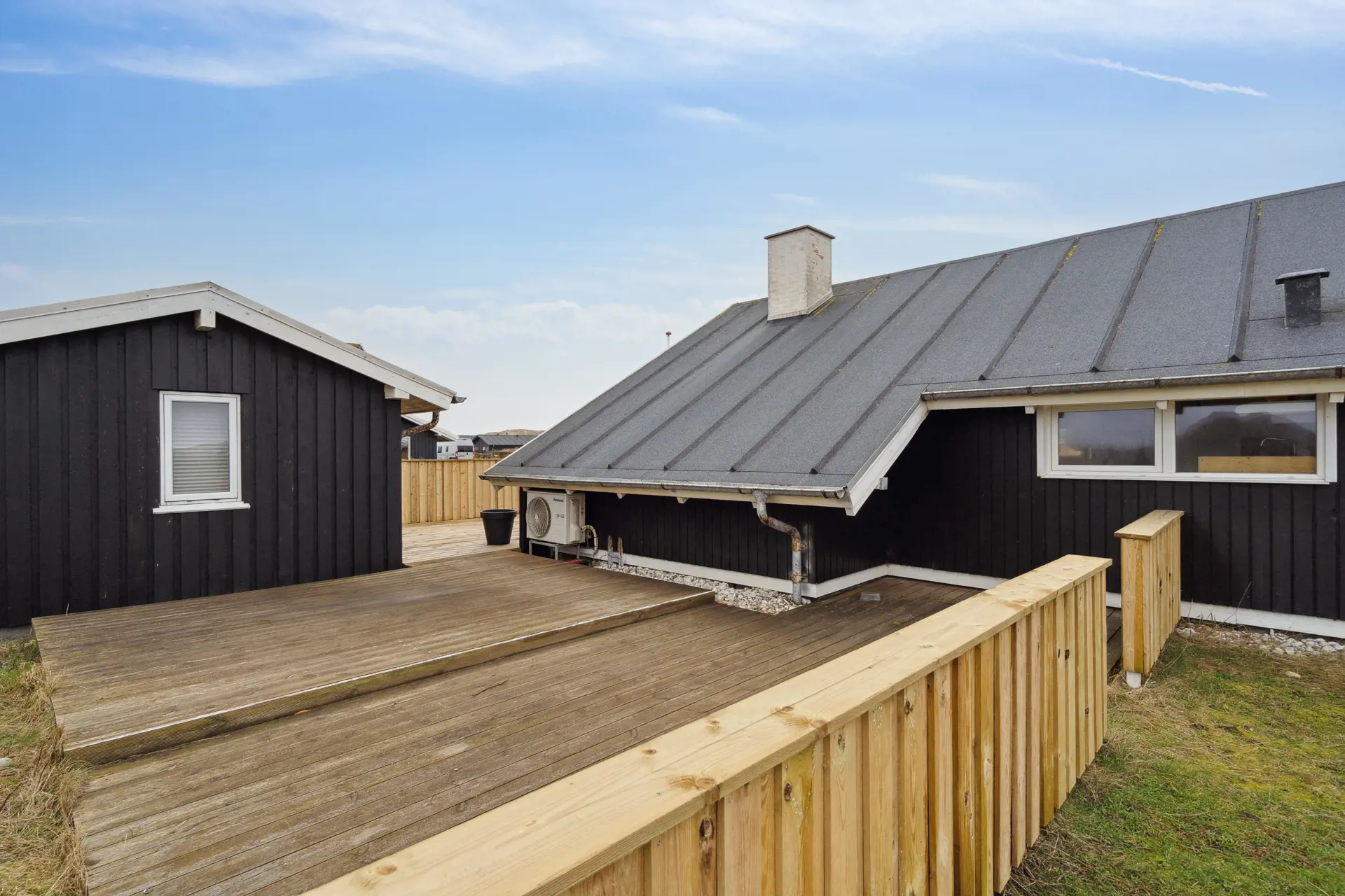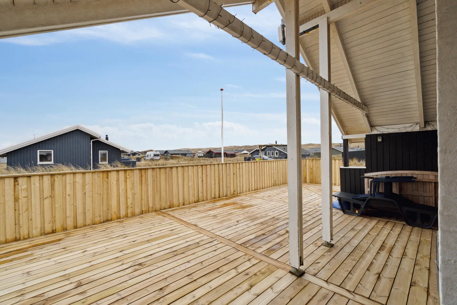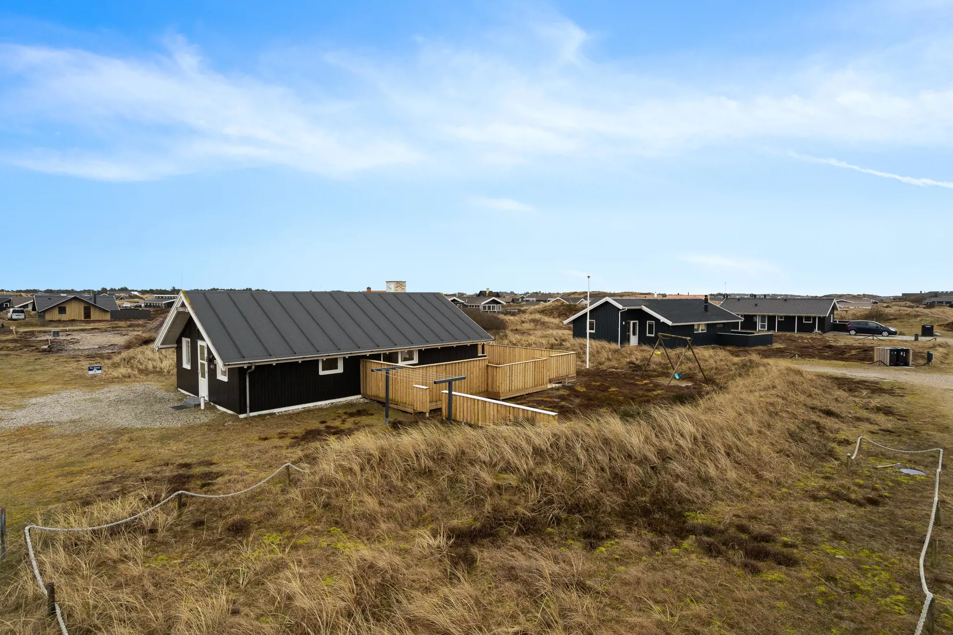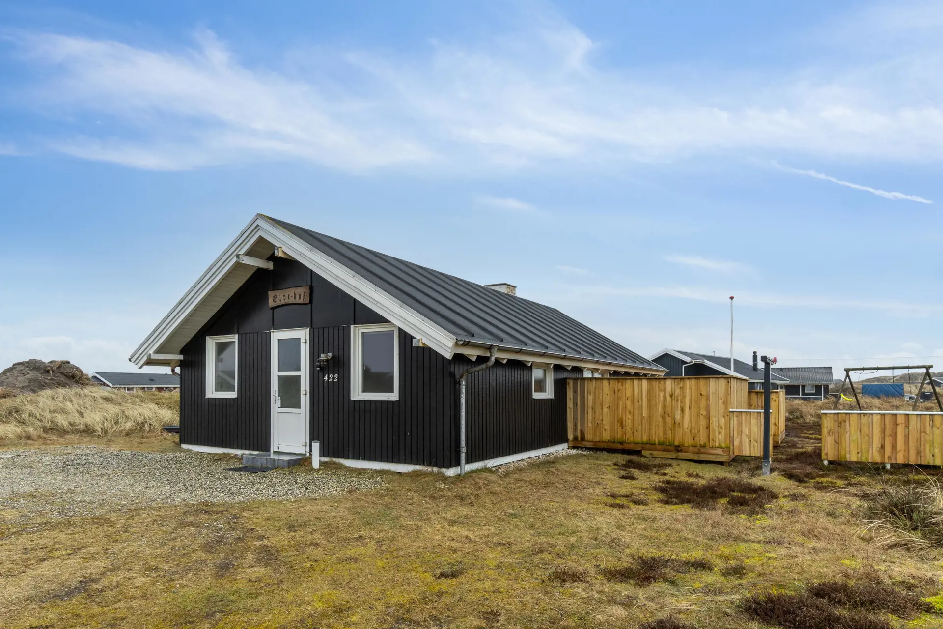 Euer schönes Ferienhaus ist von einem 1200 qm großen Naturgrundstück umgeben und liegt inmitten der hier so typischen Dünen- und Heidelandschaft. Auf zwei Seiten des Ferienhauses befindet sich eine teils abgeschirmte und teils überdachte Terrasse, die mit ihren bequemen Gartenmöbeln und Sonnenliegen zum Entspannen einlädt.