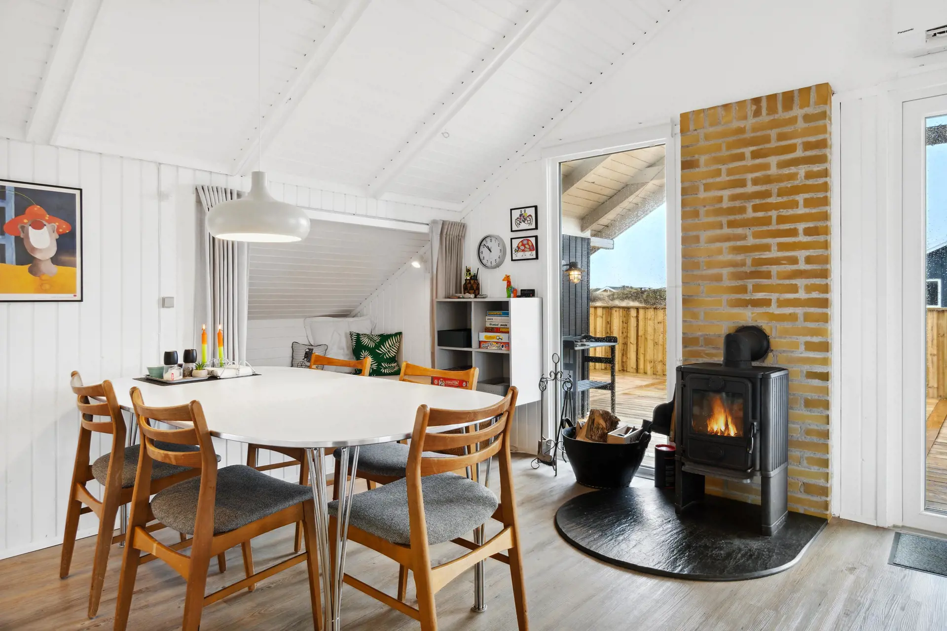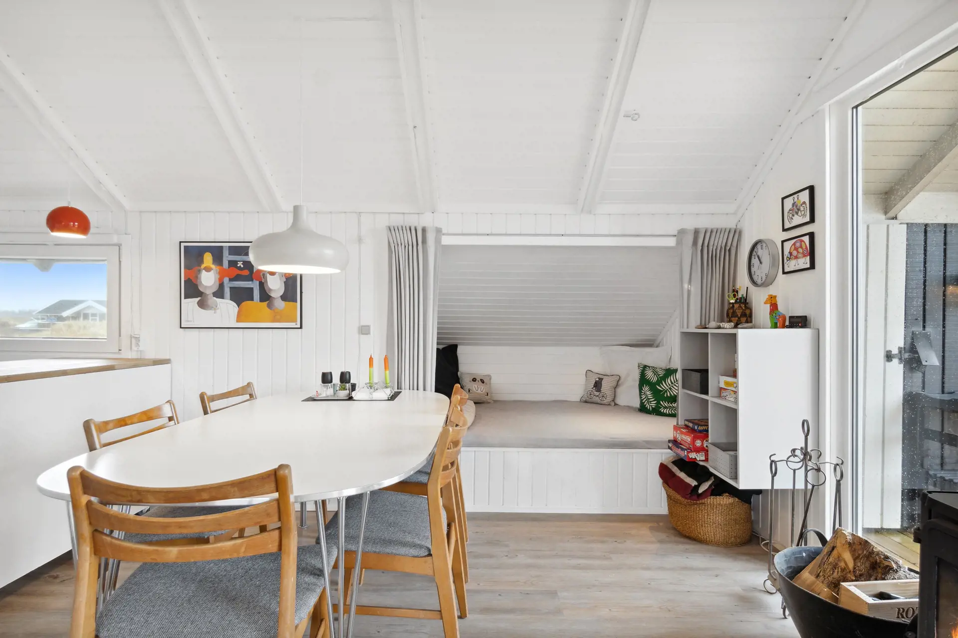 Im großzügigen Wohnraum findet ihr auch den Kamin, der für eine hyggelige Stimmung an kühlen Abenden sorgt. Aber auch die Wärmepumpe könnt ihr zum energiesparenden Heizen nutzen. So könnt ihr es euch auf dem Sofa oder in der kuscheligen Alkoven, mit dem Tagesbett, gemütlich machen.