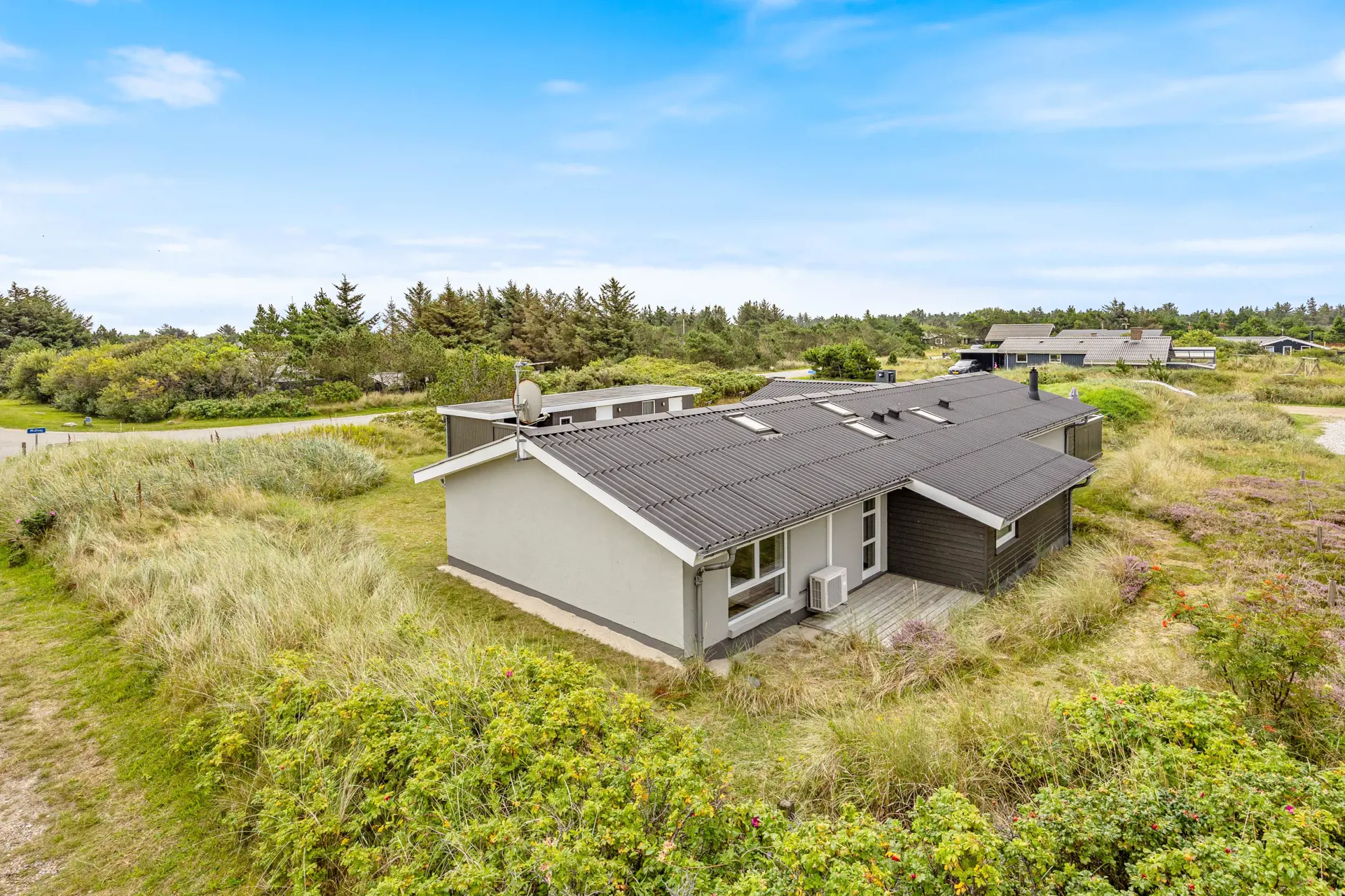 Direkt vom Wohnzimmer aus betretet ihr die abgeschirmte Terrasse, die euch windgeschützt und sonnig zugleich empfängt – der perfekte Ort für den ersten Kaffee am Morgen oder ein ruhiges Abendessen an der frischen Luft. Eine zweite, überdachte Terrasse bietet zusätzlichen Raum im Freien und lädt auch dann zum Verweilen ein, wenn das Wetter einmal nicht mitspielt. Rund um das Ferienhaus erwartet euch ein Naturgrundstück, das zum Spielen, Entdecken oder einfach zum Durchatmen einlädt – mit dem Duft von Heide und der typischen Landschaft der dänischen Westküste als stimmungsvolle Begleitung.