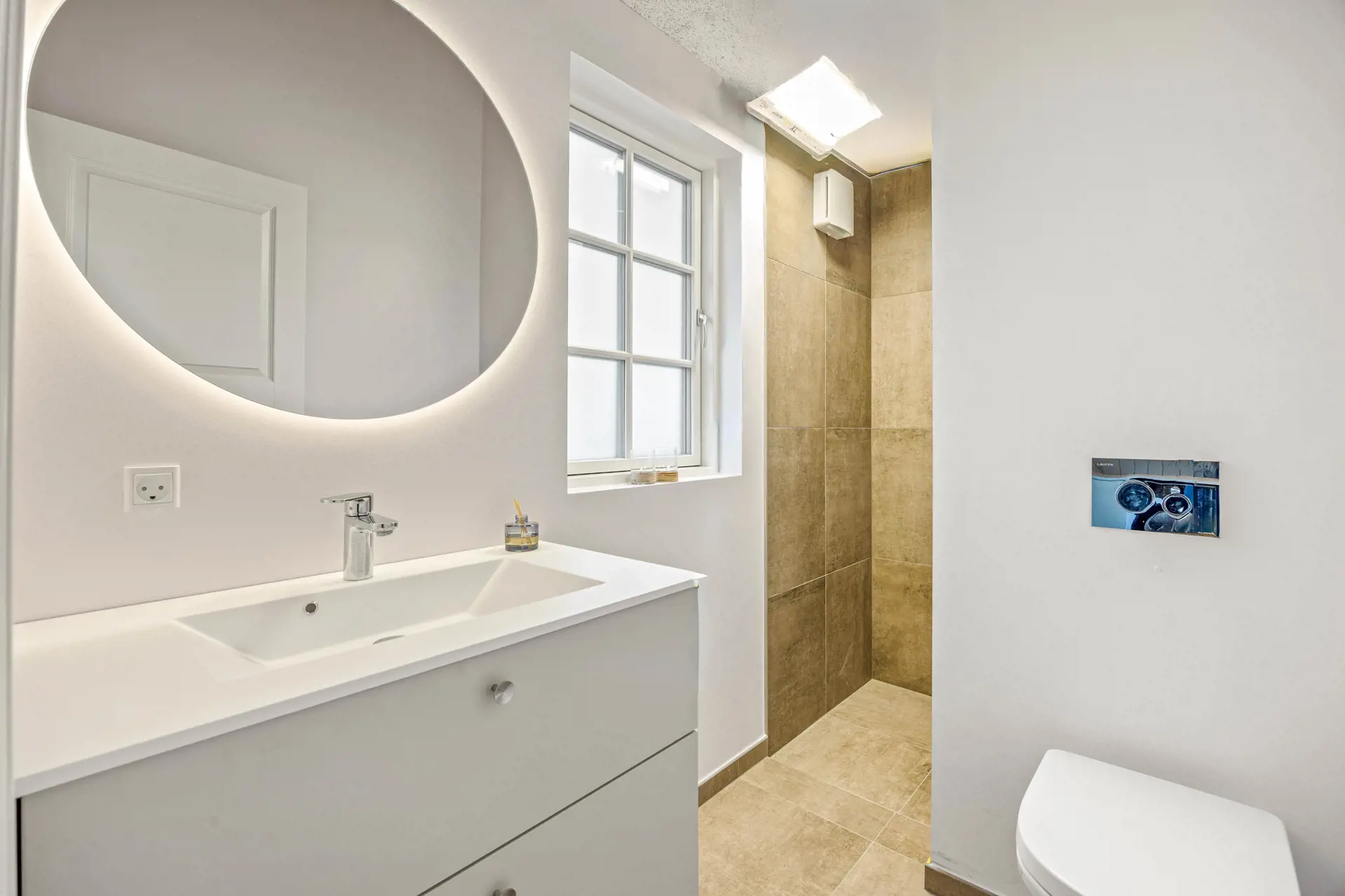 Mit 4 Schlafzimmern mit Doppelbetten (160 x 200 cm) und einem weiteren Zimmer mit 2 Einzelbetten (80 x 200 cm) bietet das Ferienhaus Platz für bis zu 10 Personen. 3 moderne Bäder – alle mit Fußbodenheizung – sorgen für Komfort im Alltag und ein angenehm warmes Gefühl an den Füßen.