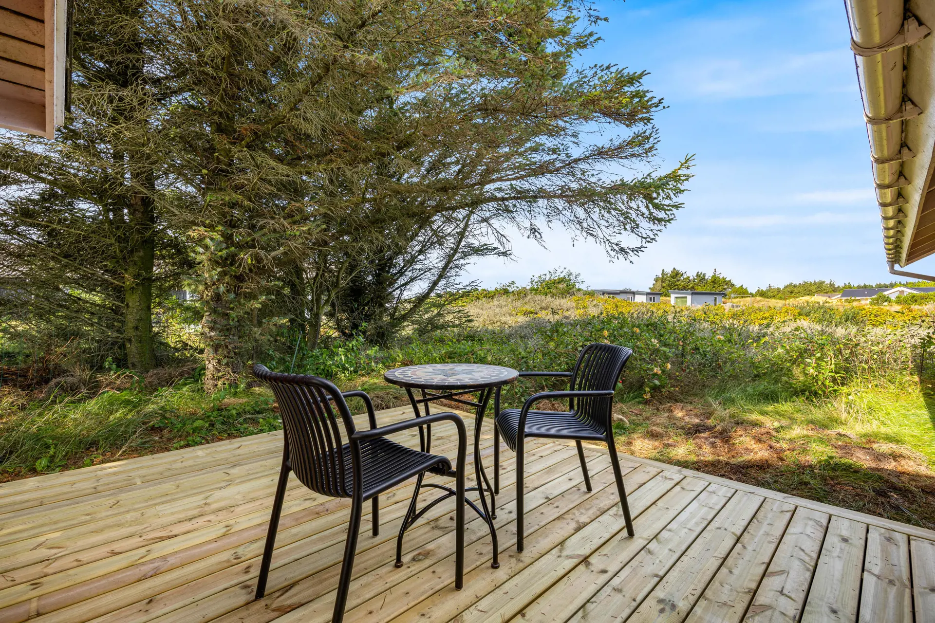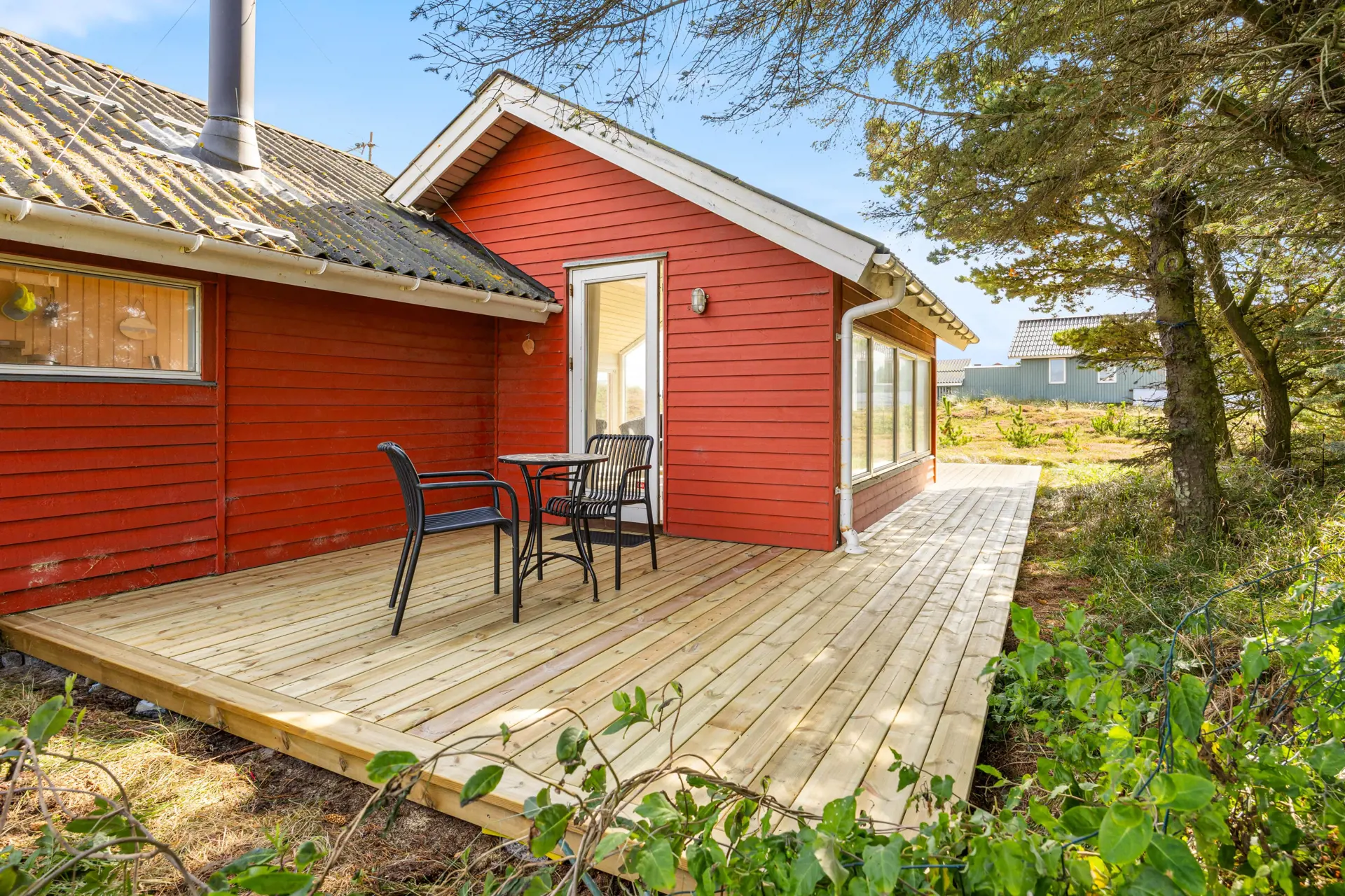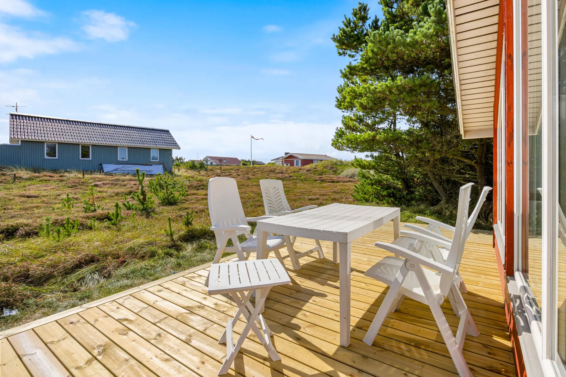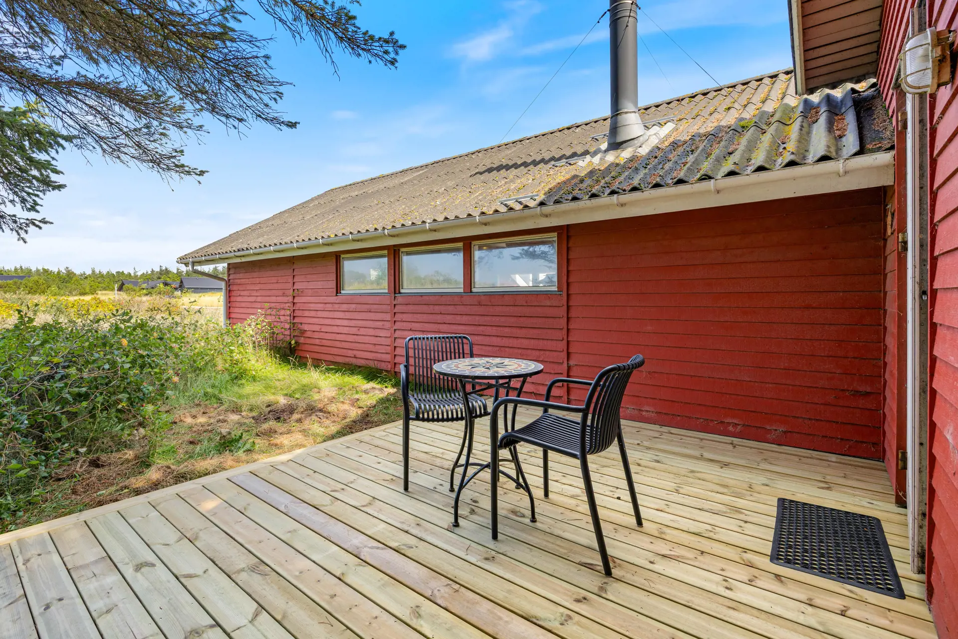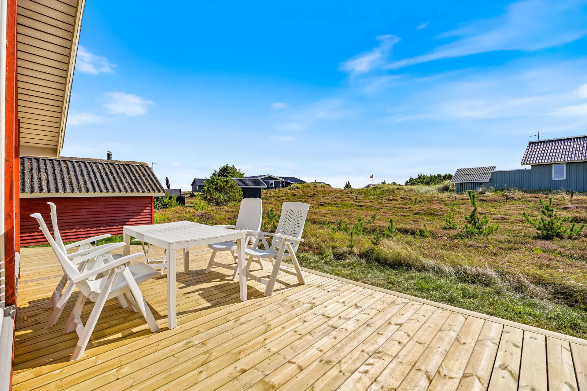 Zum Ferienhaus gehört eine in 2025 neu gebaute offene Terrasse, auf der ihr die frische Nordseeluft genießen könnt. Ob beim Frühstück in der Morgensonne oder nach einem langen Spaziergang – hier habt ihr Raum, um den Tag in Ruhe ausklingen zu lassen. Das Naturgrundstück lädt dazu ein, die Weite Westjütlands zu erleben, während sich euer Hund frei bewegen kann. Mit nur 700 Metern Entfernung zum Strand und 2000 Metern zu den nächsten Einkaufsmöglichkeiten habt ihr alles in Reichweite, was ihr für euren Urlaub benötigt.