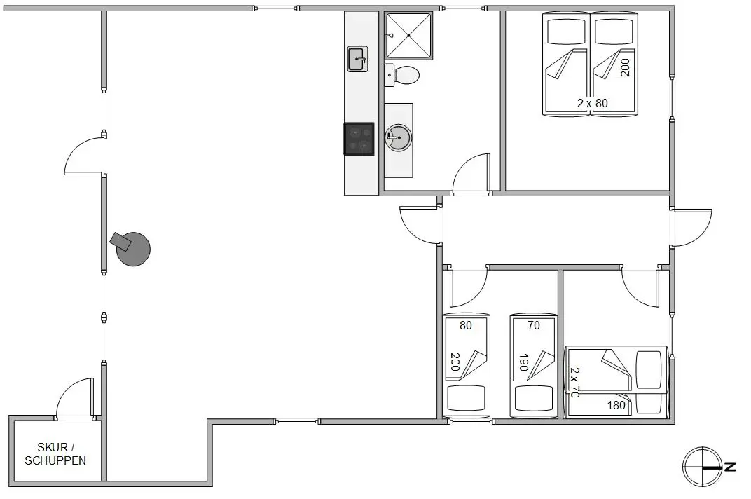 Das Ferienhaus verfügt über drei Schlafzimmer: Zwei Zimmer sind mit jeweils zwei Einzelbetten ausgestattet, während im dritten ein Etagenbett Platz für Kinder oder Einzelreisende bietet. Bitte beachten, dass Die beiden Einzelbetten unterscheiden sich leicht in der Länge – eines misst 190 cm, das andere 200 cm und dass die Matratzen im Etagenbett eine Größe von 70 x 180 cm haben.