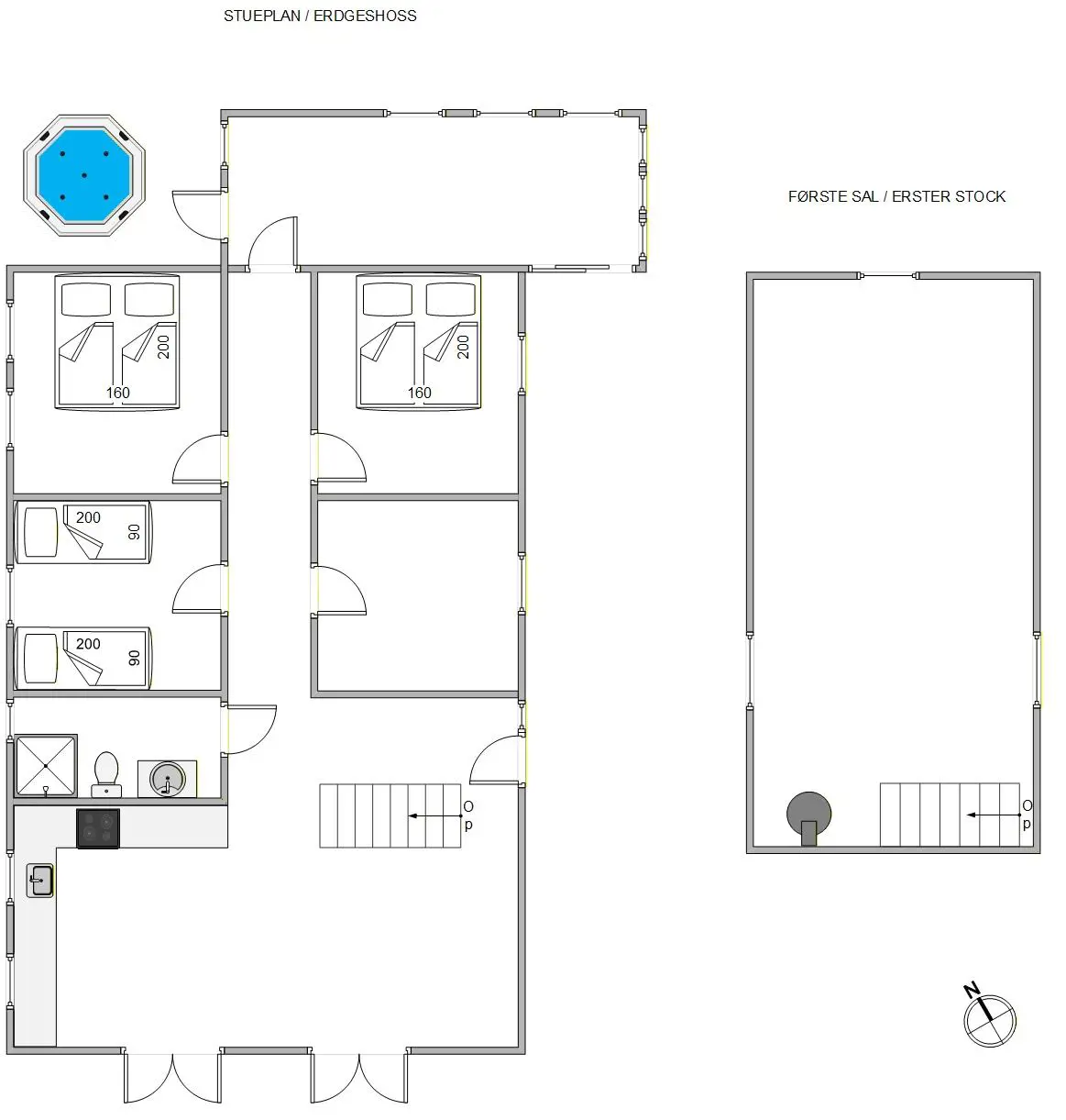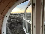 Von der Wohnküche aus könnt ihr bis unter den offenen Dachfirst in das Wohnzimmer im 1. Obergeschoss blicken, das über eine freistehende Treppe erreichbar ist. Quer verlaufende Balken in einer Höhe von ca. 185 cm verleihen dem Raum Charakter und gemütliche Details, ohne die Großzügigkeit einzuschränken. Von den Fenstern im Obergeschoss habt ihr einen herrlichen Blick über die Dünenlandschaft nach Westen und Norden sowie auf den Ringkøbing Fjord im Osten.