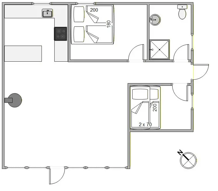 Im Inneren erwartet euch eine übersichtliche Raumaufteilung auf 55 m2. Für die Nacht stehen euch 2 Schlafzimmer zur Verfügung, sodass ihr eure Schlafplätze unkompliziert verteilen könnt. In einem Schlafzimmer schlaft ihr in einem Doppelbett, im zweiten findet ihr ein Etagenbett – eine passende Lösung, wenn ihr mit Kindern anreist oder einfach getrennte Schlafmöglichkeiten nutzen möchtet.