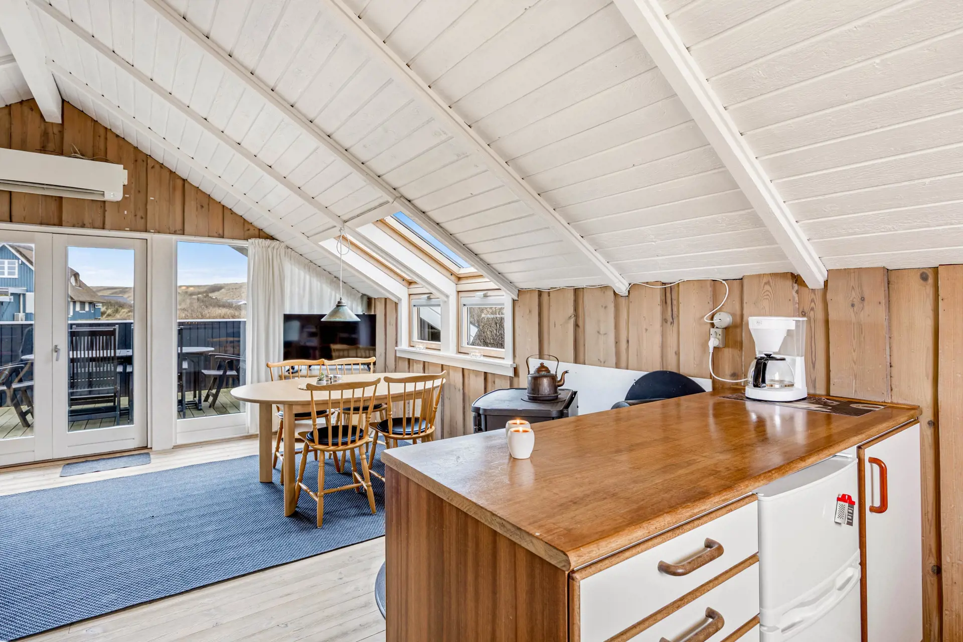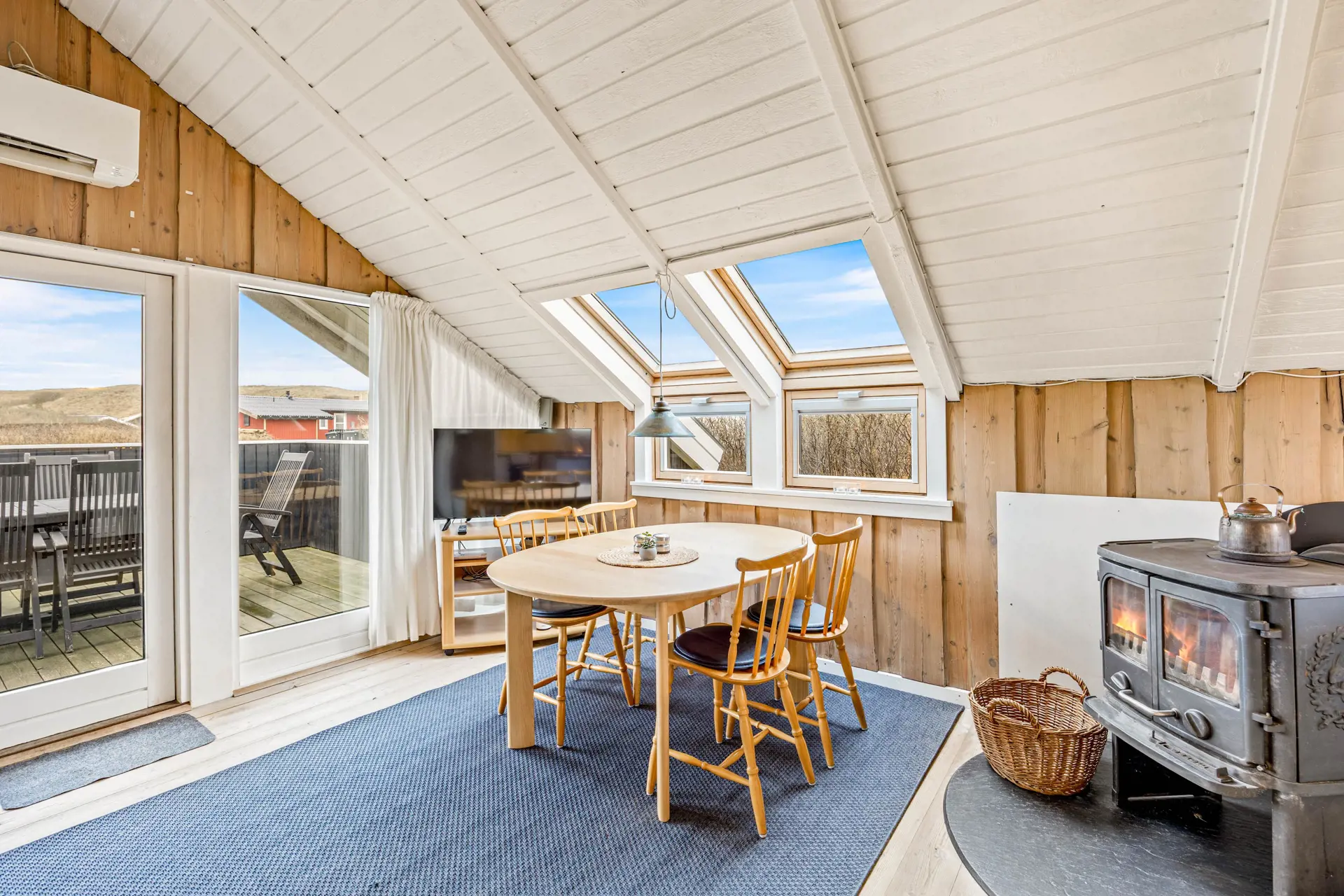 Der Wohnbereich ist so gestaltet, dass ihr euch dort gemeinsam aufhalten könnt, ohne dass es eng wird. An kühleren Tagen könnt ihr den Kaminofen anmachen und den Abend drinnen verbringen, zum Beispiel nach einem Spaziergang an der Küste. Zusätzlich gibt es eine Wärmepumpe, die euch hilft, die Temperatur gleichmäßig zu halten.
